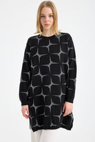 Sıfır Yaka Geometrik Simli Tunik Triko Kazak - Siyah