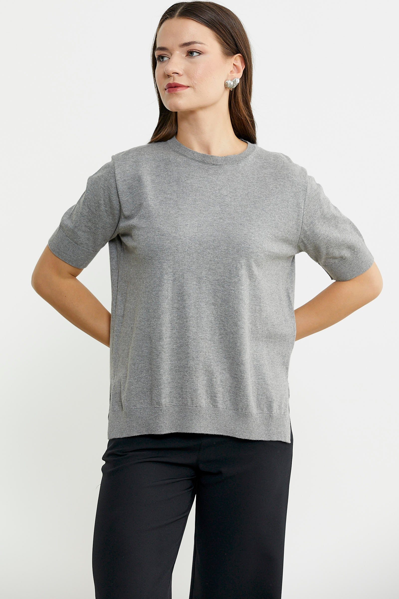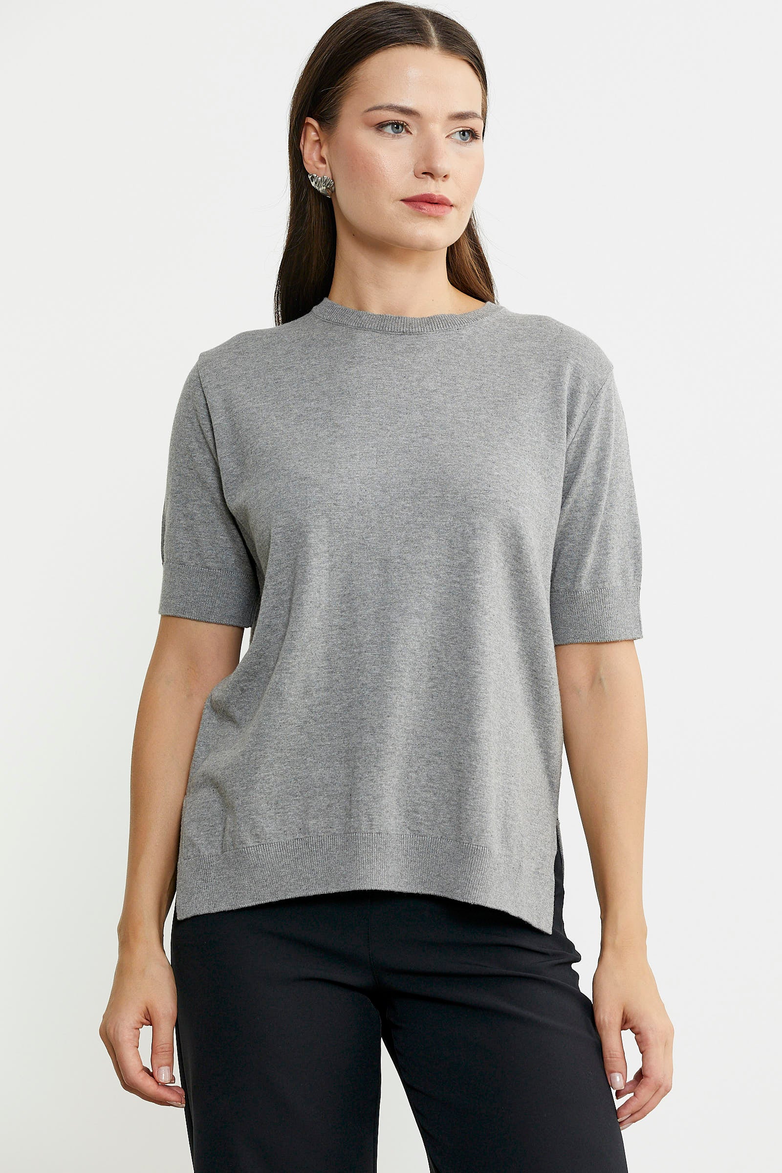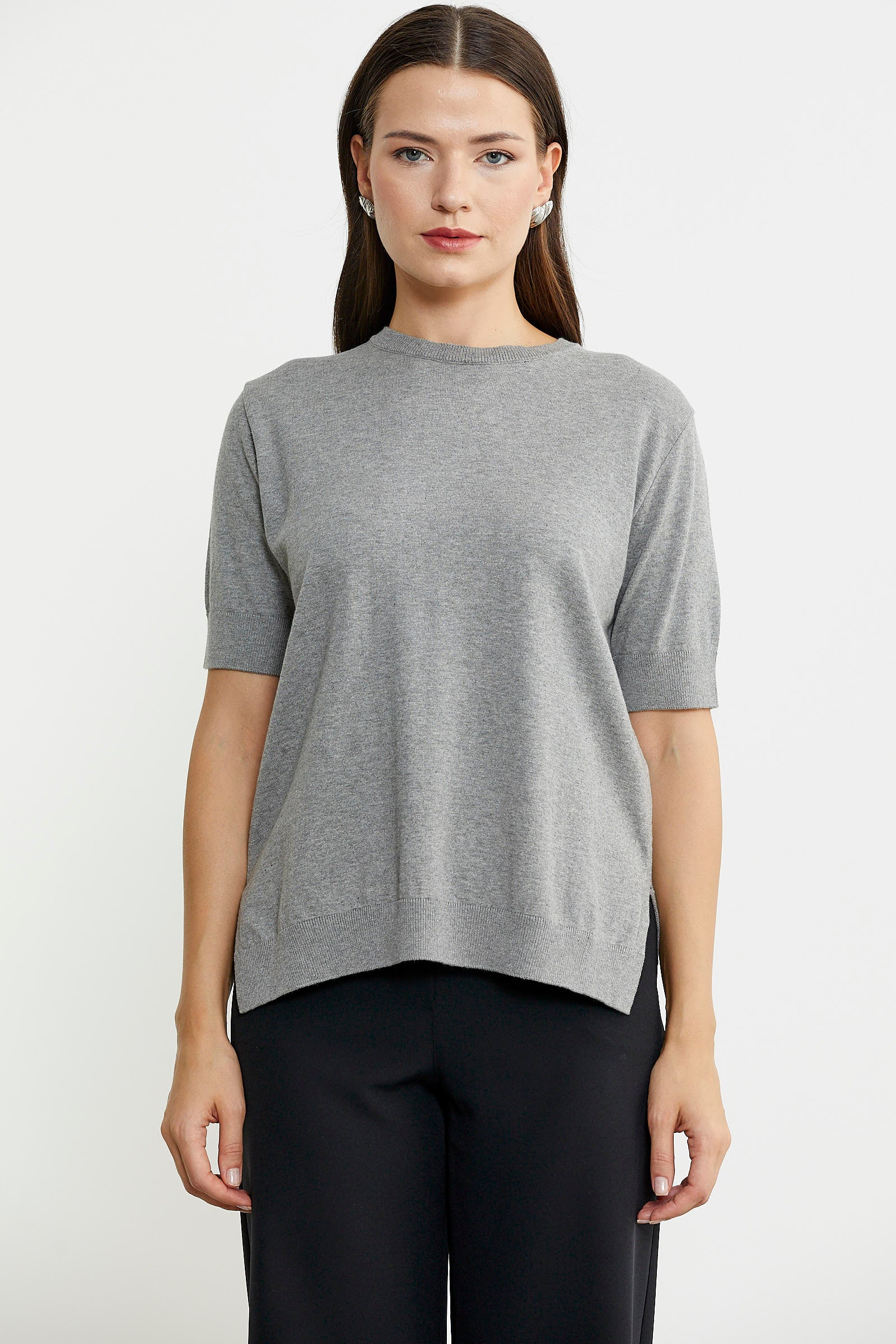 Sıfır Yaka Kısa Kol Triko Kazak - Açık Gri