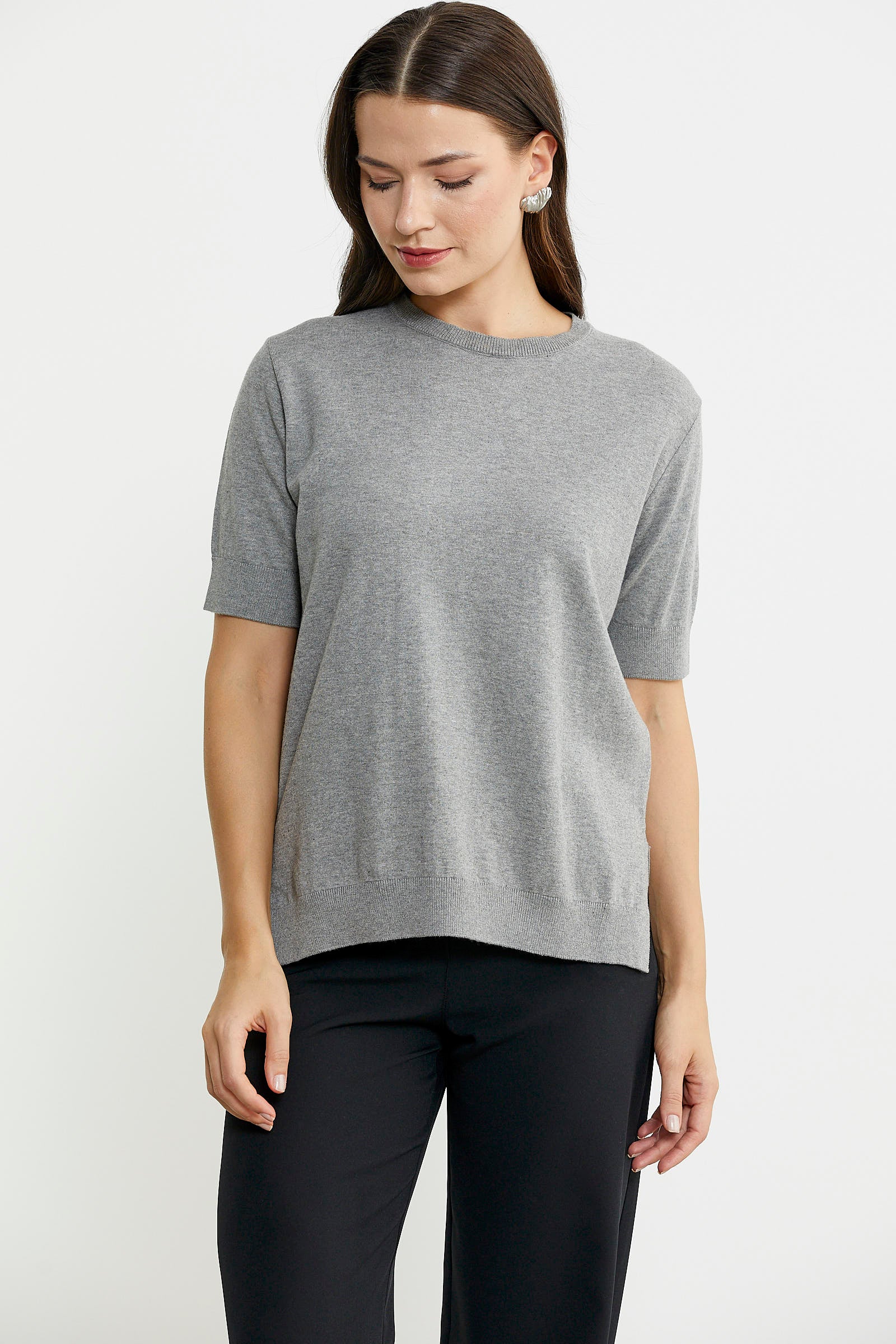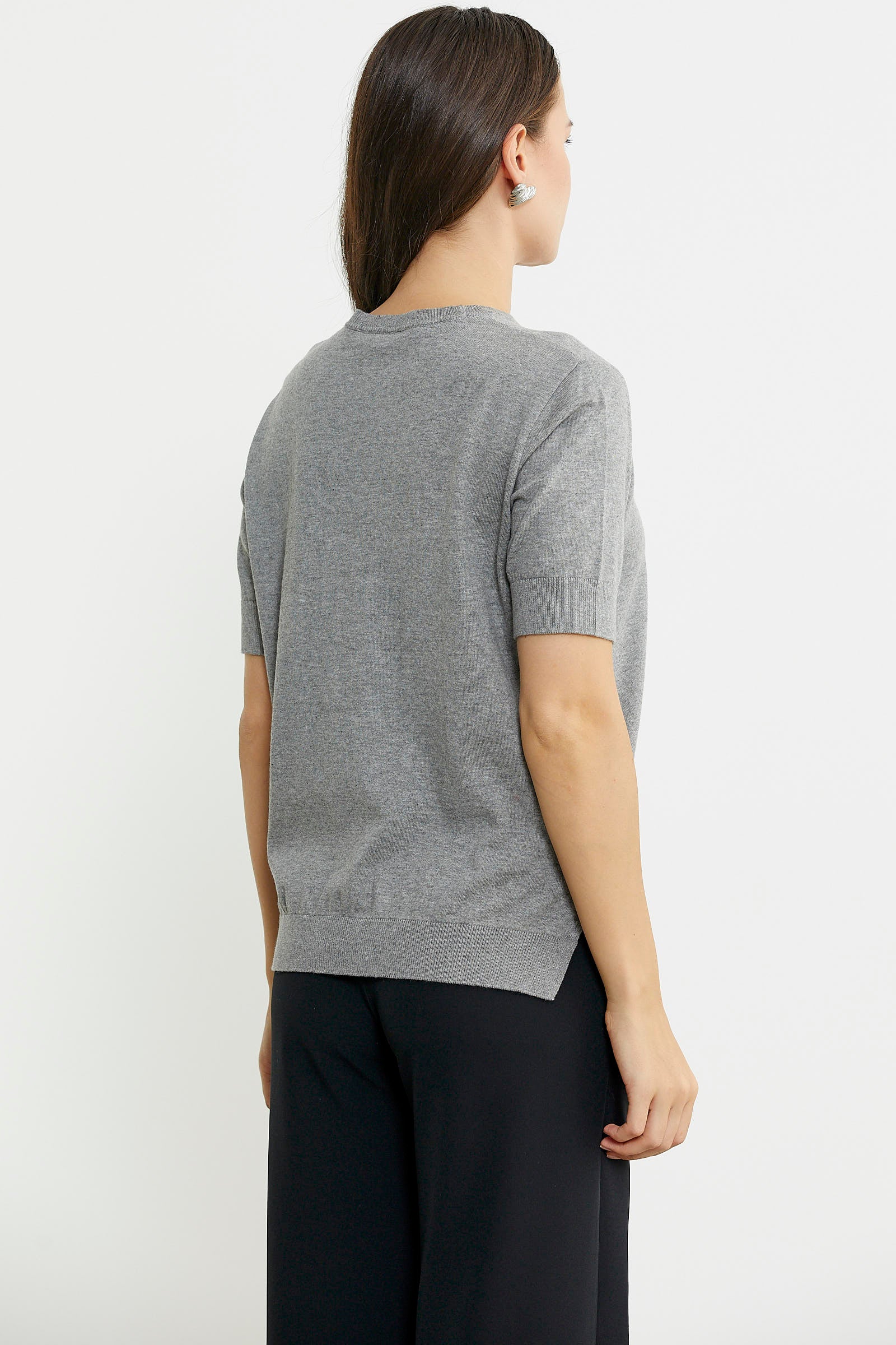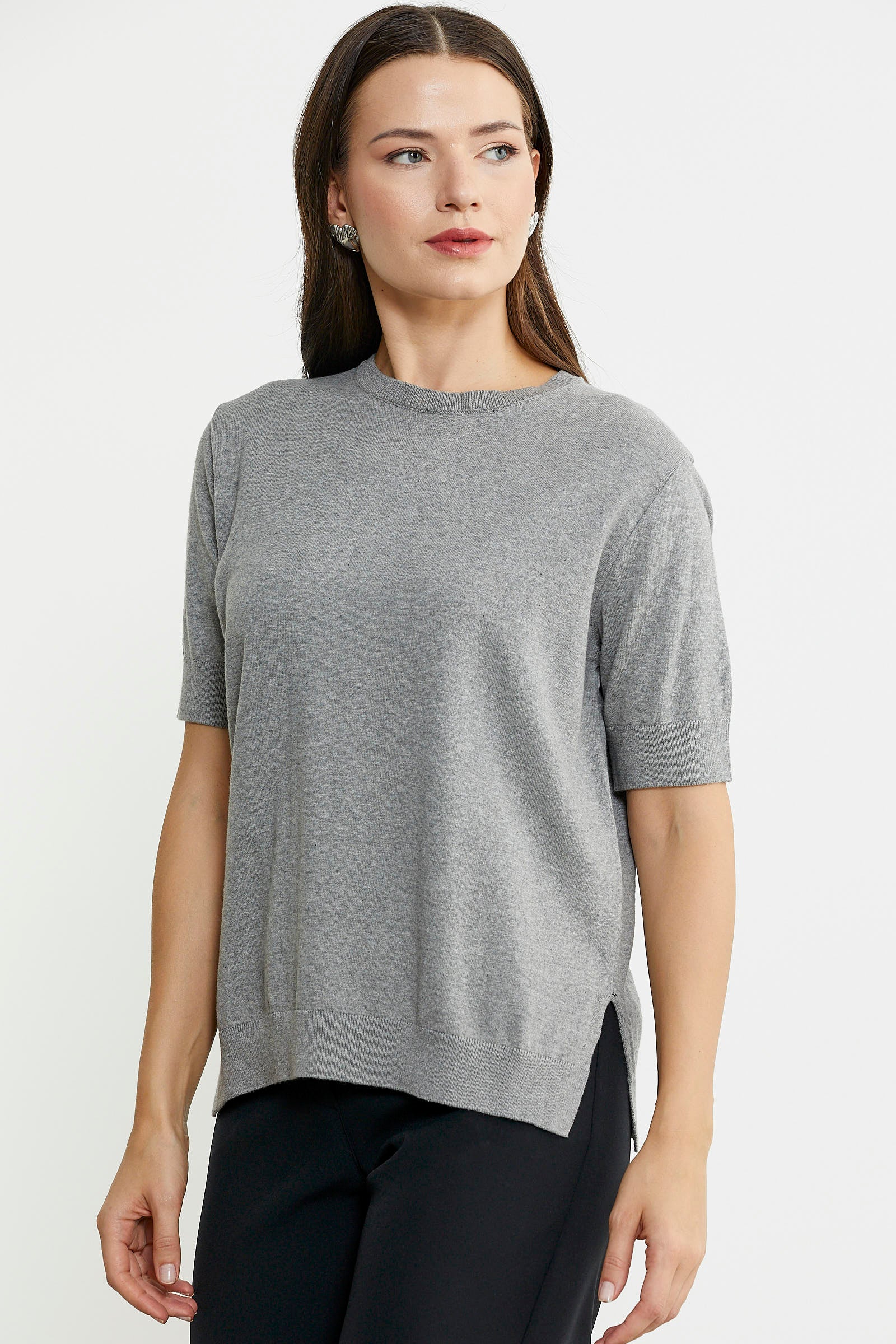 Sıfır Yaka Kısa Kol Triko Kazak - Açık Gri