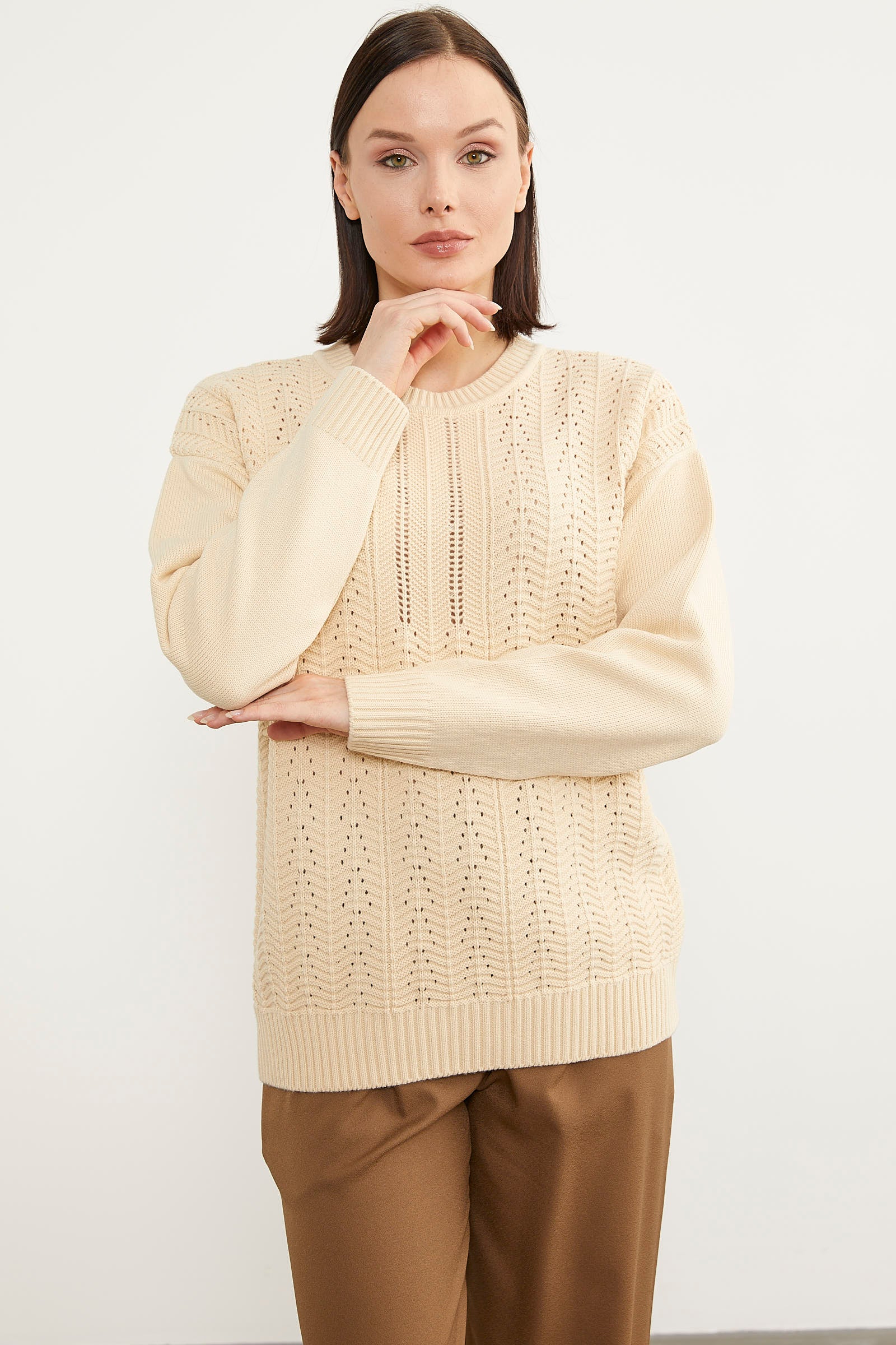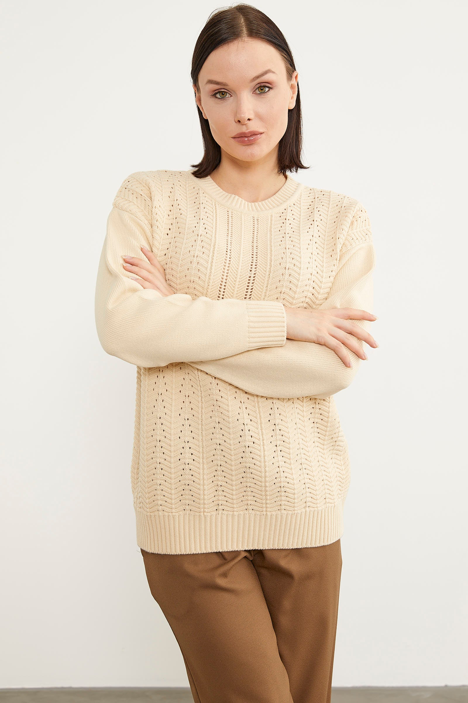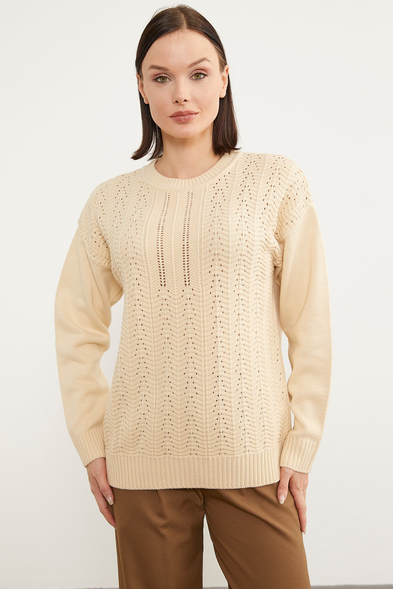 Önününde bulunan zik zak ve delik motif desenleri ile ince bir görünüm sunan sıfır yaka triko kazak size rahatlığın kapılarını açıyor. Yumuşak dokusu sayesinde iyi hissederken çoklu renk seçenekleri ile kombin kolaylığı sağlamaktadır.