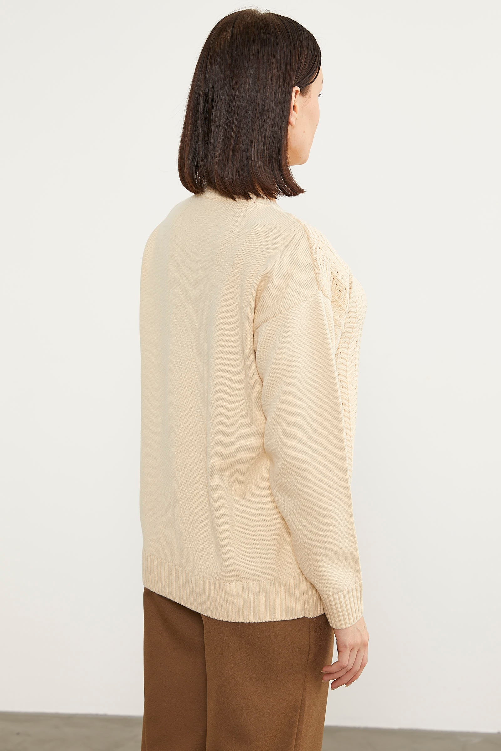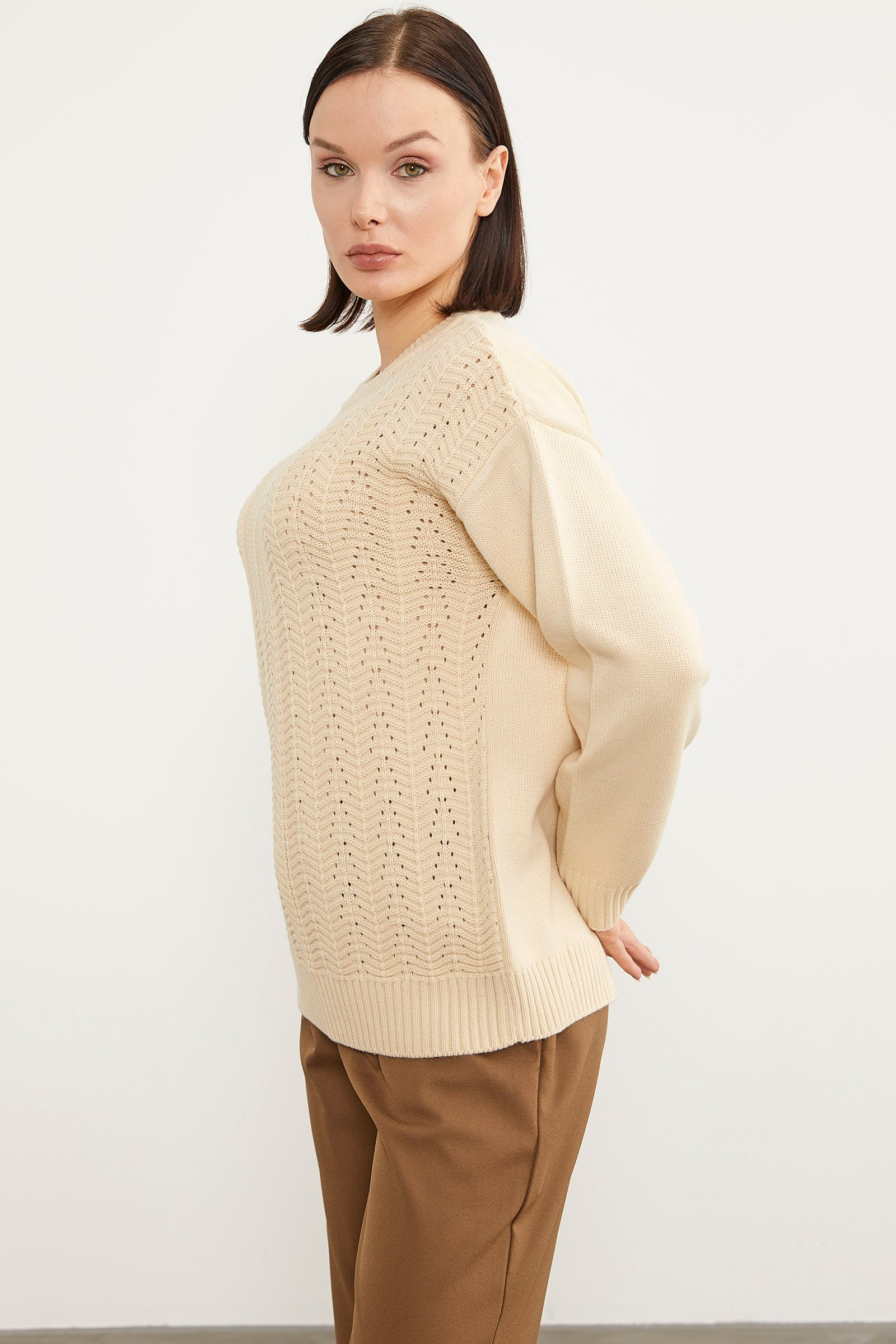 Sıfır Yaka Zik Zak Motifli Triko Kazak - Kemik