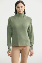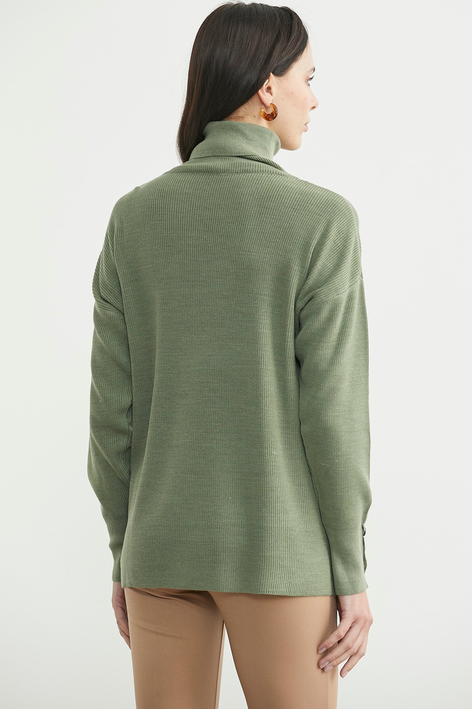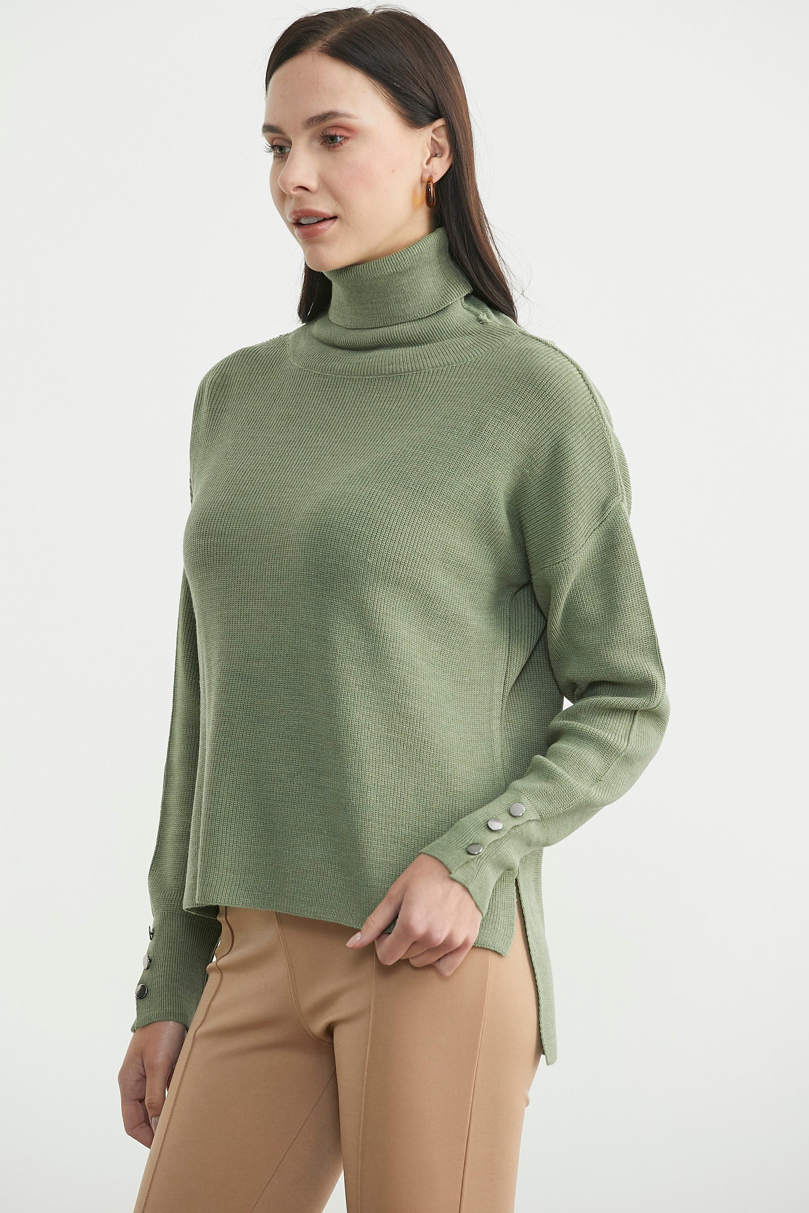 Balıkçı yaka, fitilli örgü, manşette metal düğme detayları olan basic triko kazak.