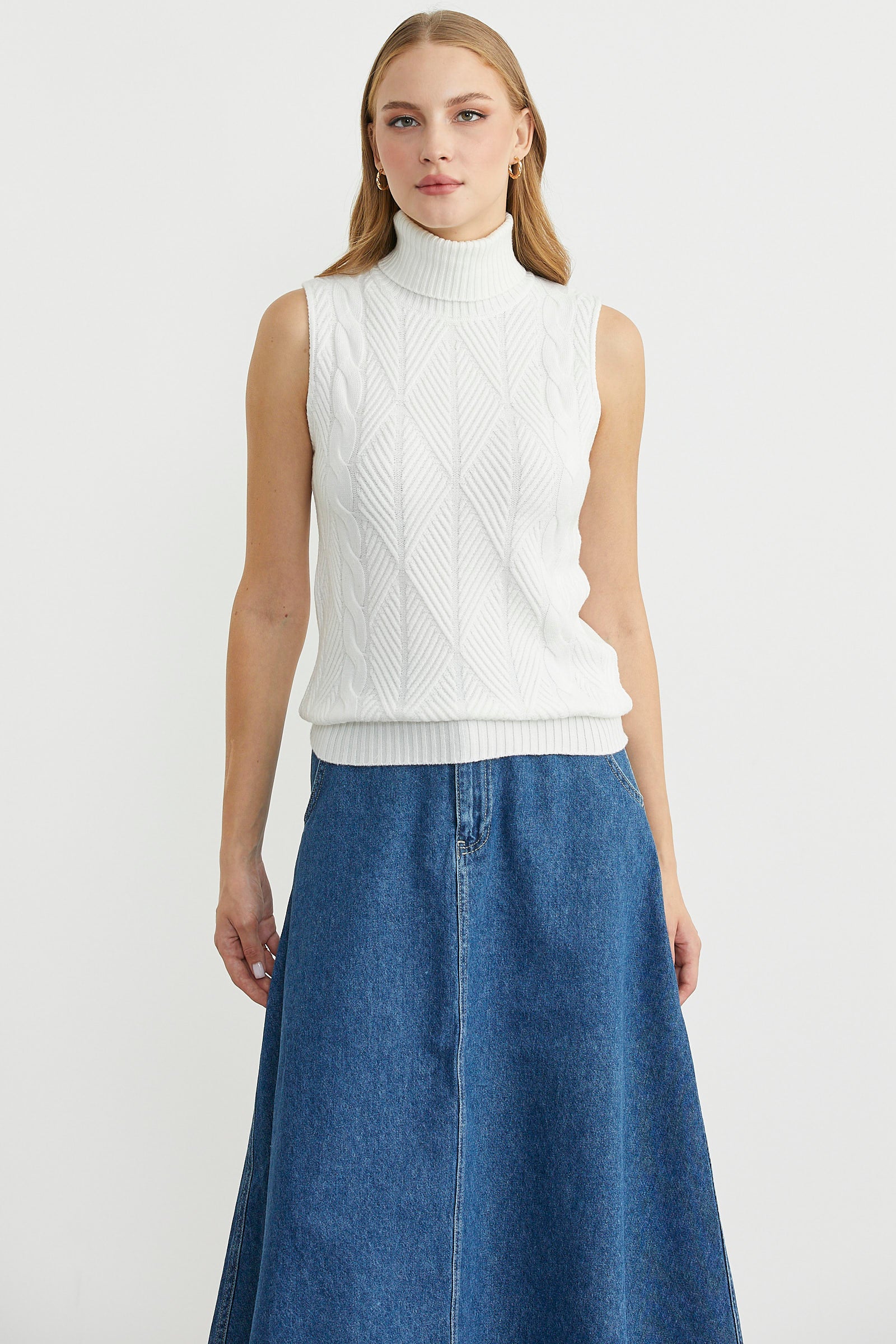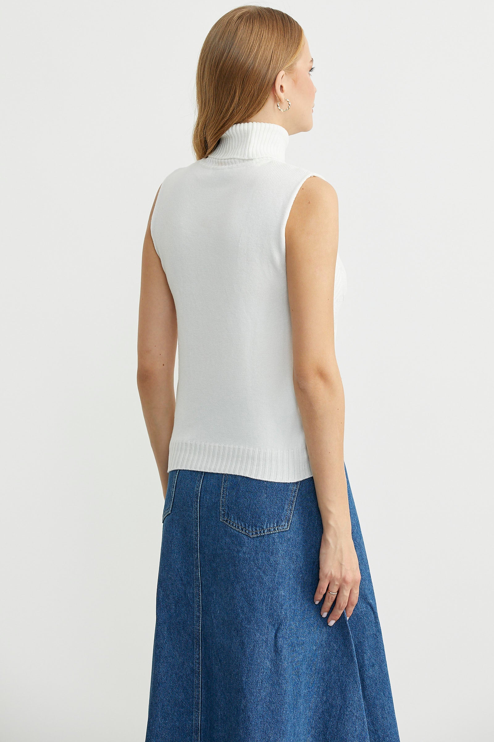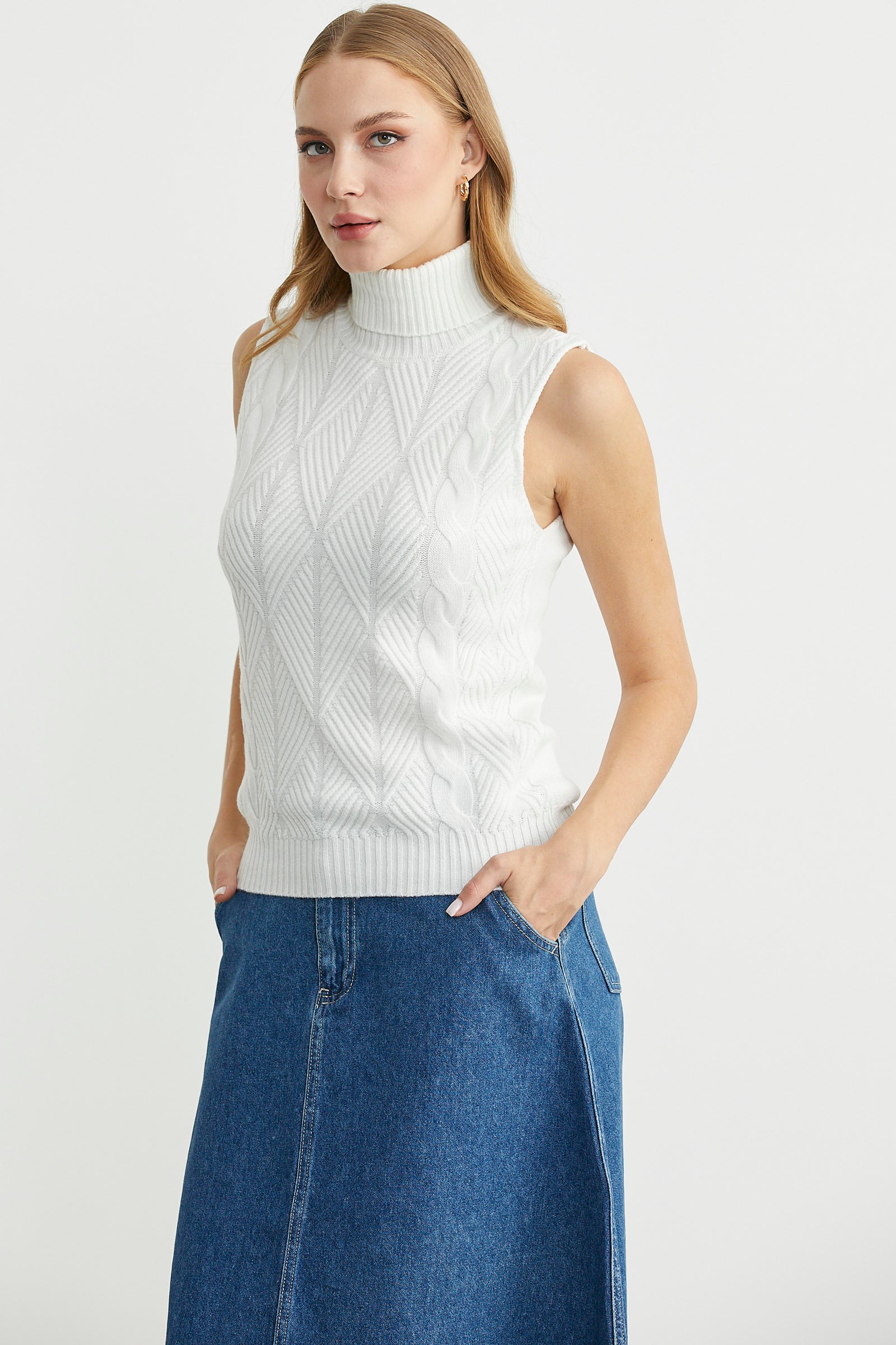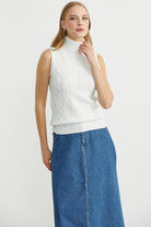 Tam Balıkçı Kolsuz Triko Kazak - Kemik