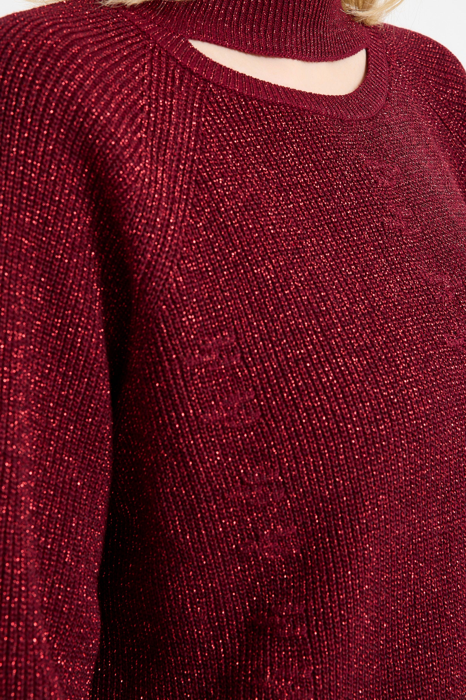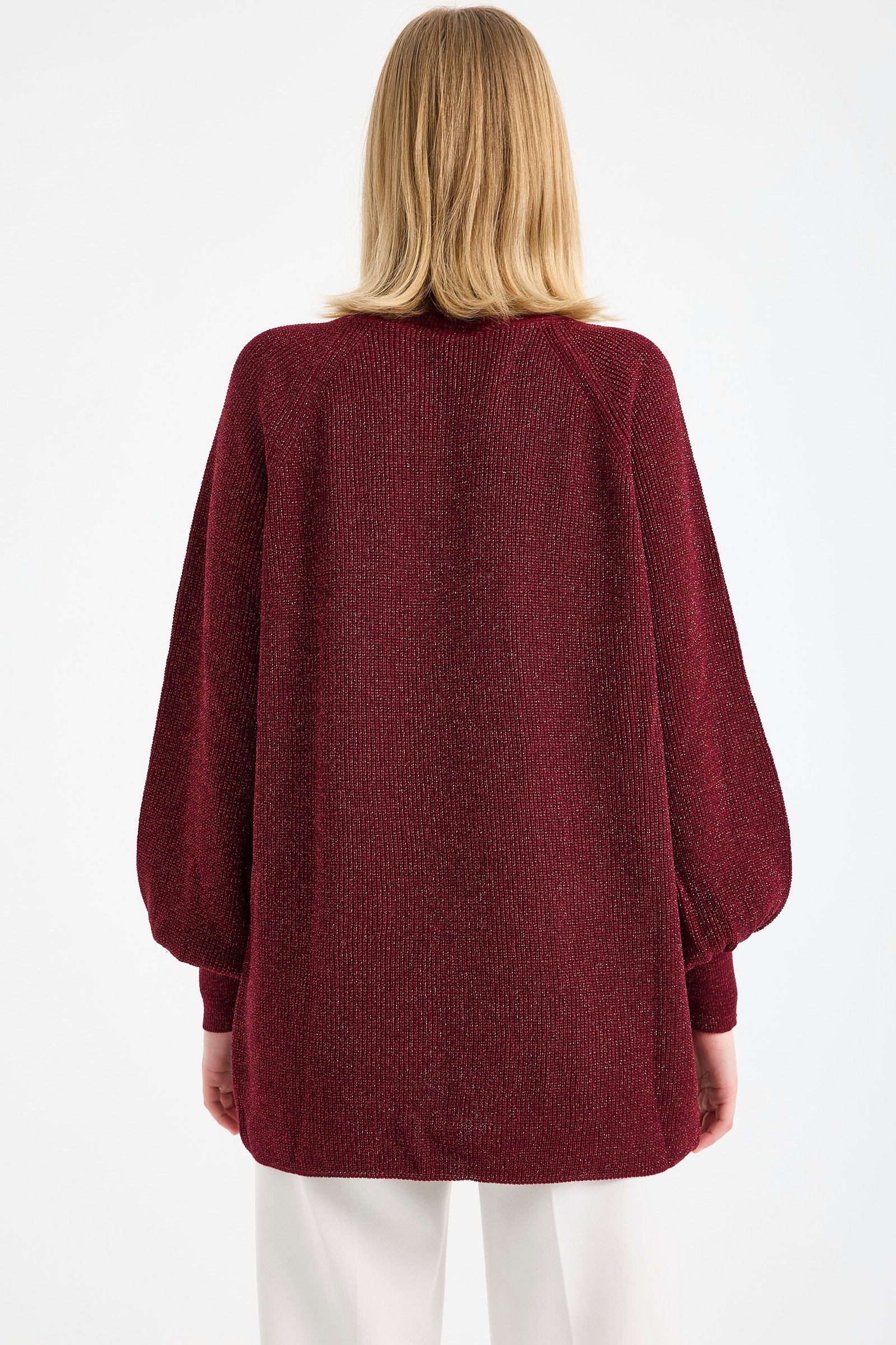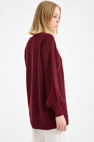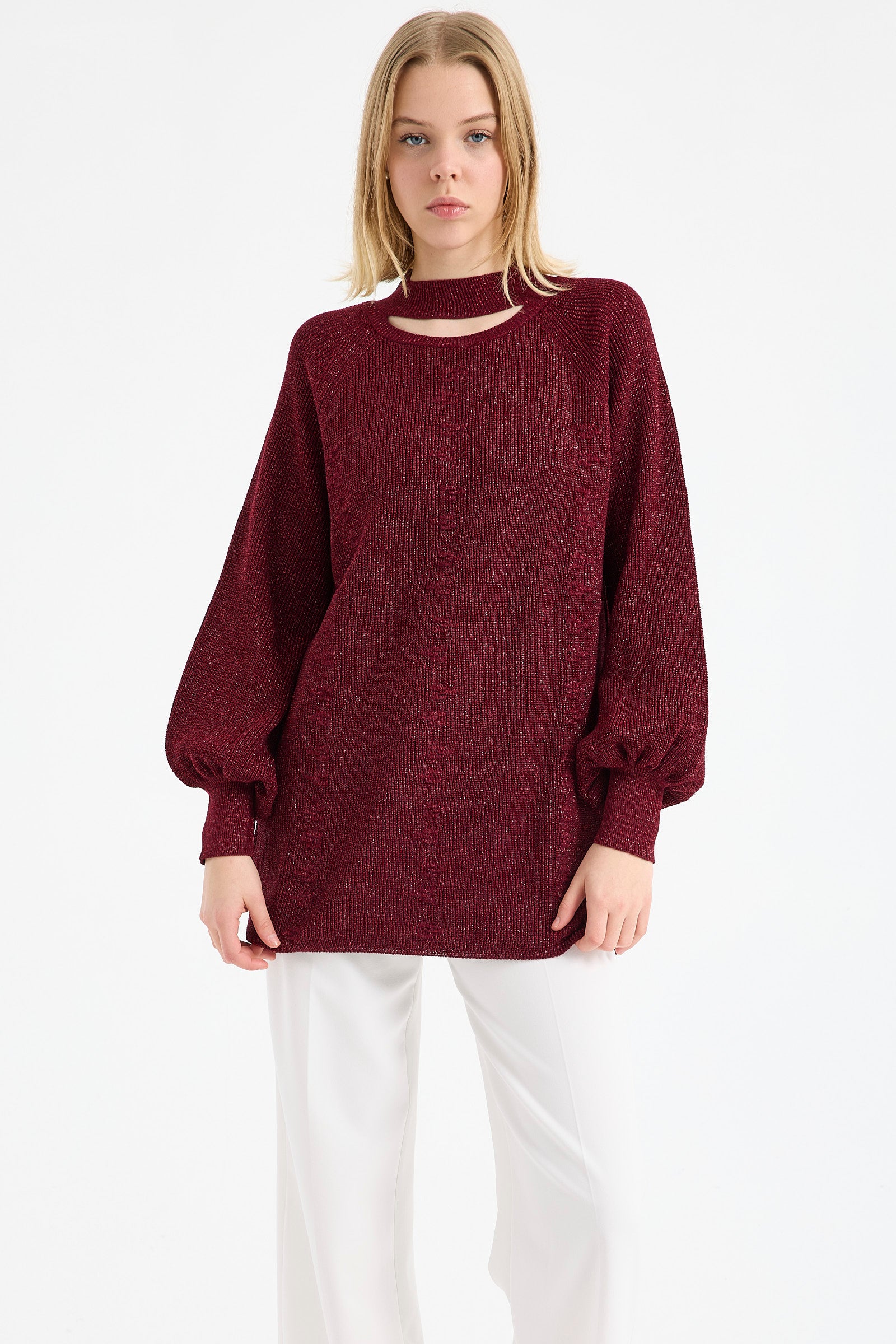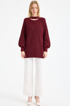 Yaka Detaylı Işıltılı Tunik Triko Kazak - Bordo