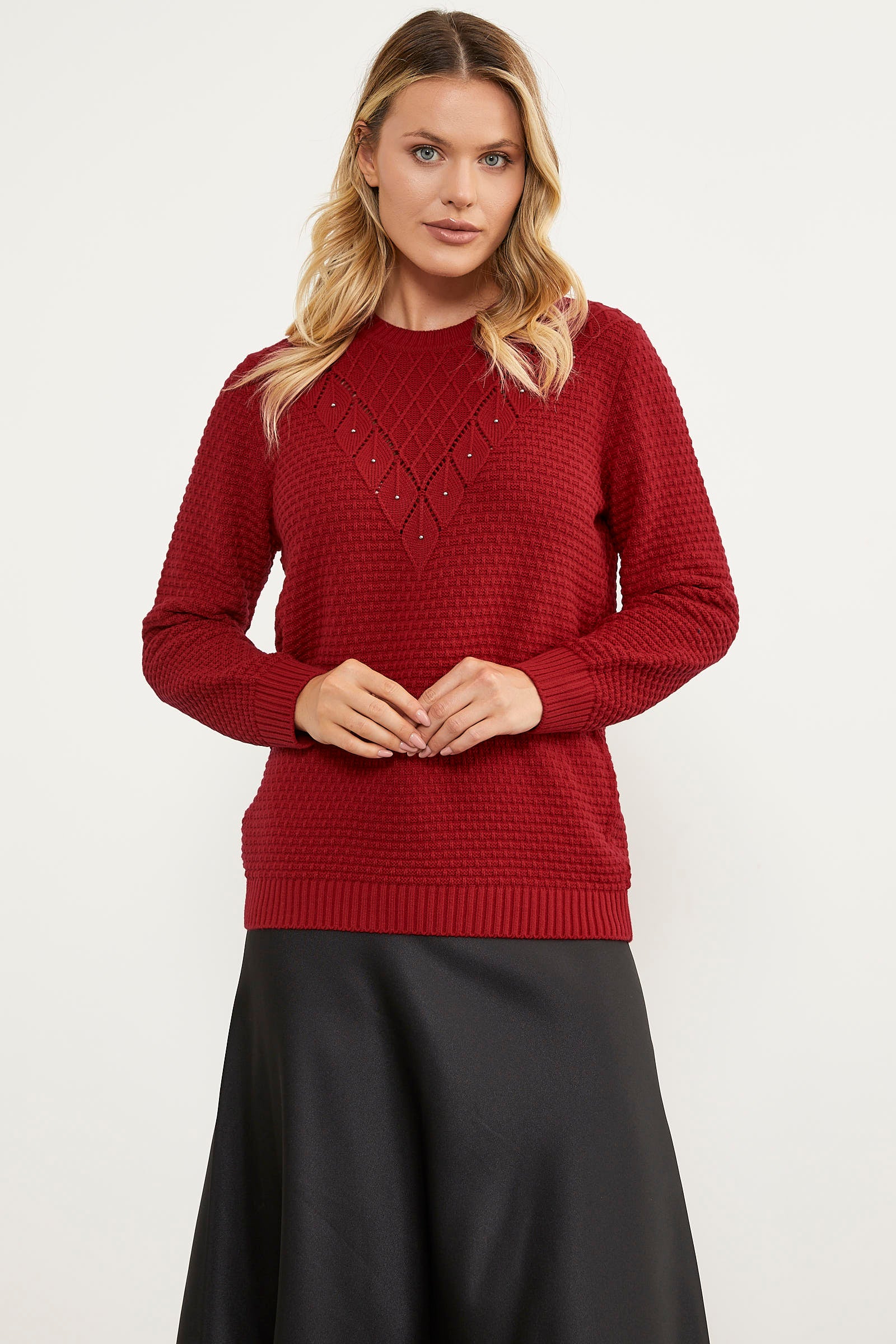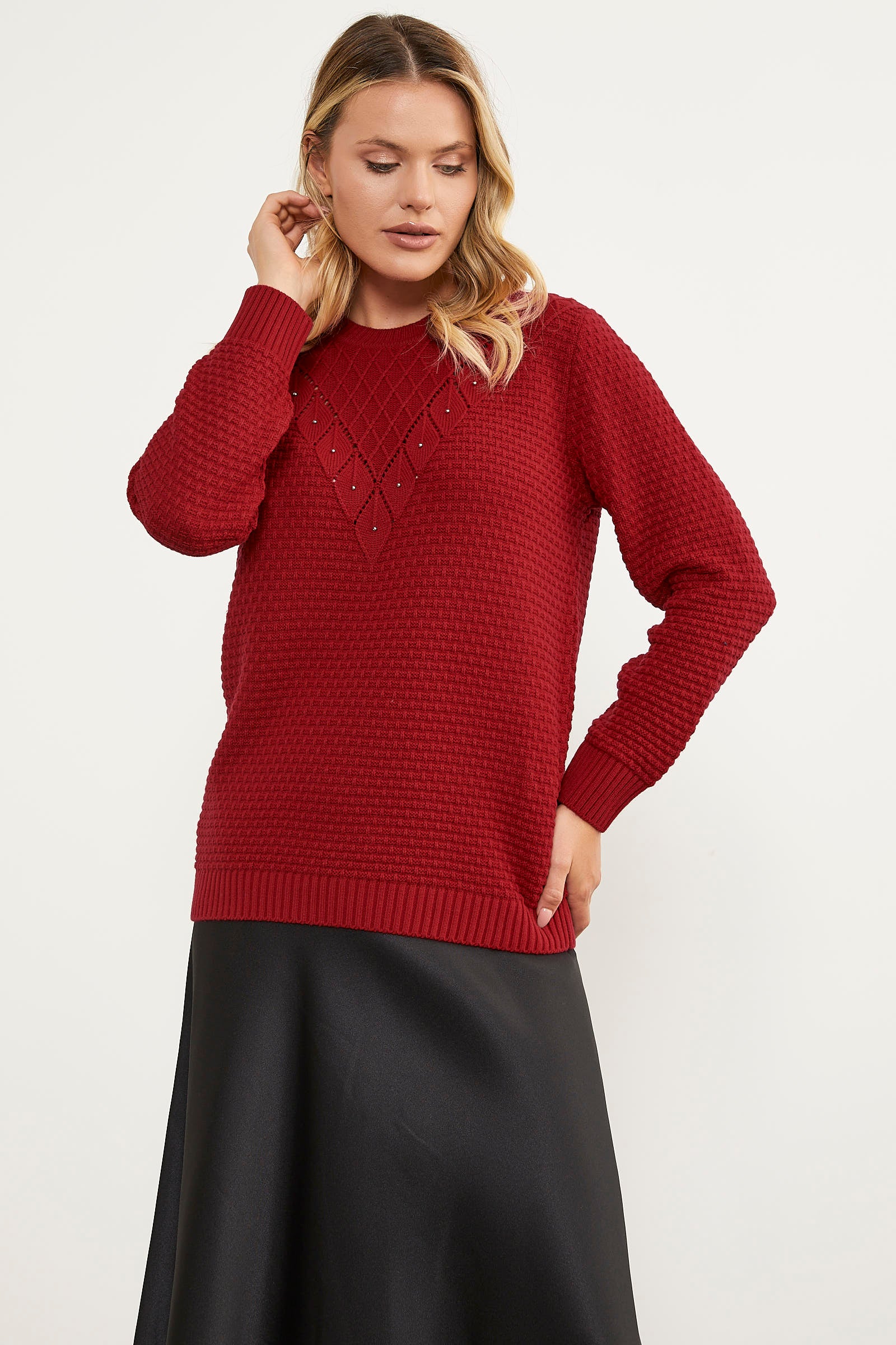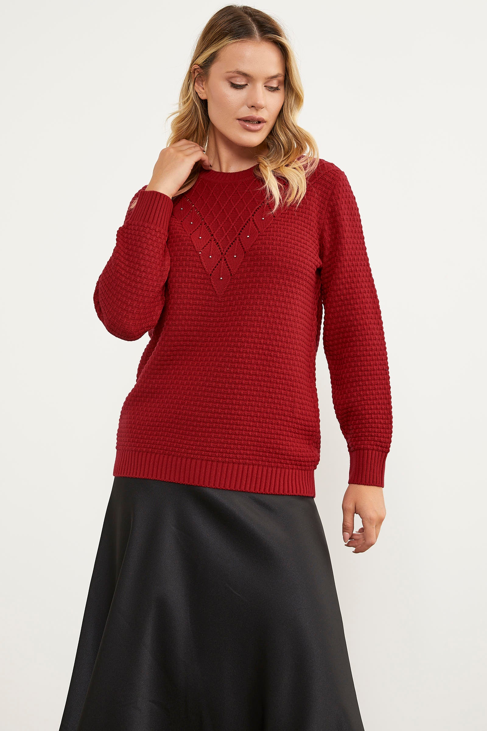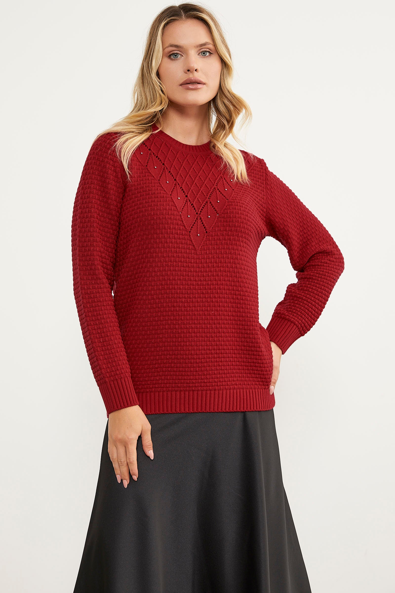 Yaprak Motif Petek Örgü Triko Kazak - Kırmızı