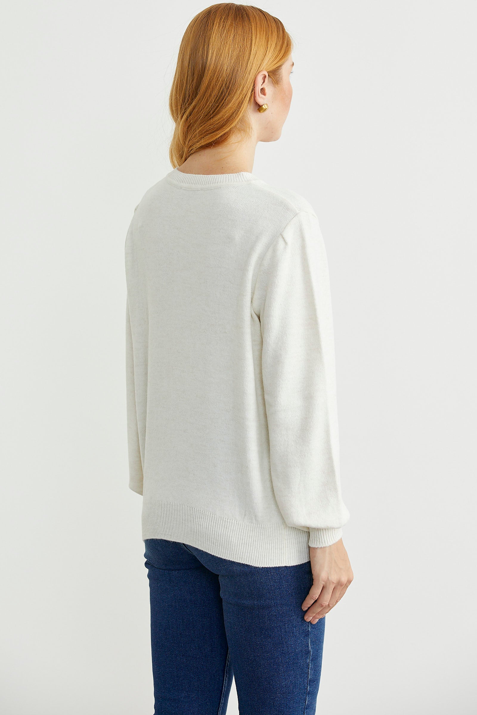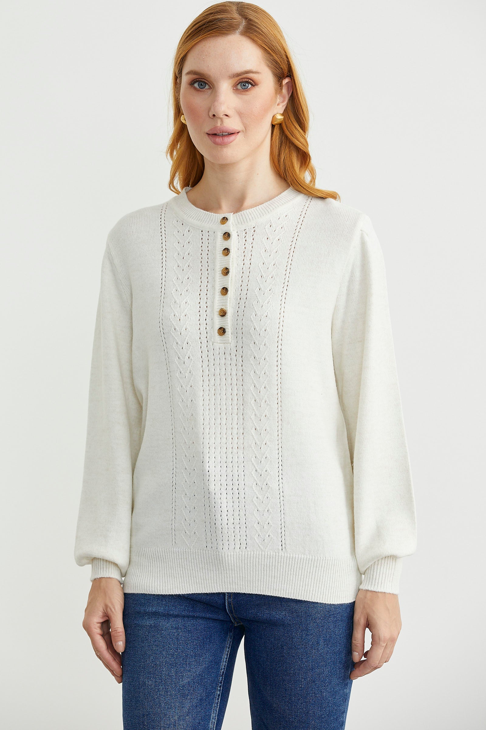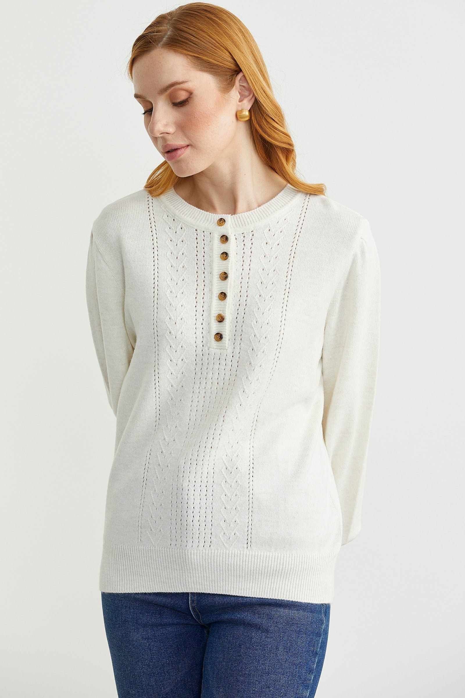 Yarım Düğmeli Yuvarlak Yaka Triko Kazak - Kemik
