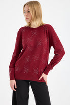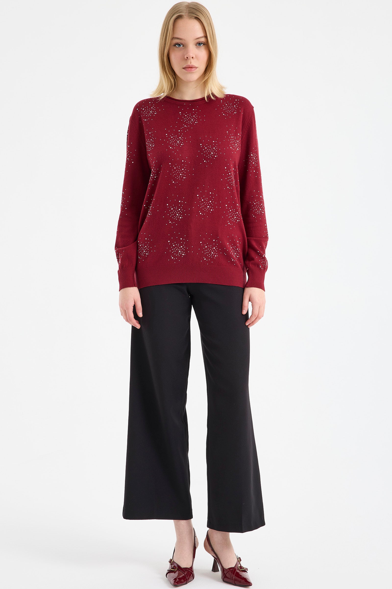 Yuvarlak Yaka Taşlı Triko Kazak - Bordo