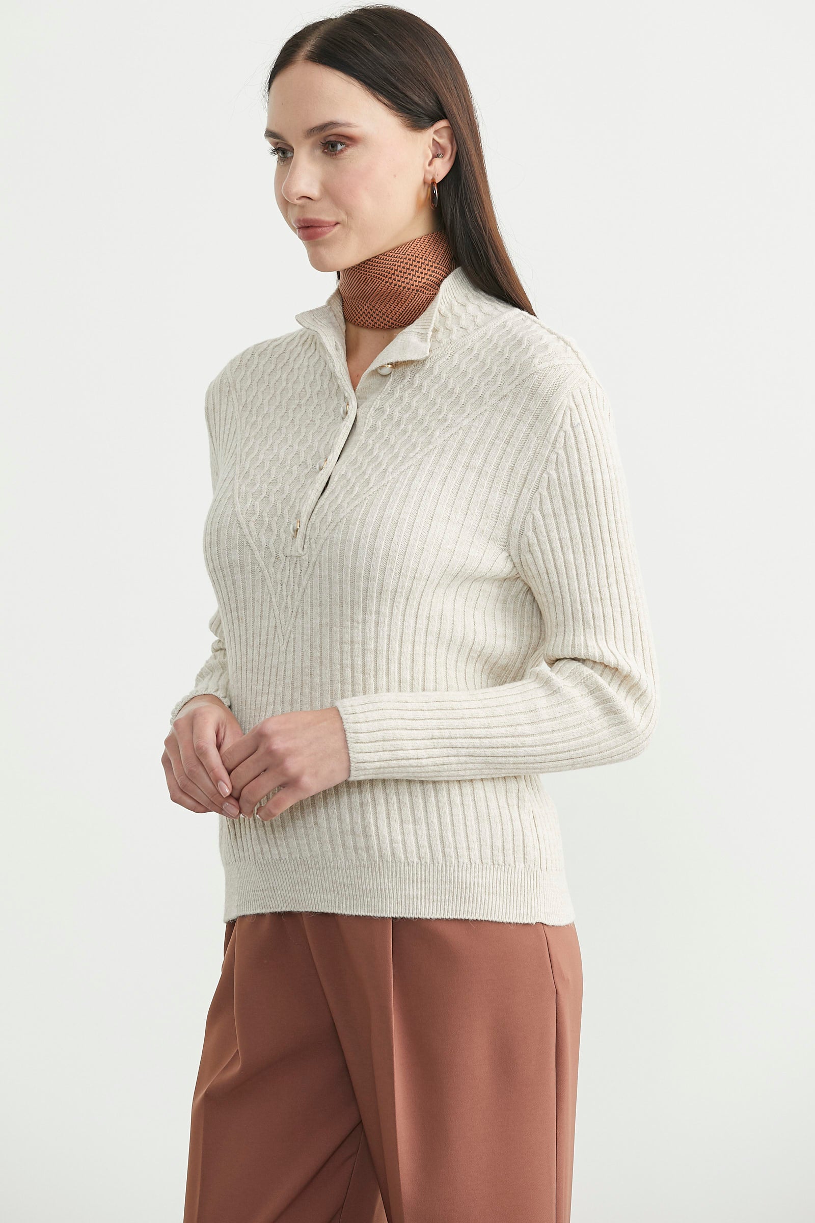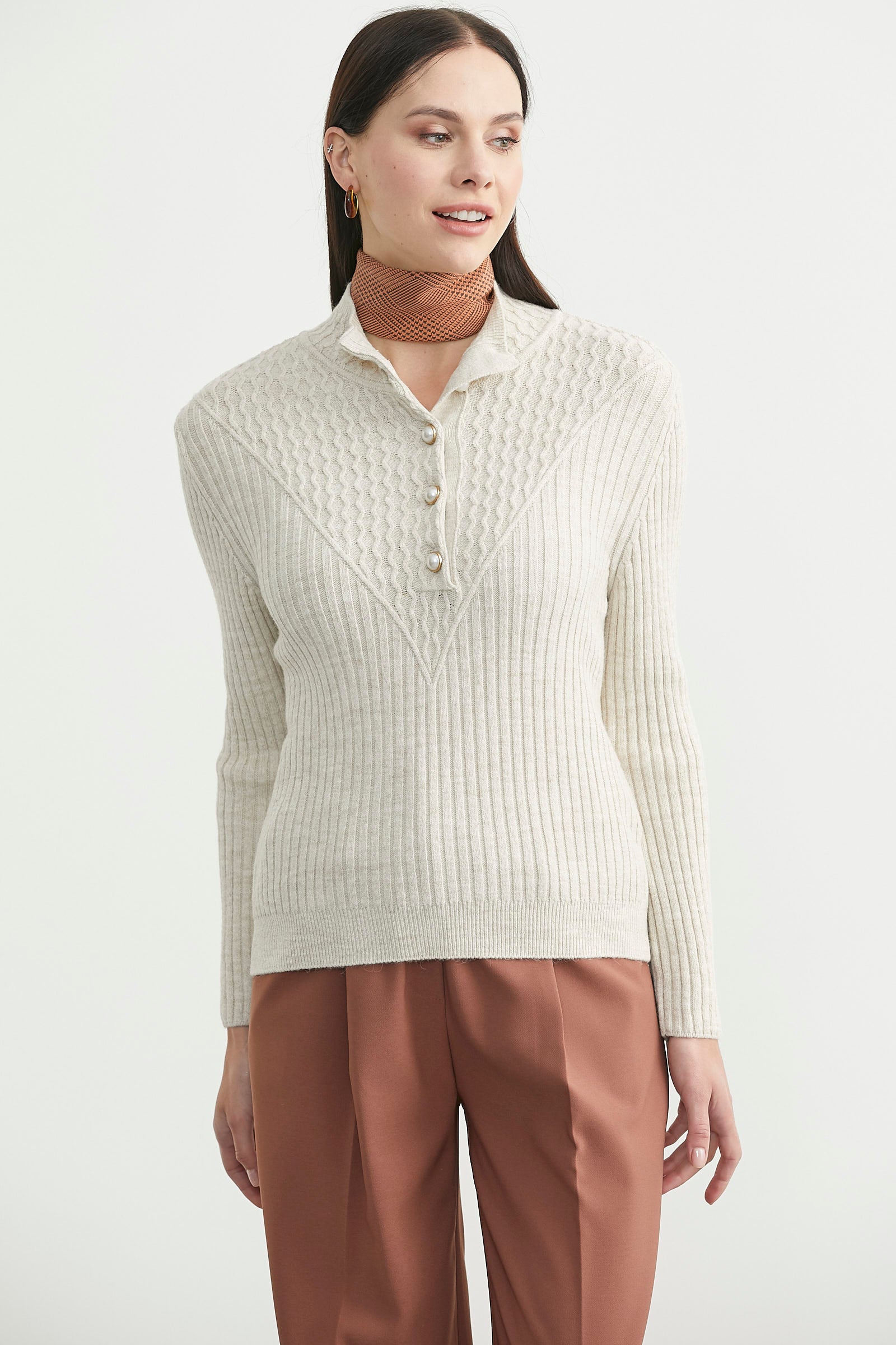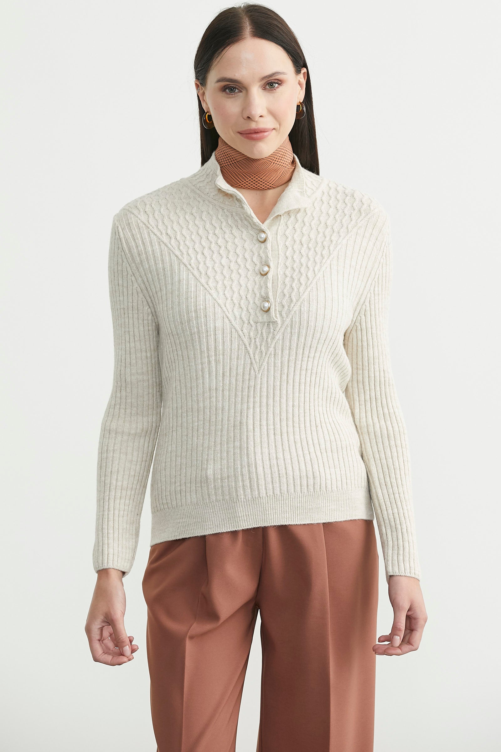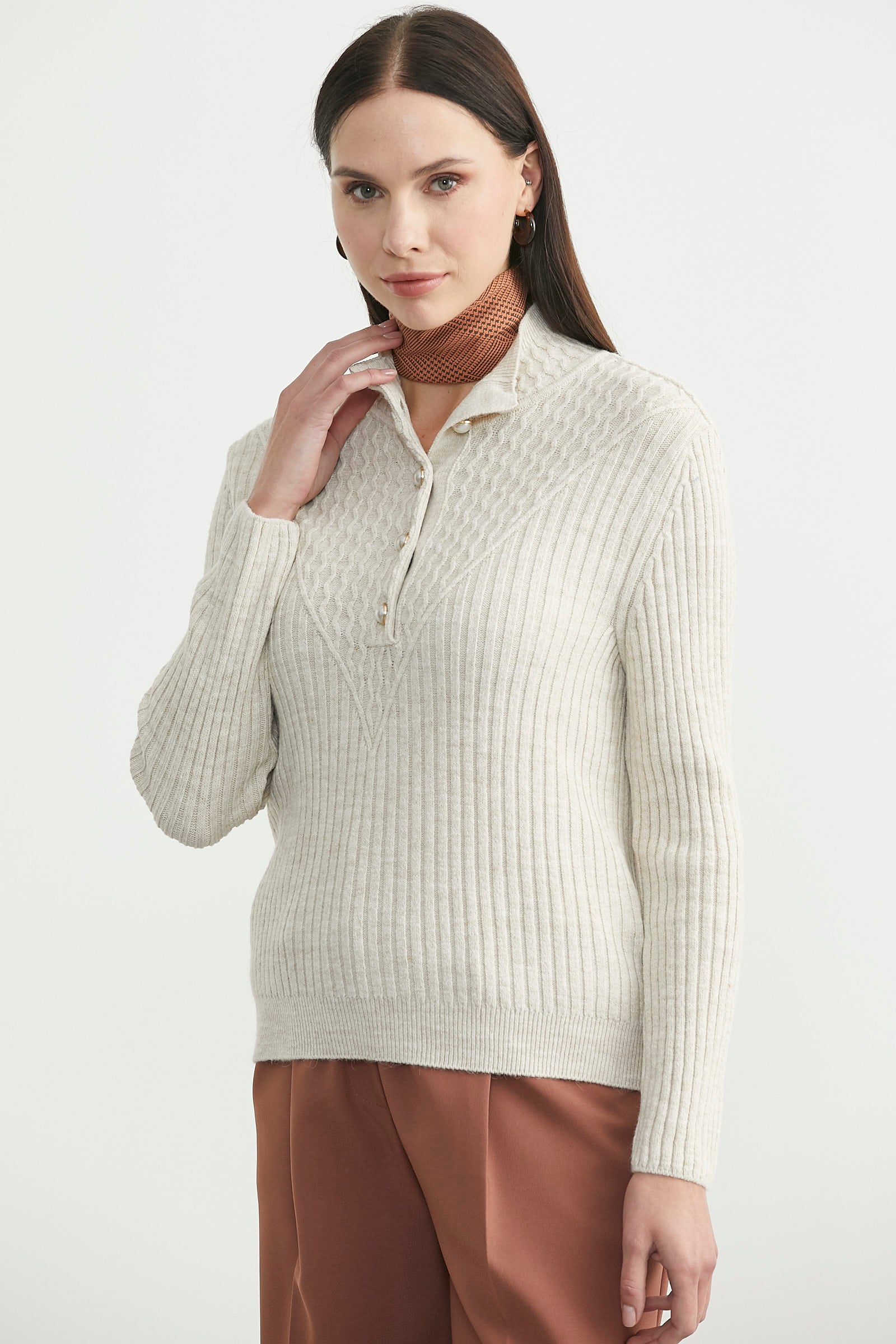 Bej rengi kuzu desenli polo yaka kazak da, kadın triko kazak ürünleri arasında adeta bir inci gibi parlıyor. Özellikle kış aylarında hayvan desenli kazakların sık tercih edildiği biliniyor. Bu desenler, sıcak, samimi ve sevimli bir hava oluşturduklarından çok beğeniliyor.