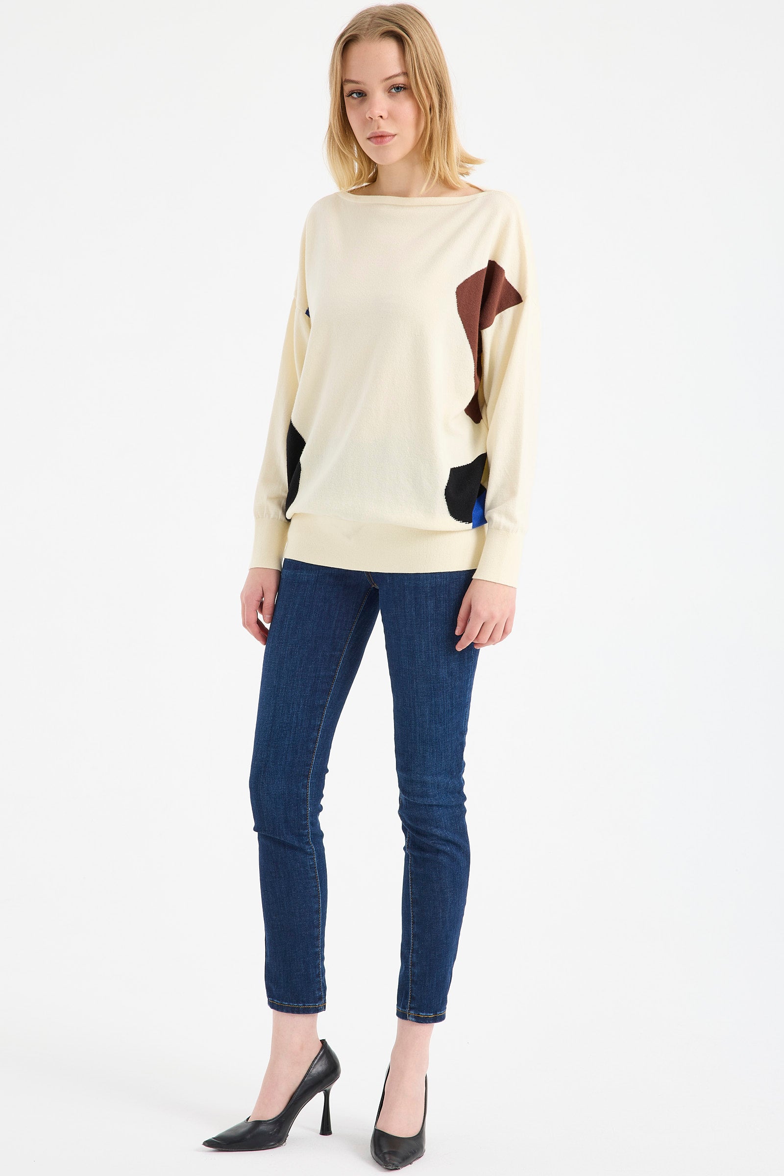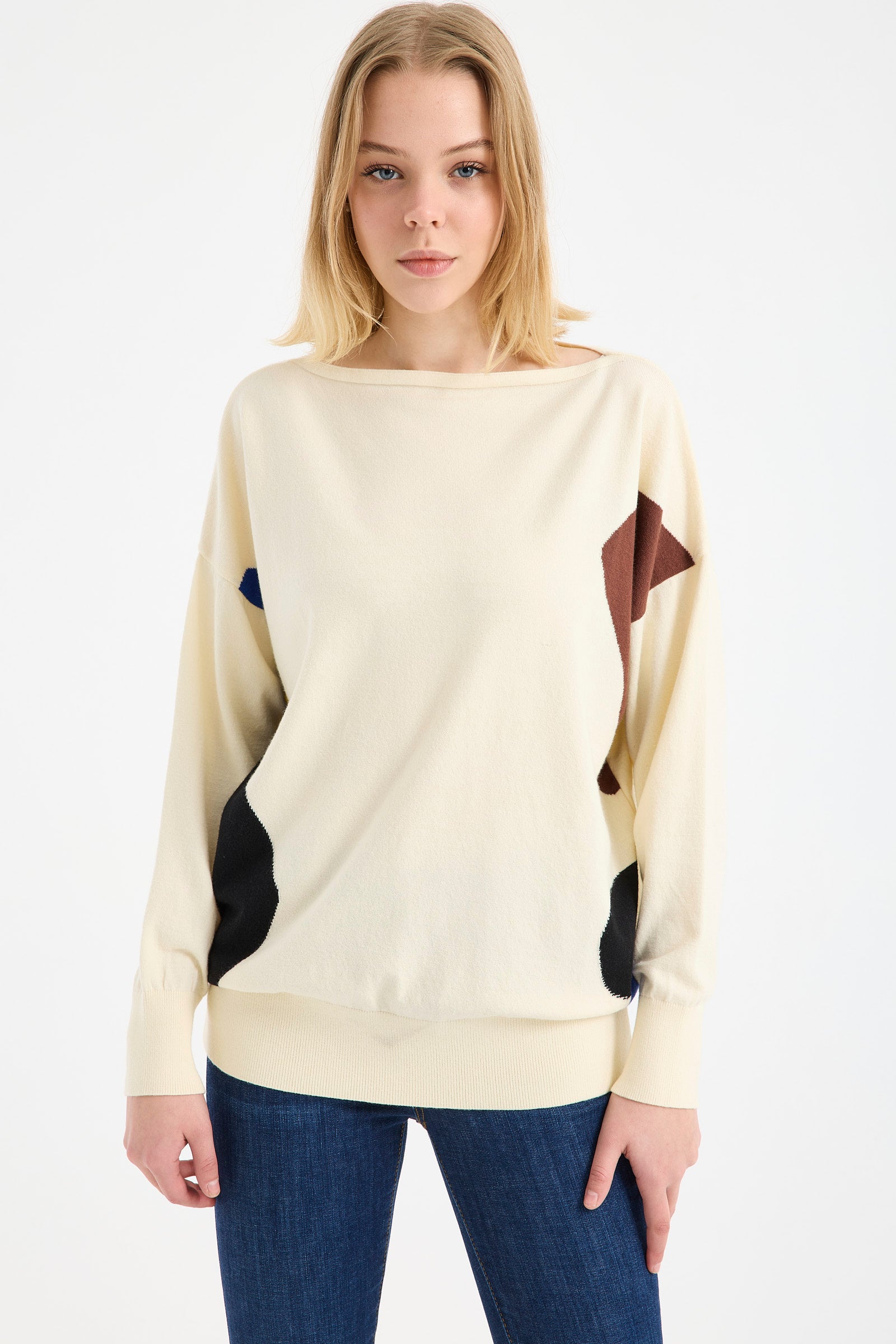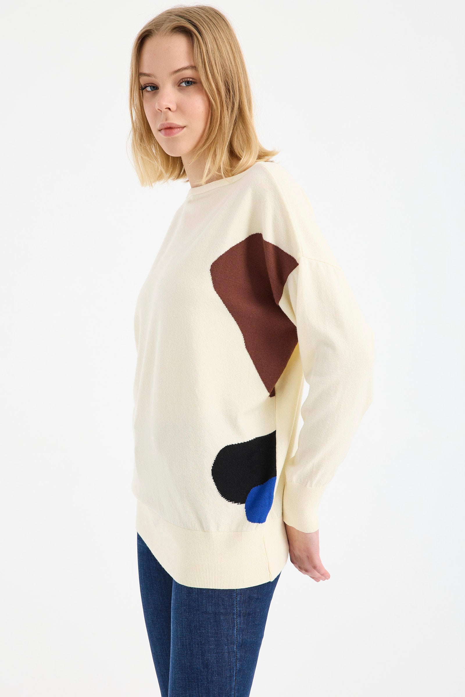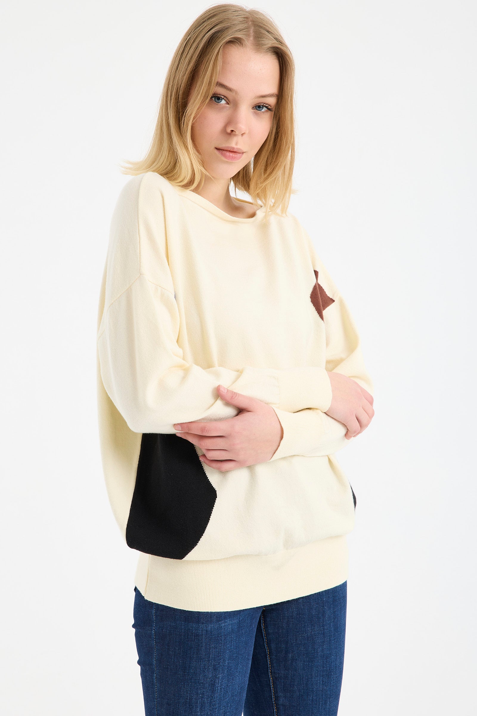 Bej rengi kuzu desenli polo yaka kazak da, kadın triko kazak ürünleri arasında adeta bir inci gibi parlıyor. Özellikle kış aylarında hayvan desenli kazakların sık tercih edildiği biliniyor. Bu desenler, sıcak, samimi ve sevimli bir hava oluşturduklarından çok beğeniliyor.