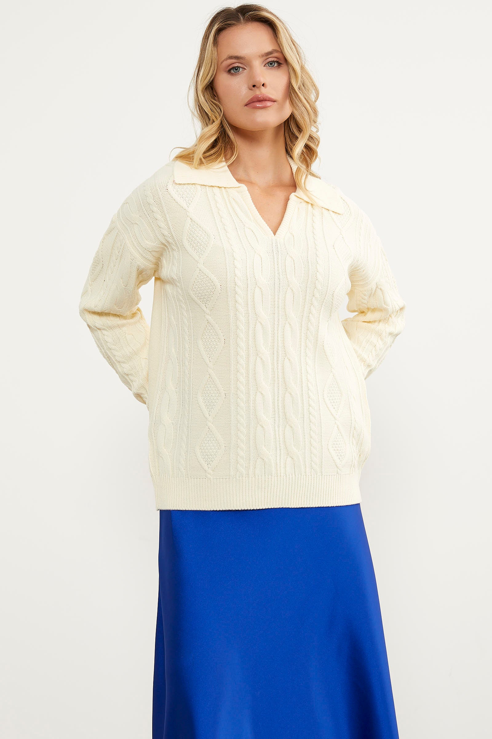 Bej rengi kuzu desenli polo yaka kazak da, kadın triko kazak ürünleri arasında adeta bir inci gibi parlıyor. Özellikle kış aylarında hayvan desenli kazakların sık tercih edildiği biliniyor. Bu desenler, sıcak, samimi ve sevimli bir hava oluşturduklarından çok beğeniliyor.