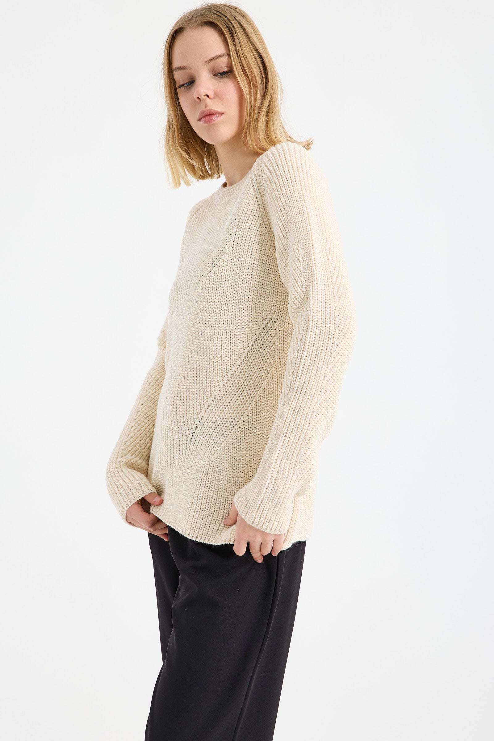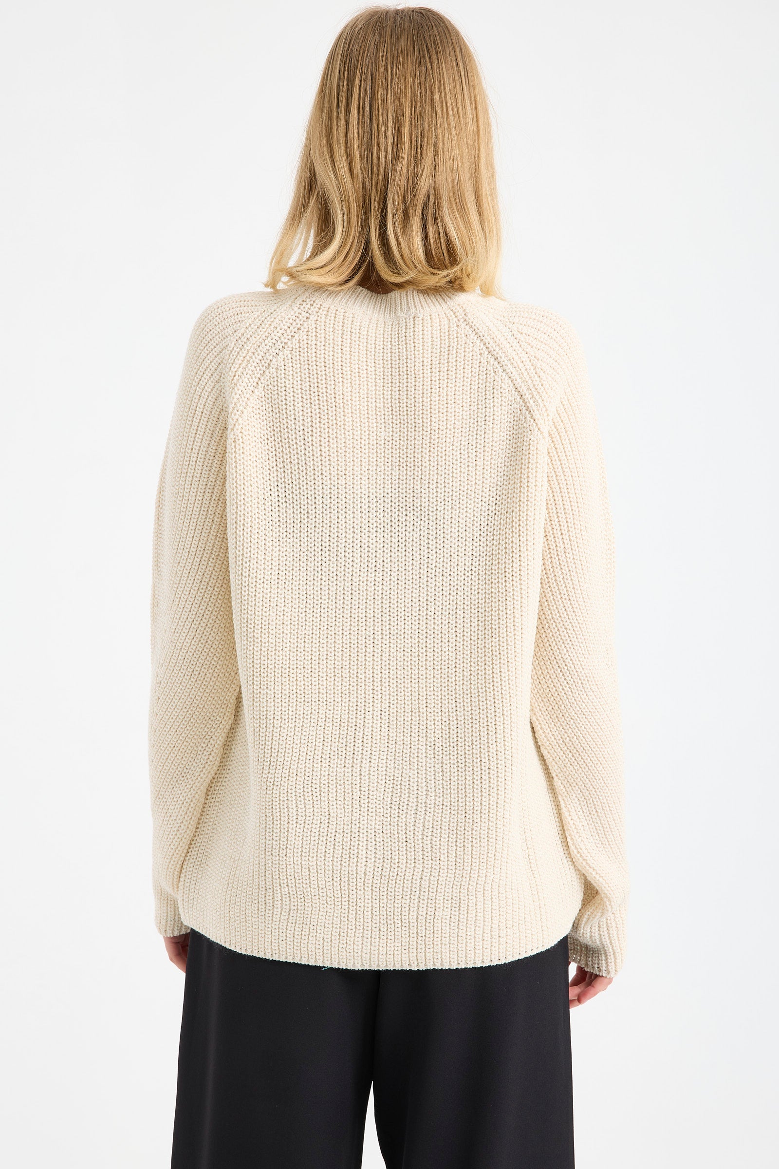 Bej rengi kuzu desenli polo yaka kazak da, kadın triko kazak ürünleri arasında adeta bir inci gibi parlıyor. Özellikle kış aylarında hayvan desenli kazakların sık tercih edildiği biliniyor. Bu desenler, sıcak, samimi ve sevimli bir hava oluşturduklarından çok beğeniliyor.