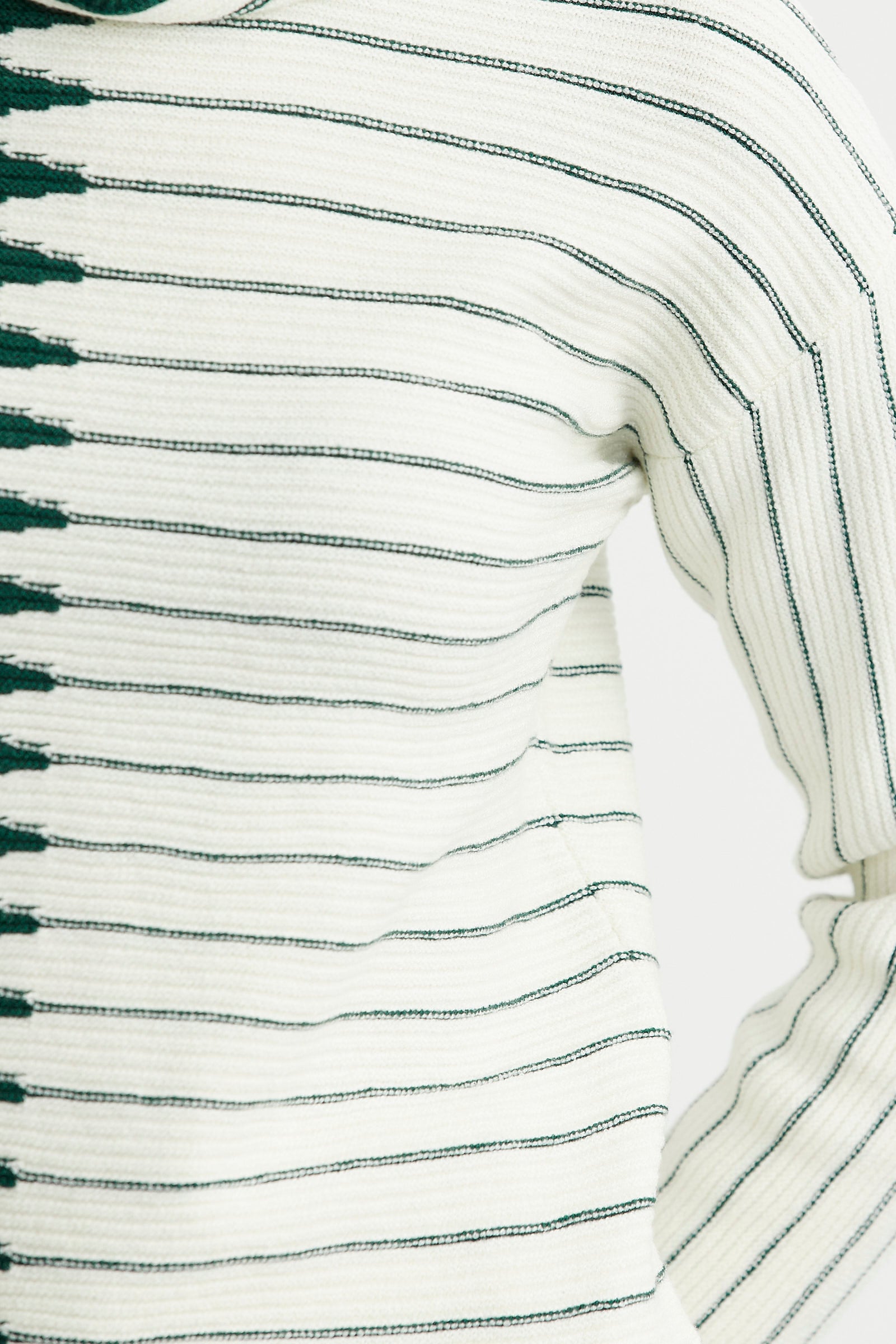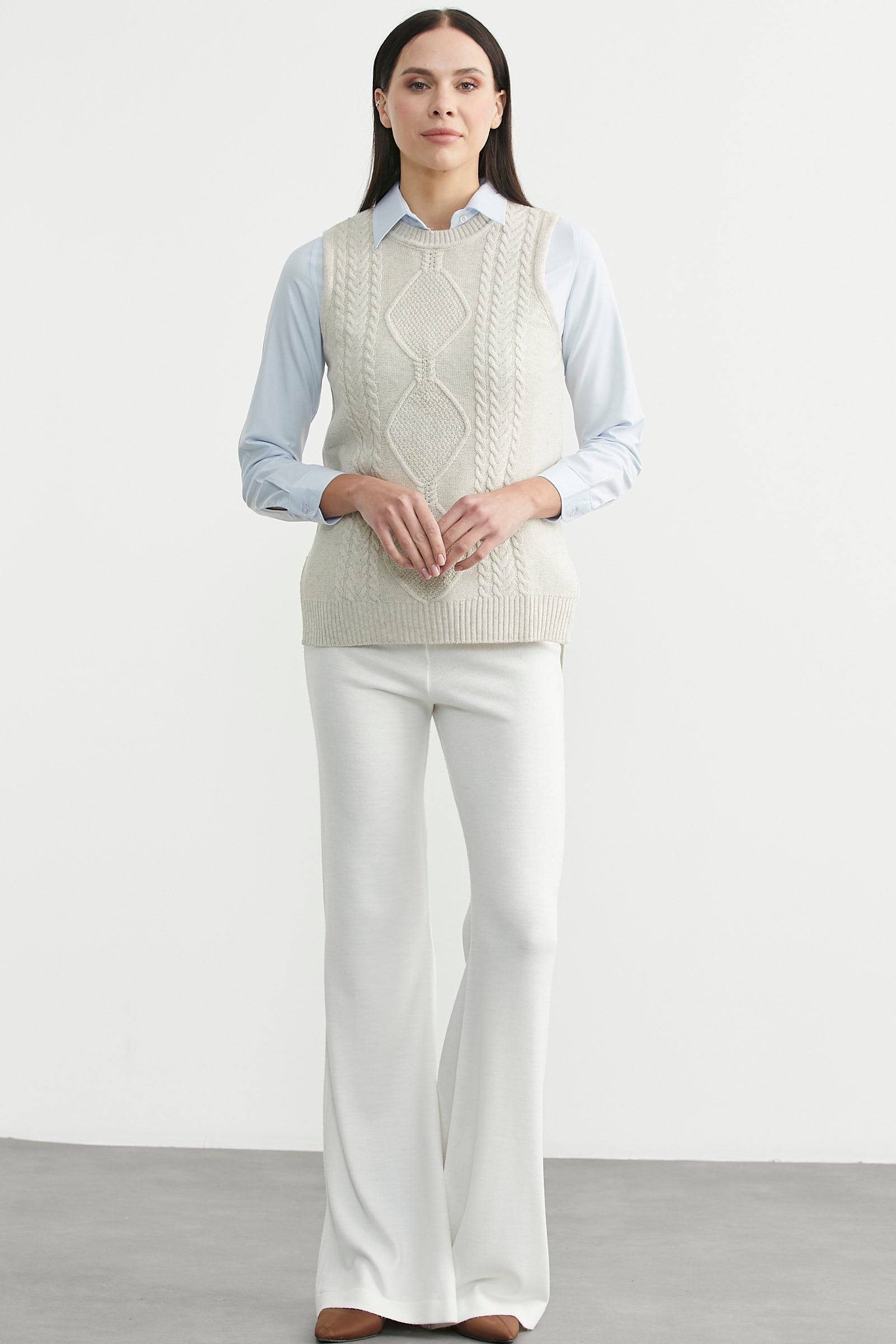 Bej rengi kuzu desenli polo yaka kazak da, kadın triko kazak ürünleri arasında adeta bir inci gibi parlıyor. Özellikle kış aylarında hayvan desenli kazakların sık tercih edildiği biliniyor. Bu desenler, sıcak, samimi ve sevimli bir hava oluşturduklarından çok beğeniliyor.