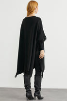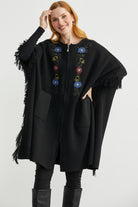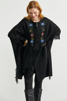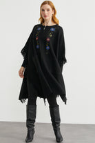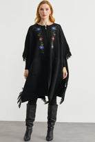 Çiçek Nakışlı Yünlü Triko Panço - Siyah