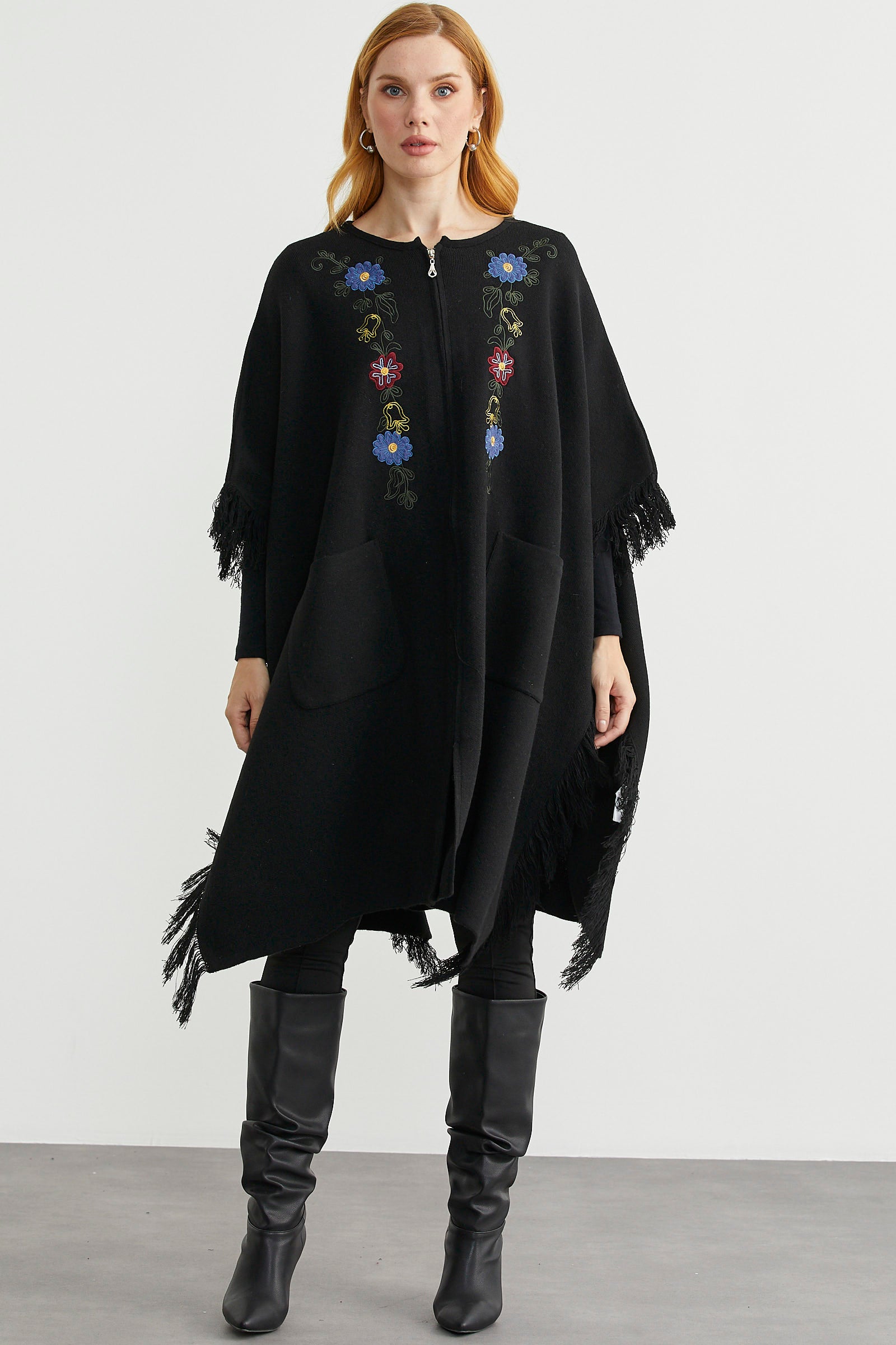 Yüksek oranda yün içeren nakış detaylı triko panço. Uzun boy, cepli. Geniş kalıp.