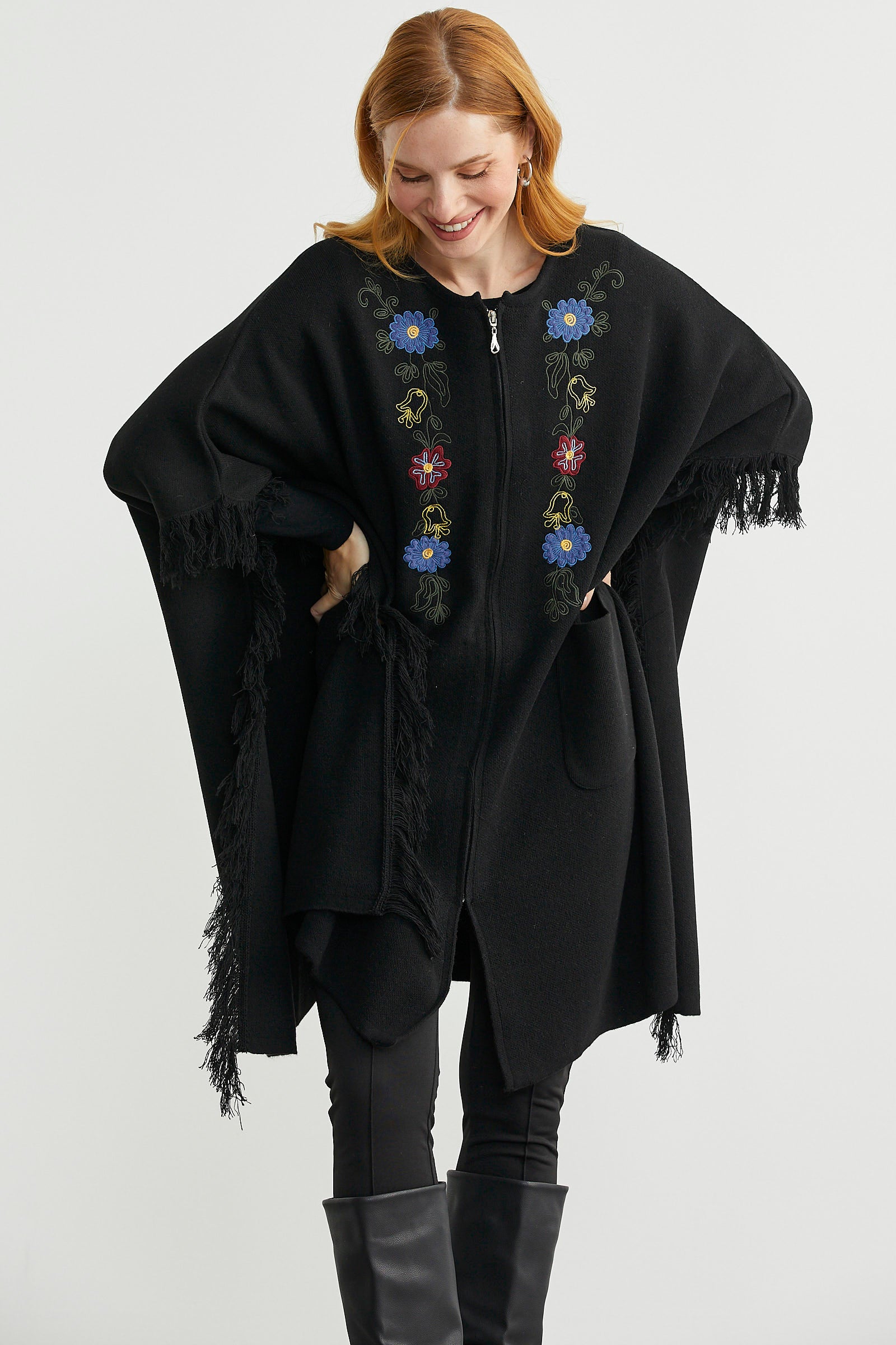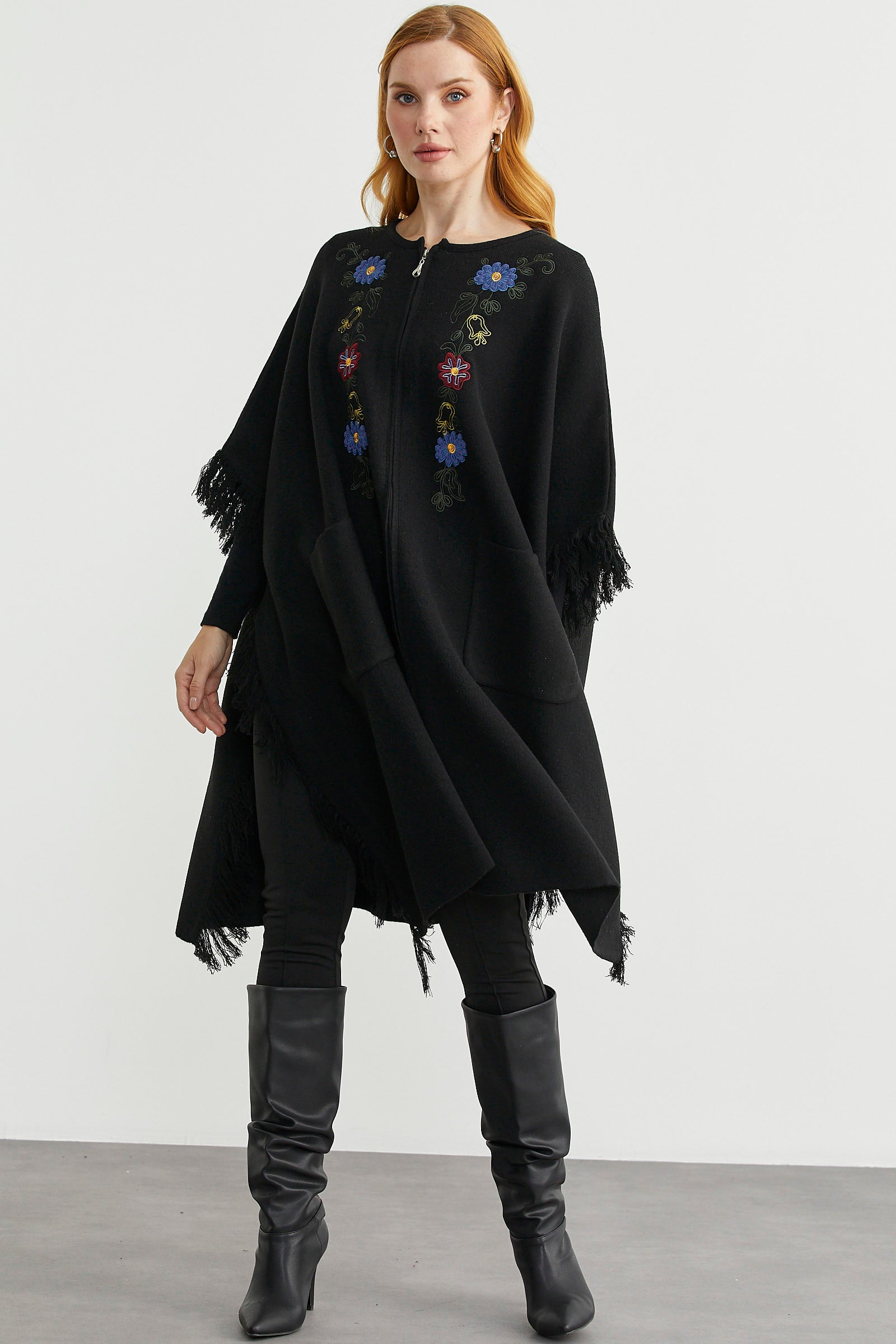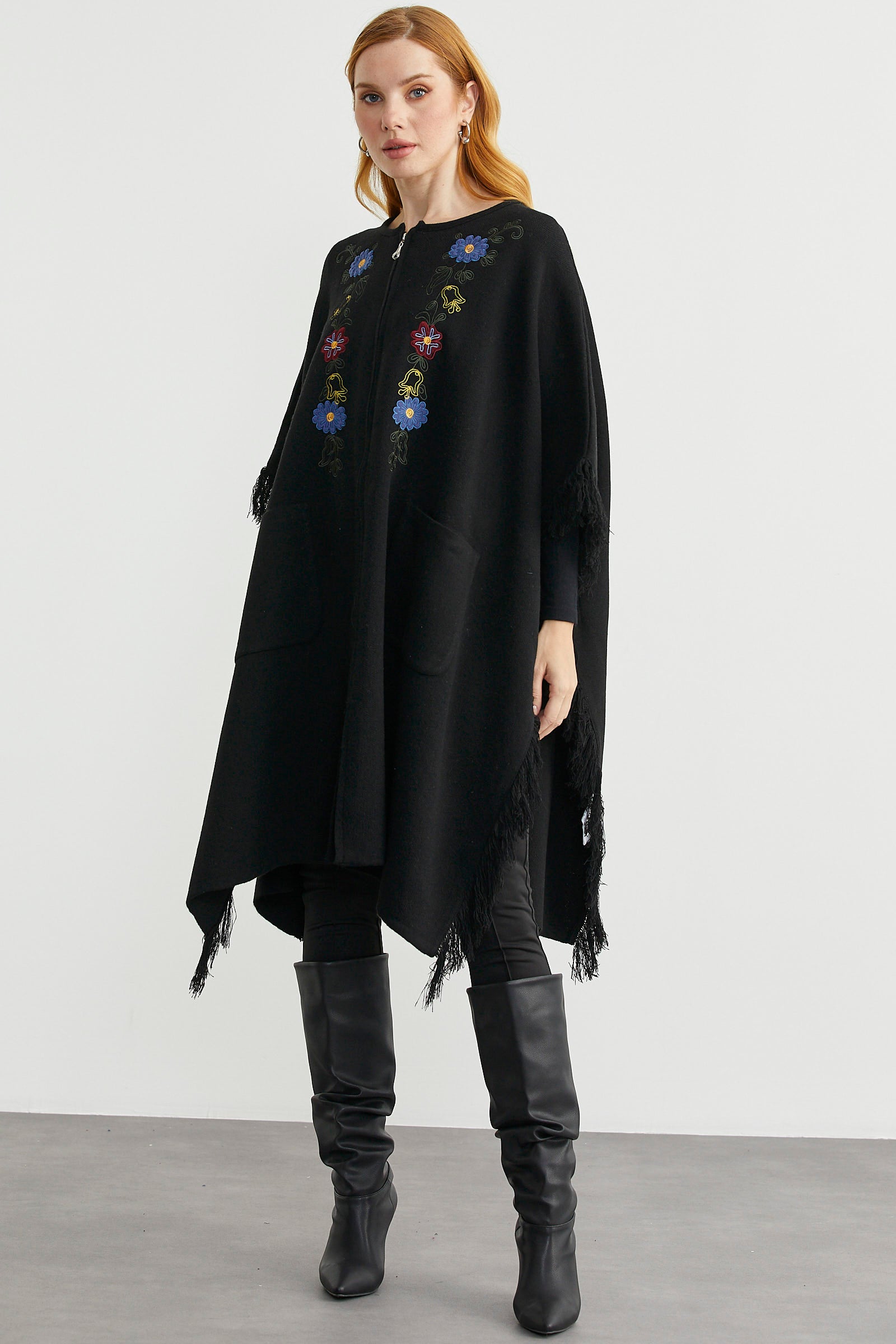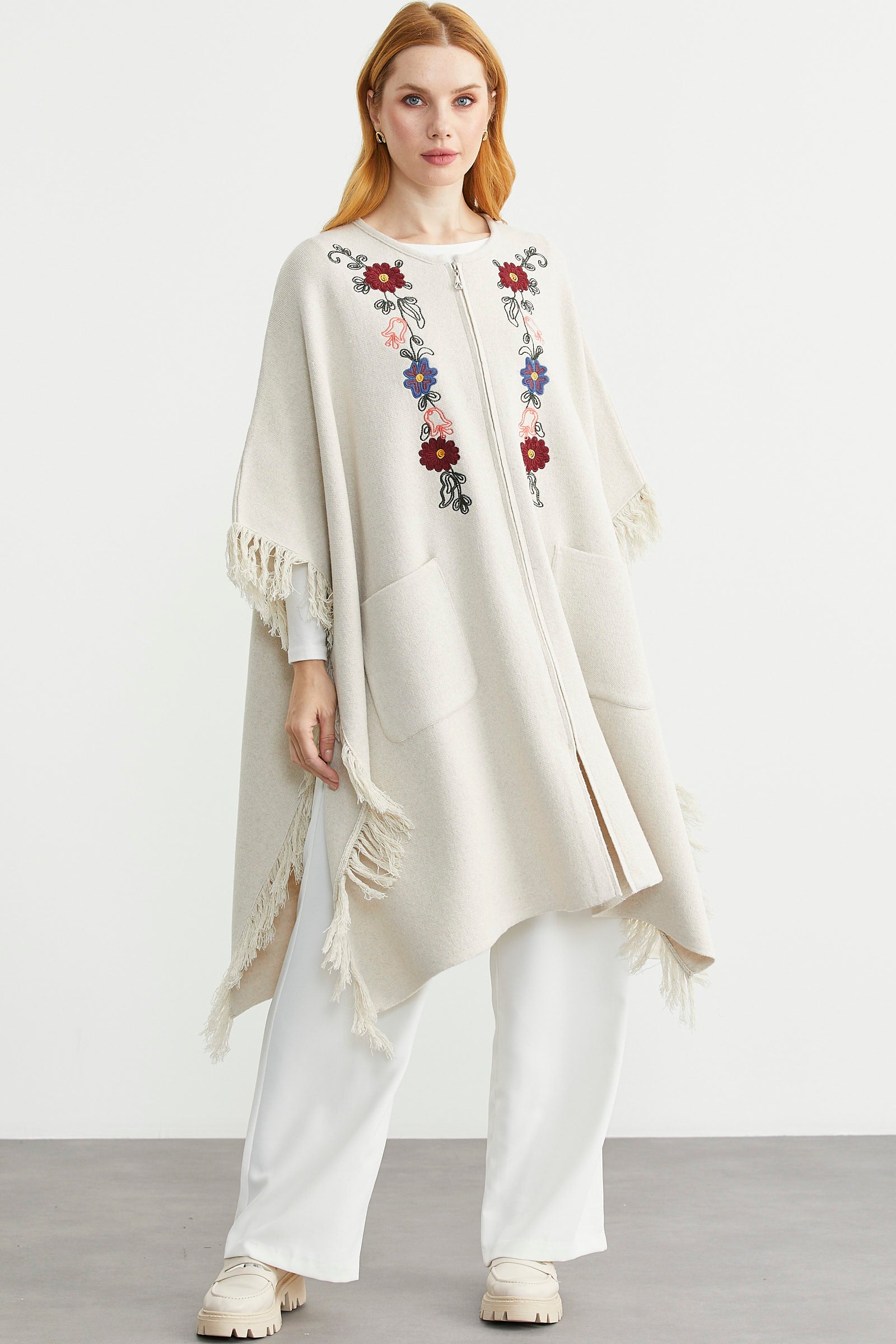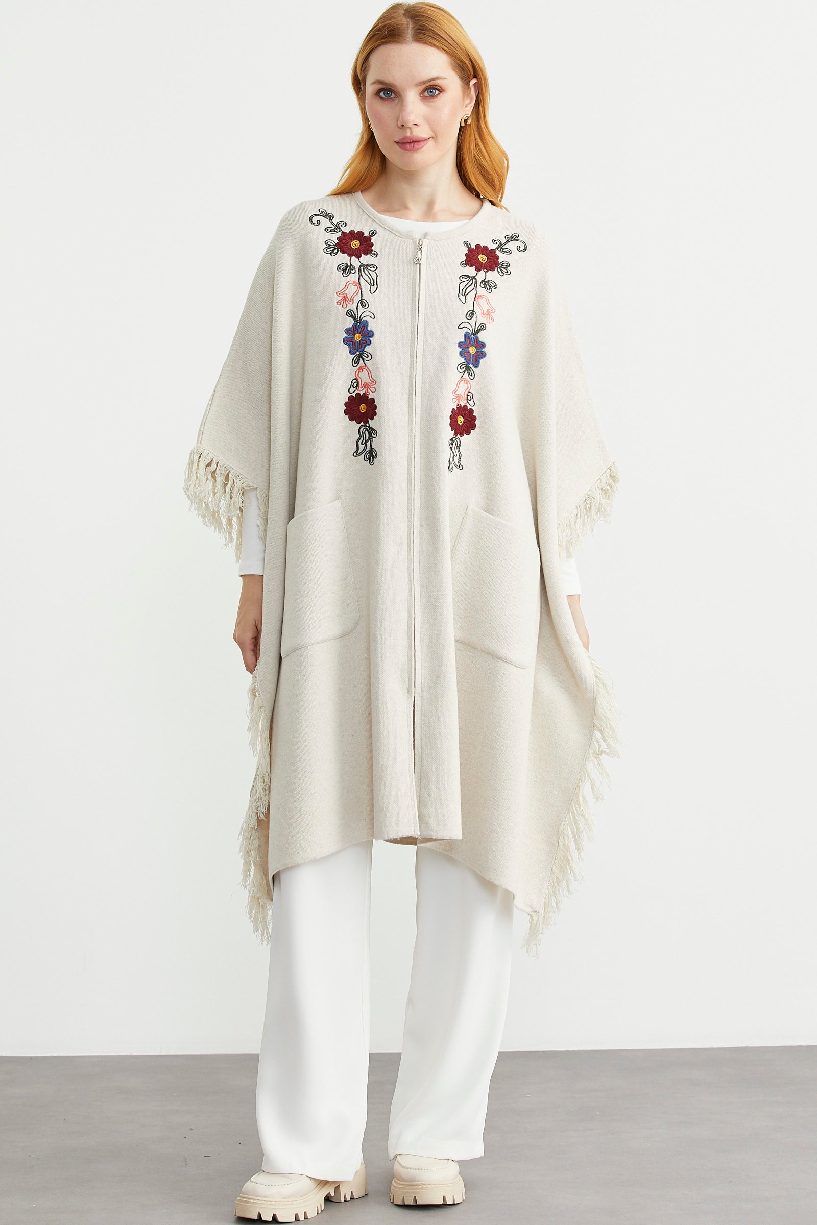 Sementa’da basic modellerden çift renkli pançolara, cepli tasarımlardan işlemeli pançolara, ucuna püsküllerle hareket kazandırılan modellerden yakası suni kürk detaylı ürünlere kadar genişleyen bir yelpazede seçim yapabilirsiniz. Bu seçimi, siyah, gri, gül, kırmızı, bej, pembe gibi birçok renk arasından neticelendirebilir, böylece tarzınıza en uygun pançoyu bulabilirsiniz.