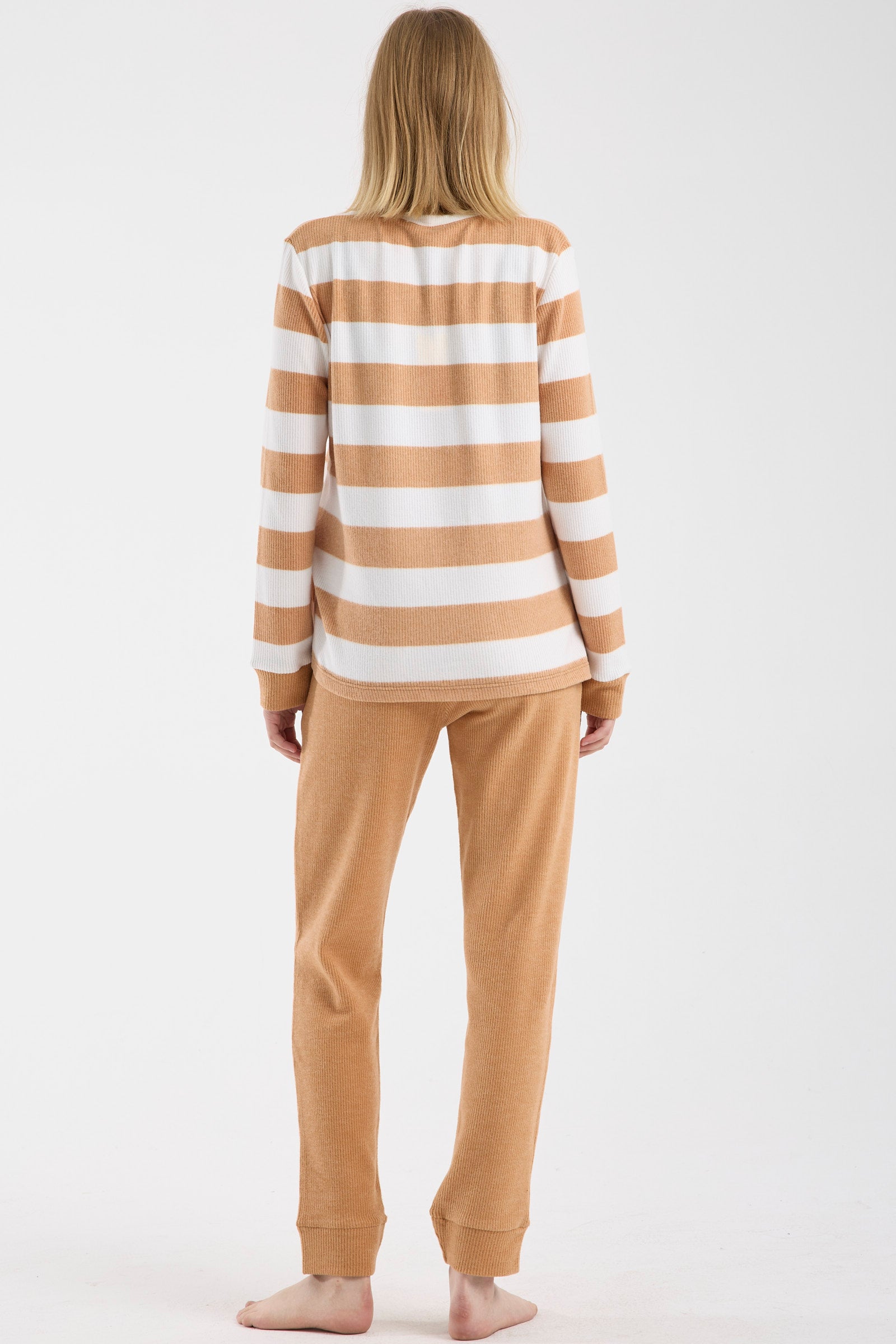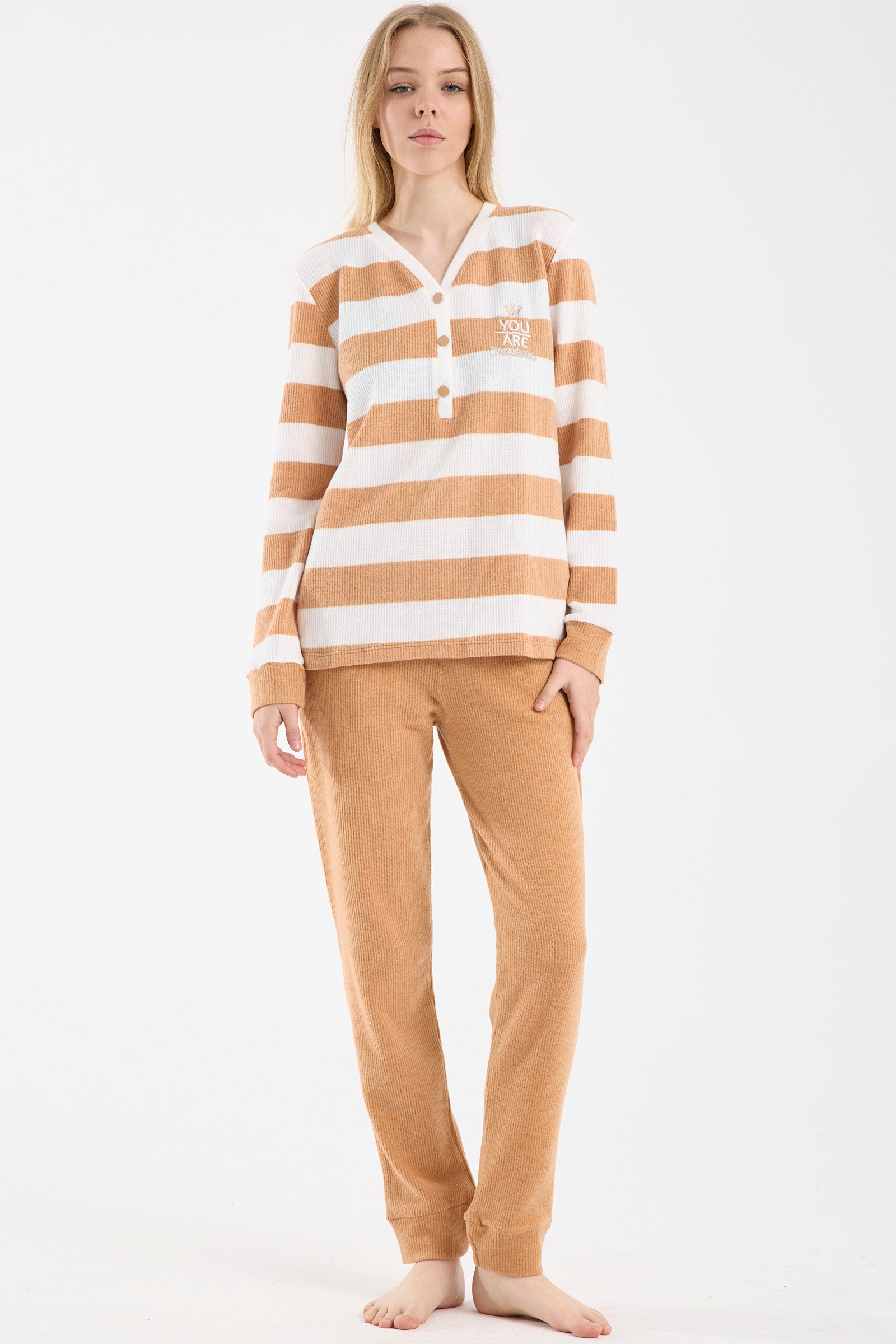 Yumuşak dokulu, yakası yarım düğmeli, rahat kalıp, çizgili üst. Tek renk yumuşak dokulu, cepli ve fitilli alt.