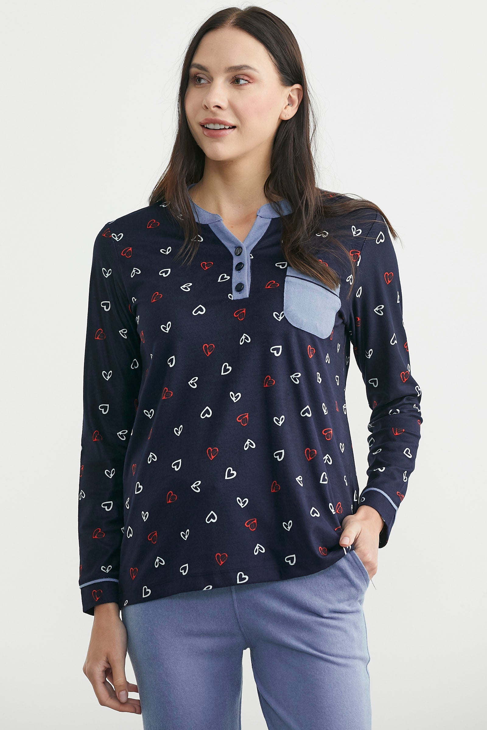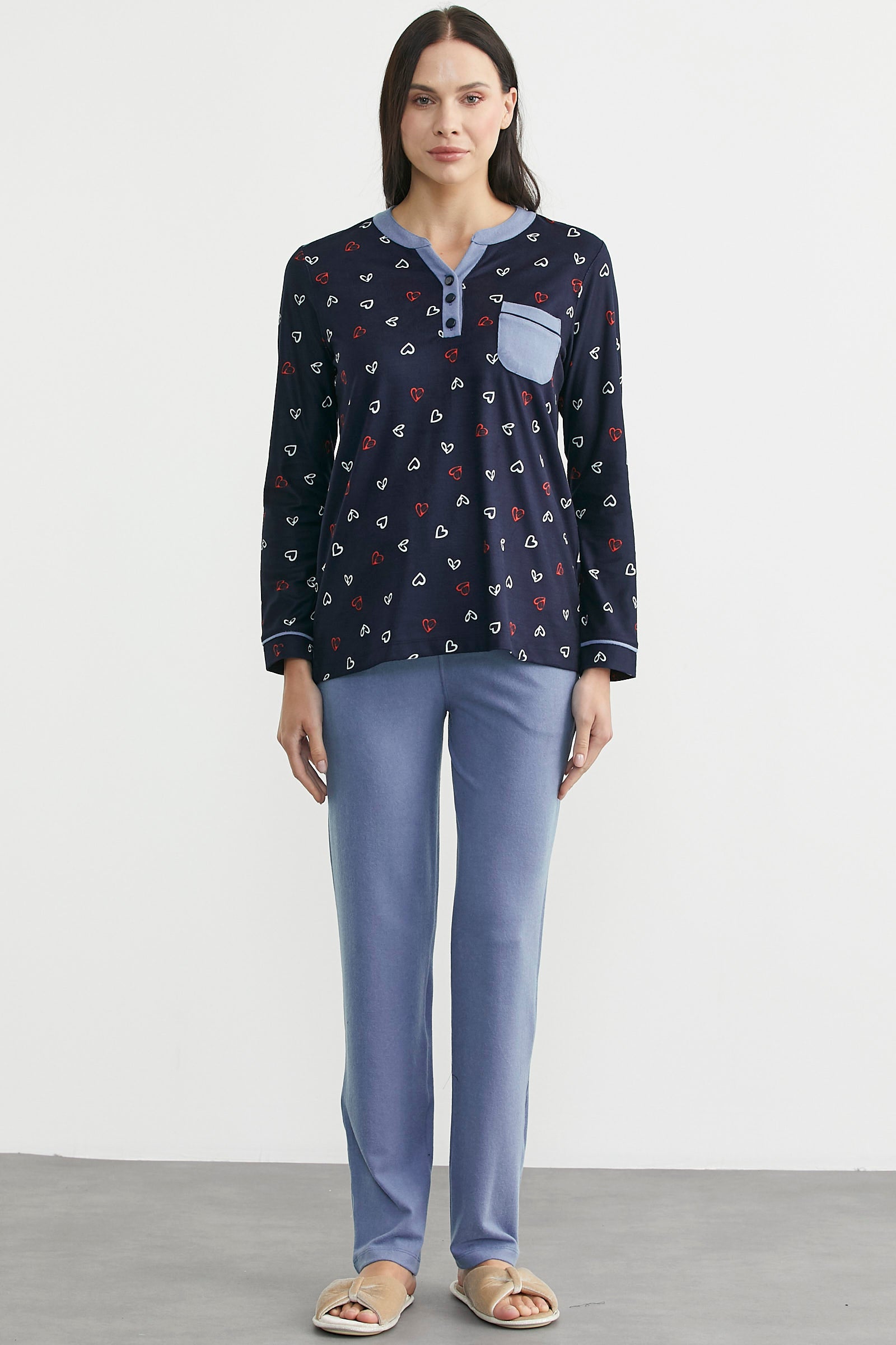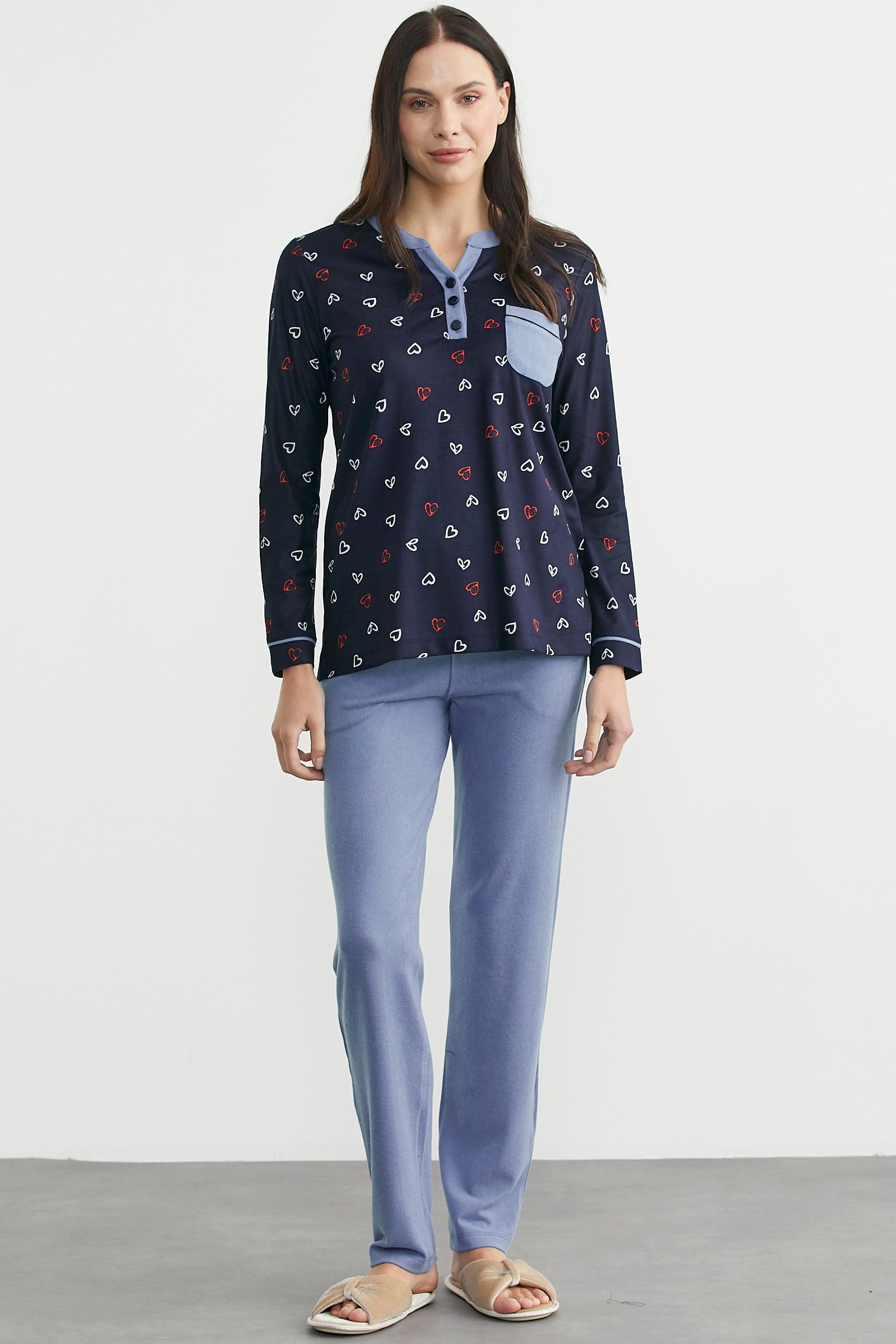 Kontrast kumaş, kalp desenli, cepli pijama takım. Standart kalıptır.