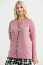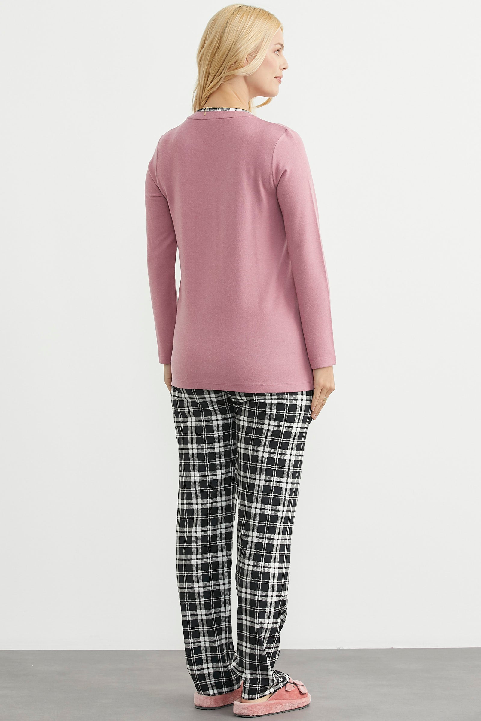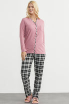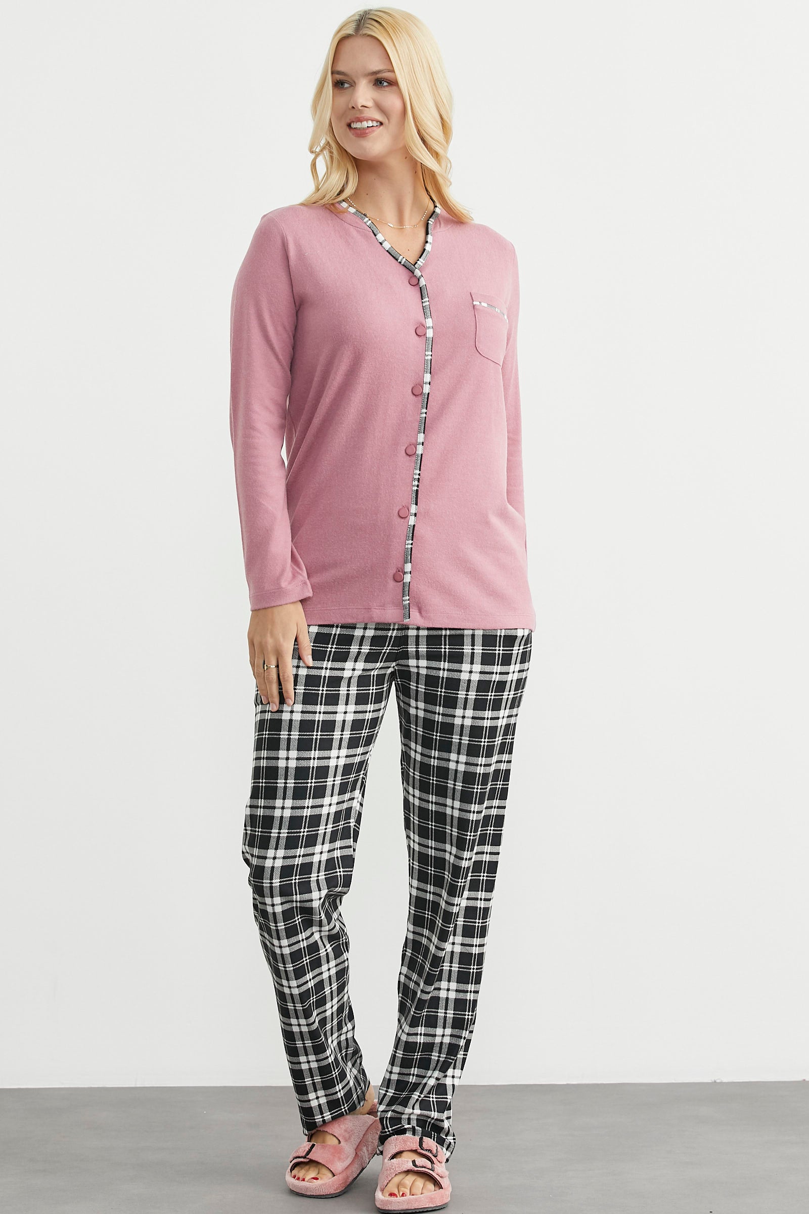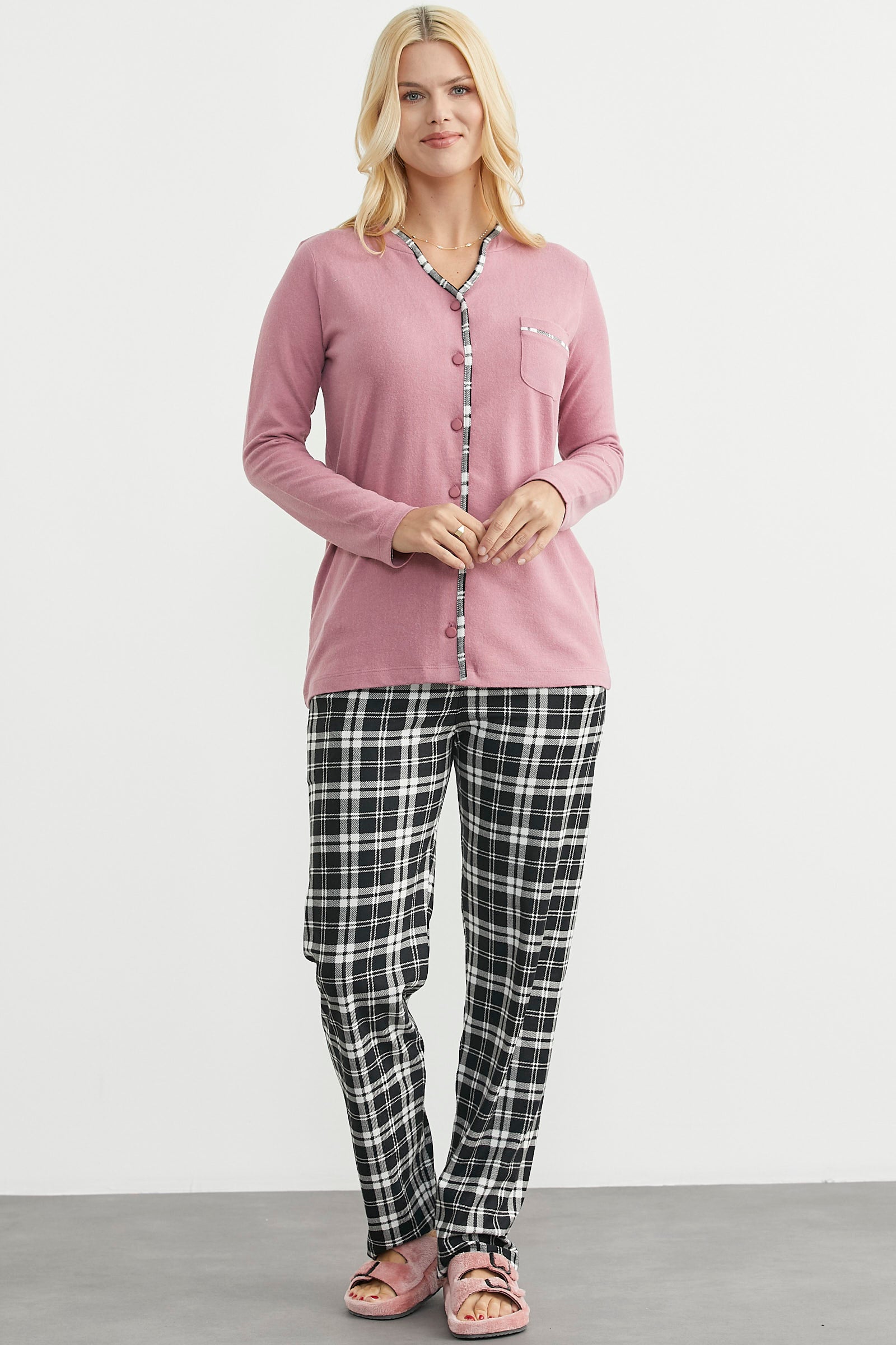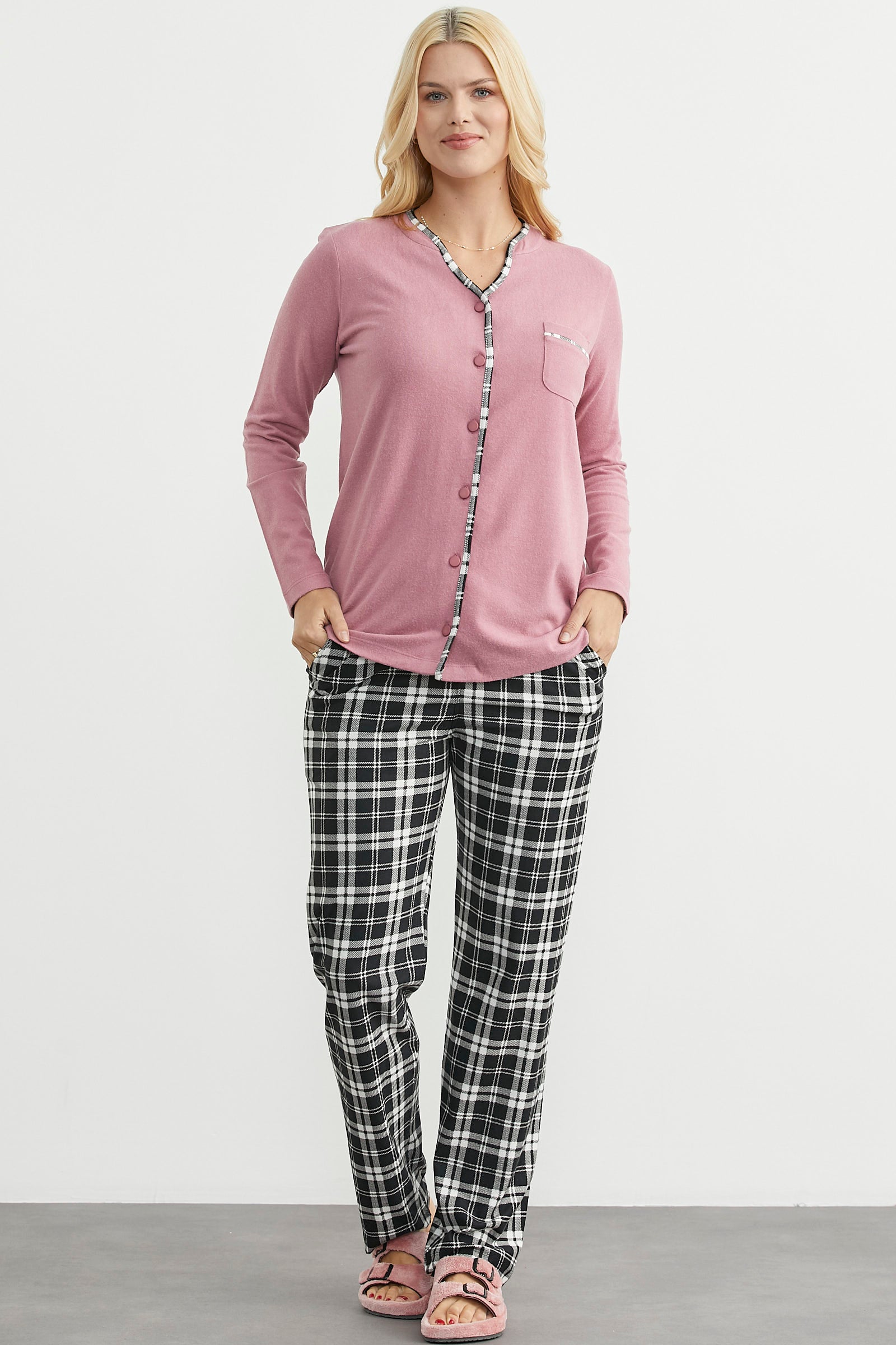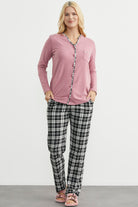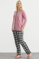Ekose Kombinli Düğmeli Pijama Takım - Gül Kurusu