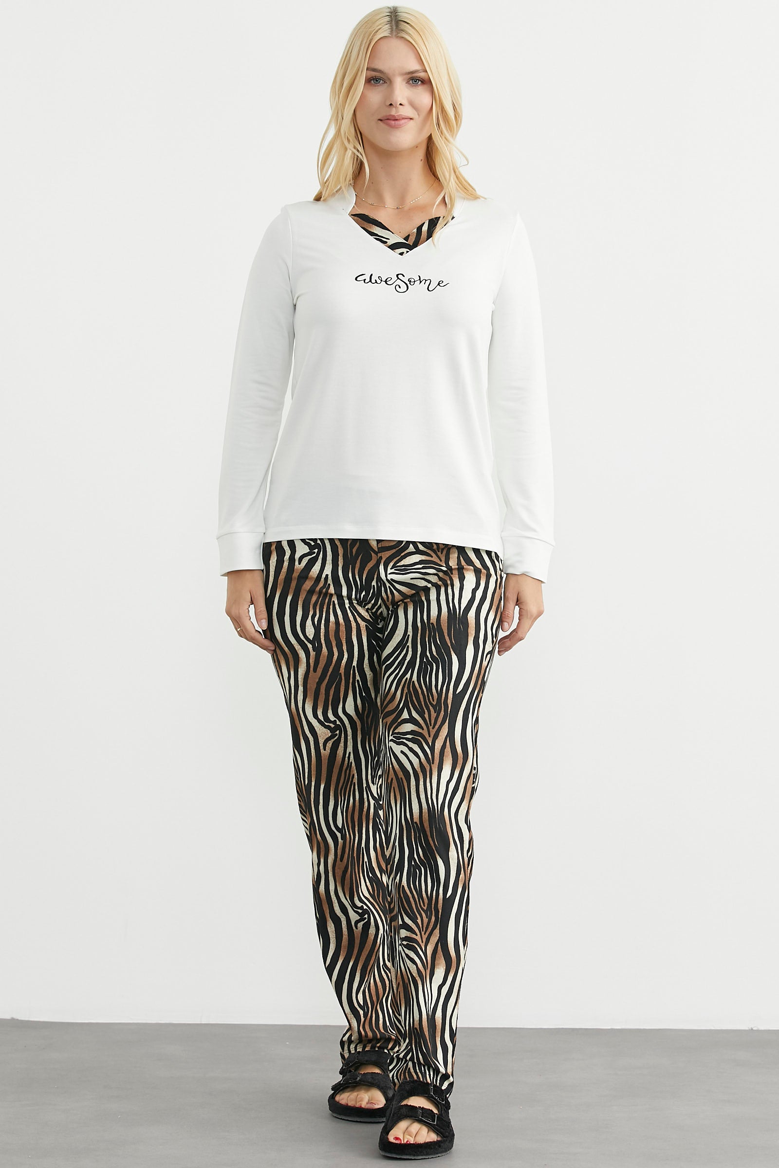 Yakası parça detaylı, nakışlı üst, hayvan desenli, boru paça alt.