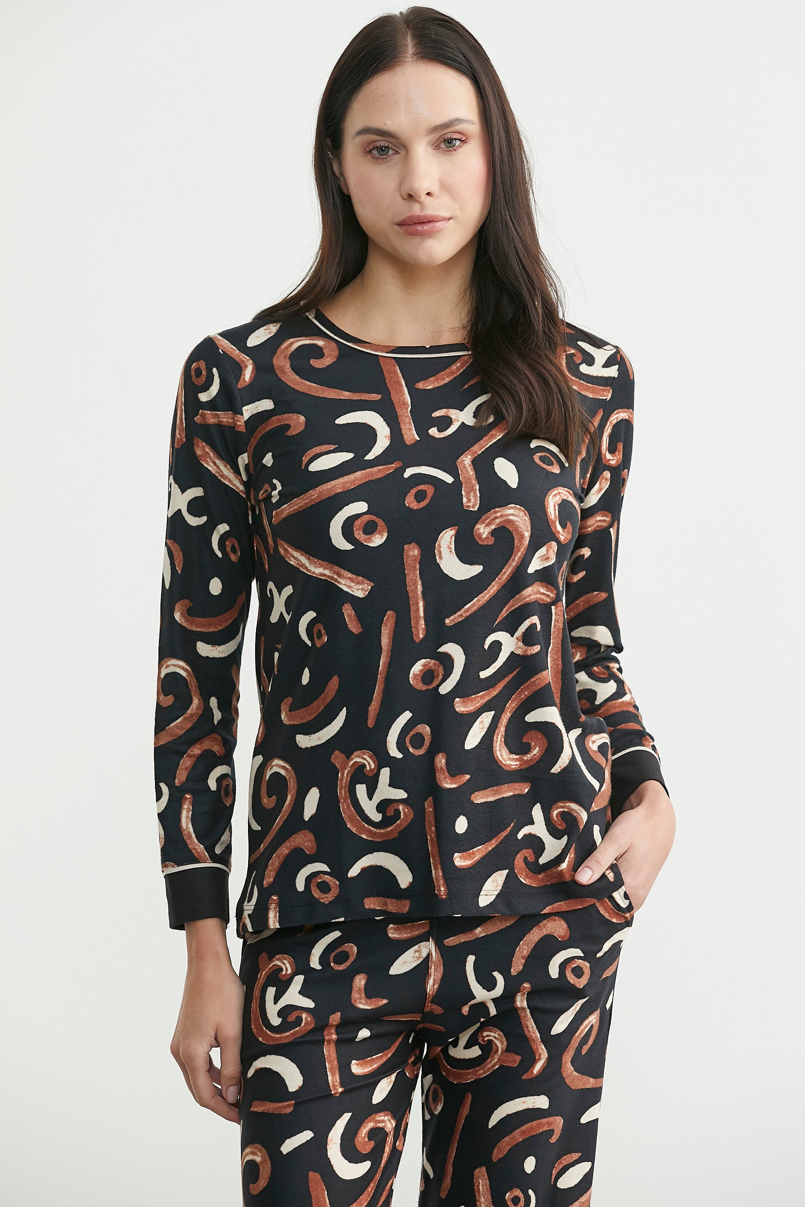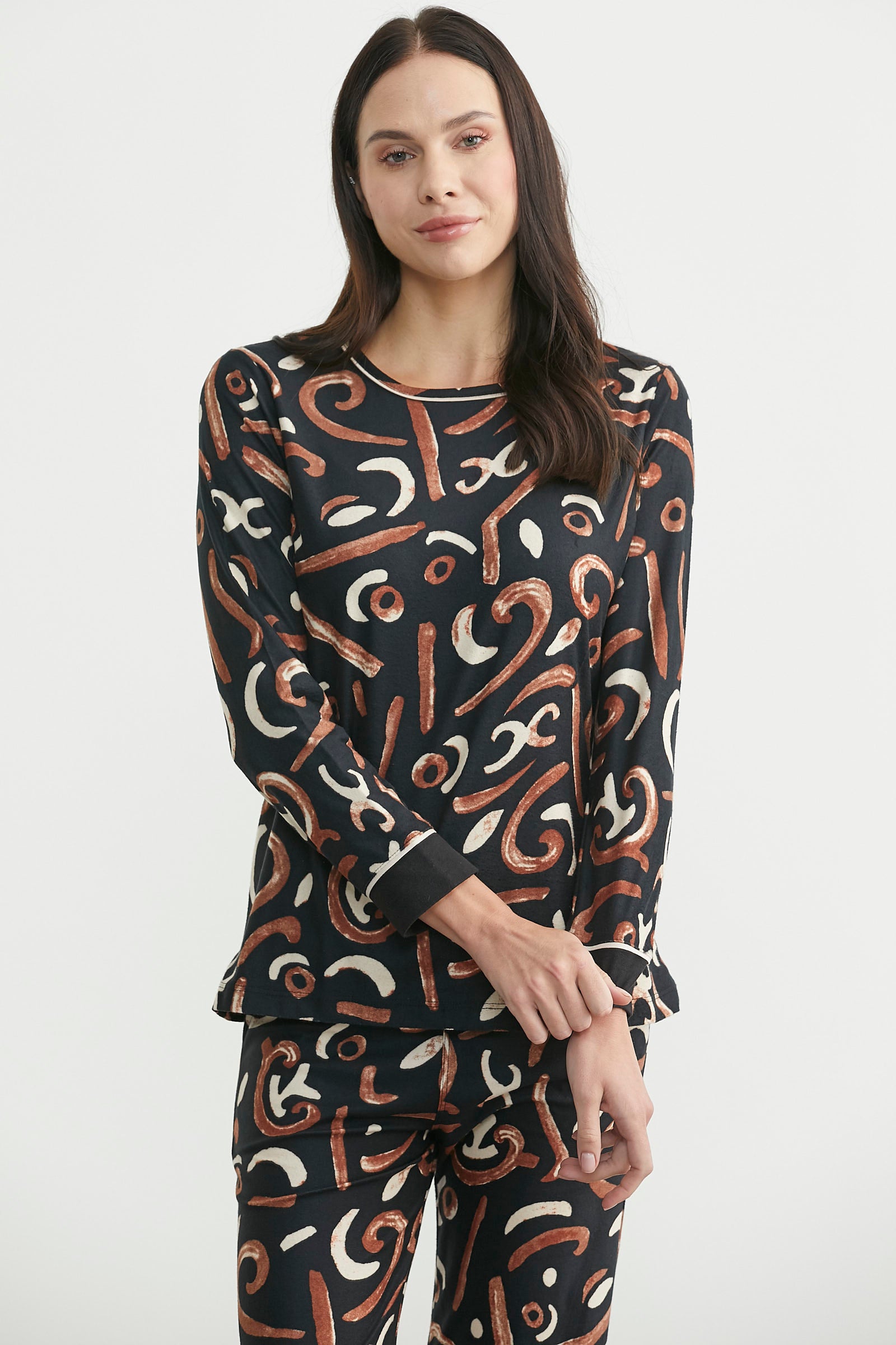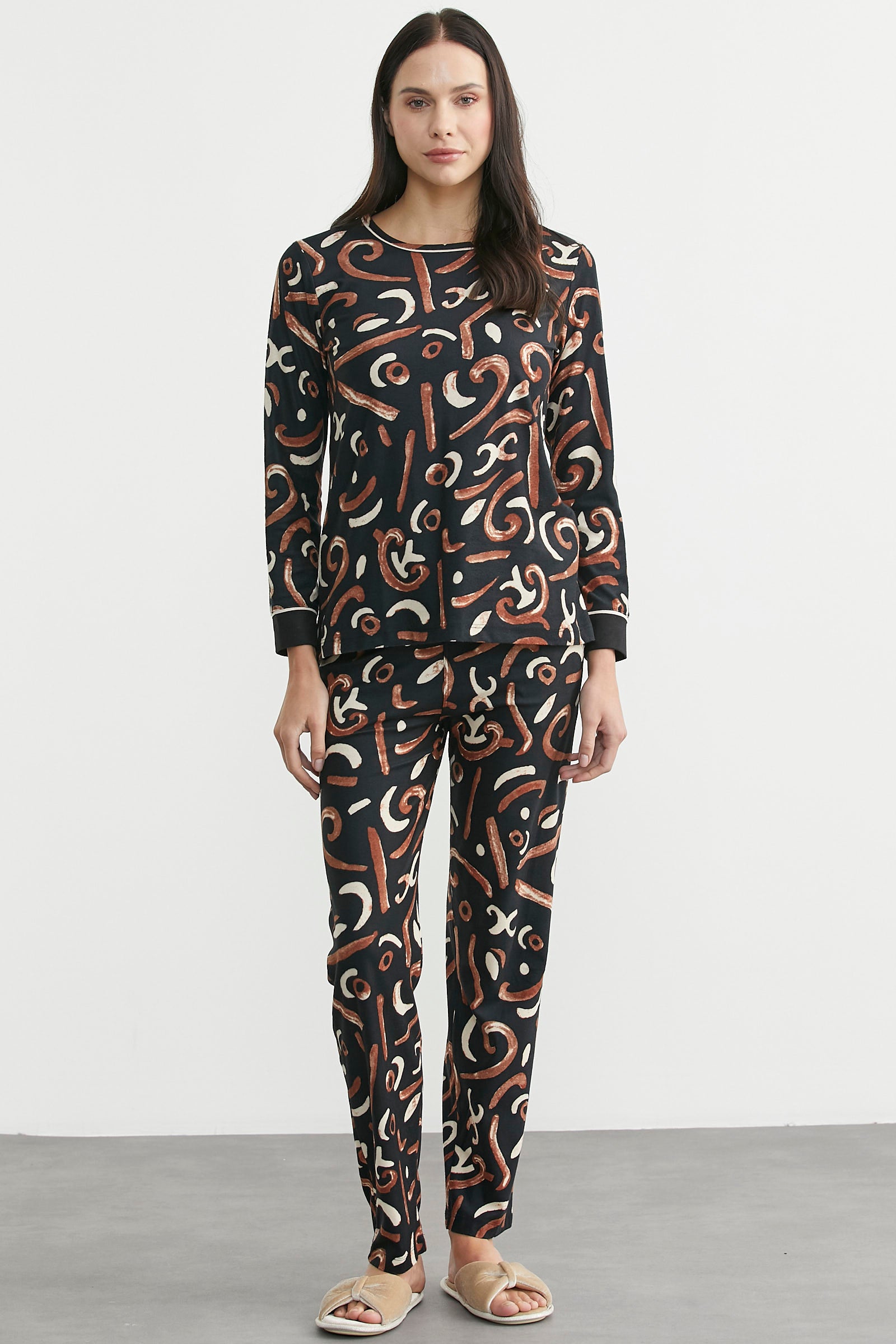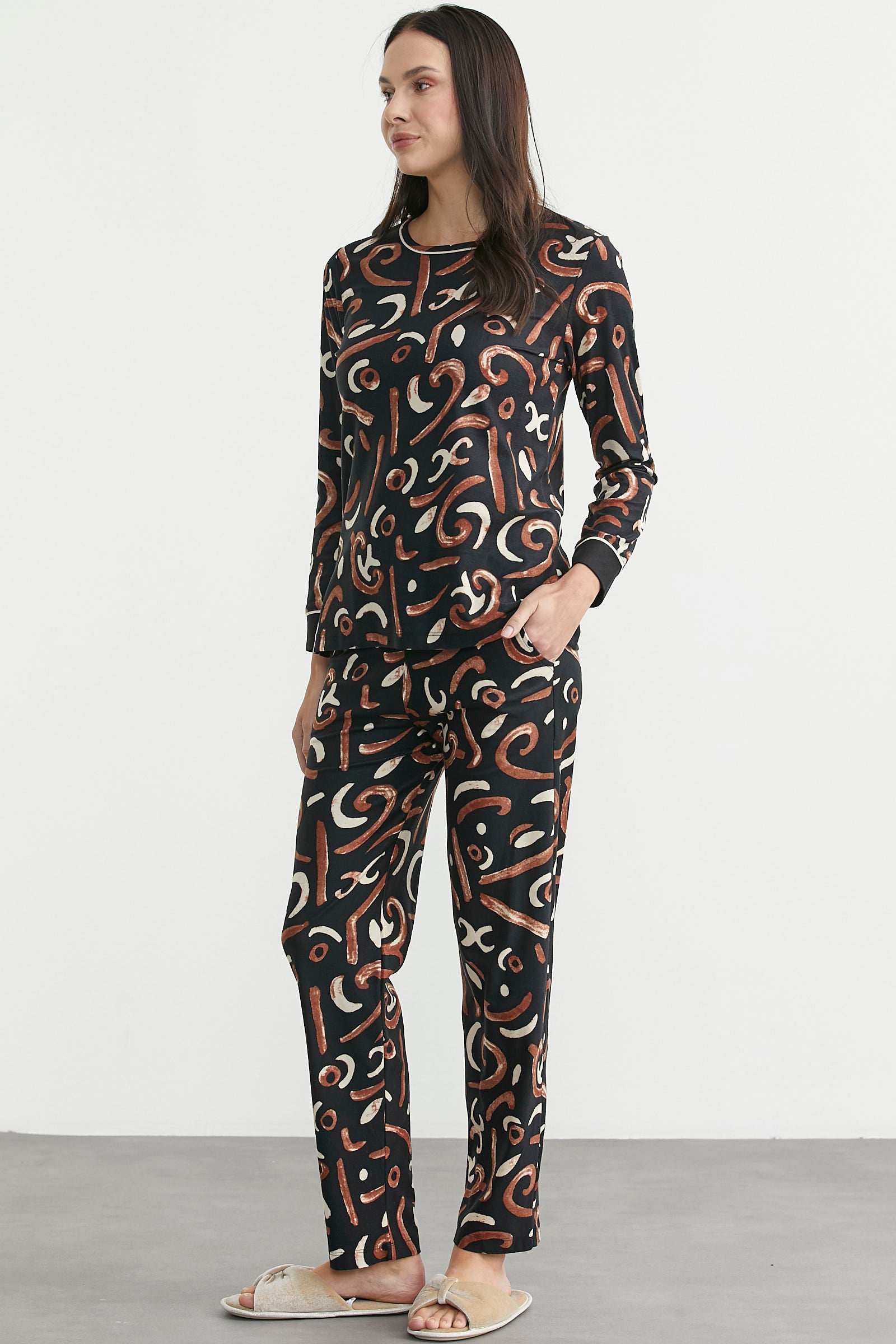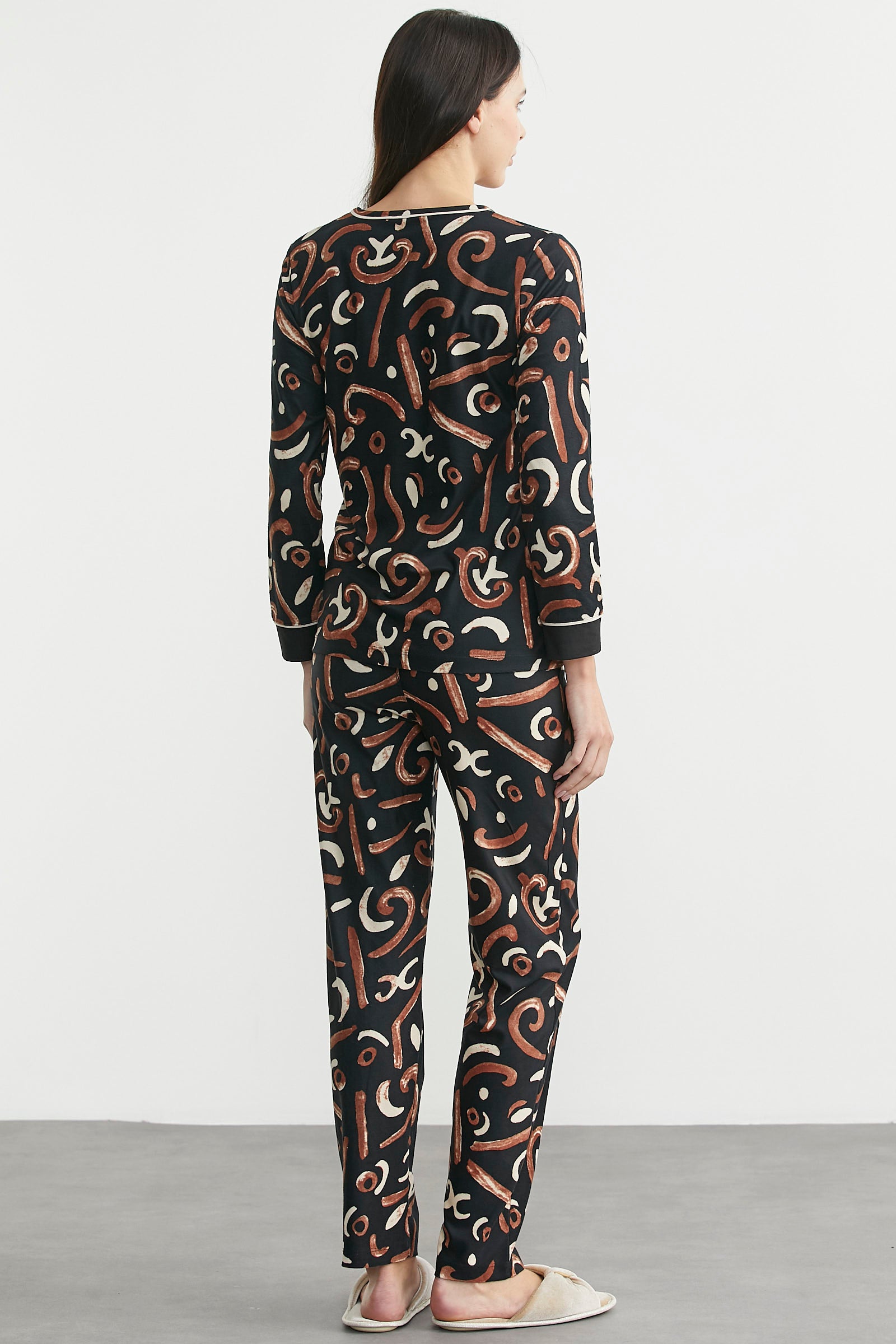 Yumuşak Dokulu Desenli Pijama Takım - Siyah
