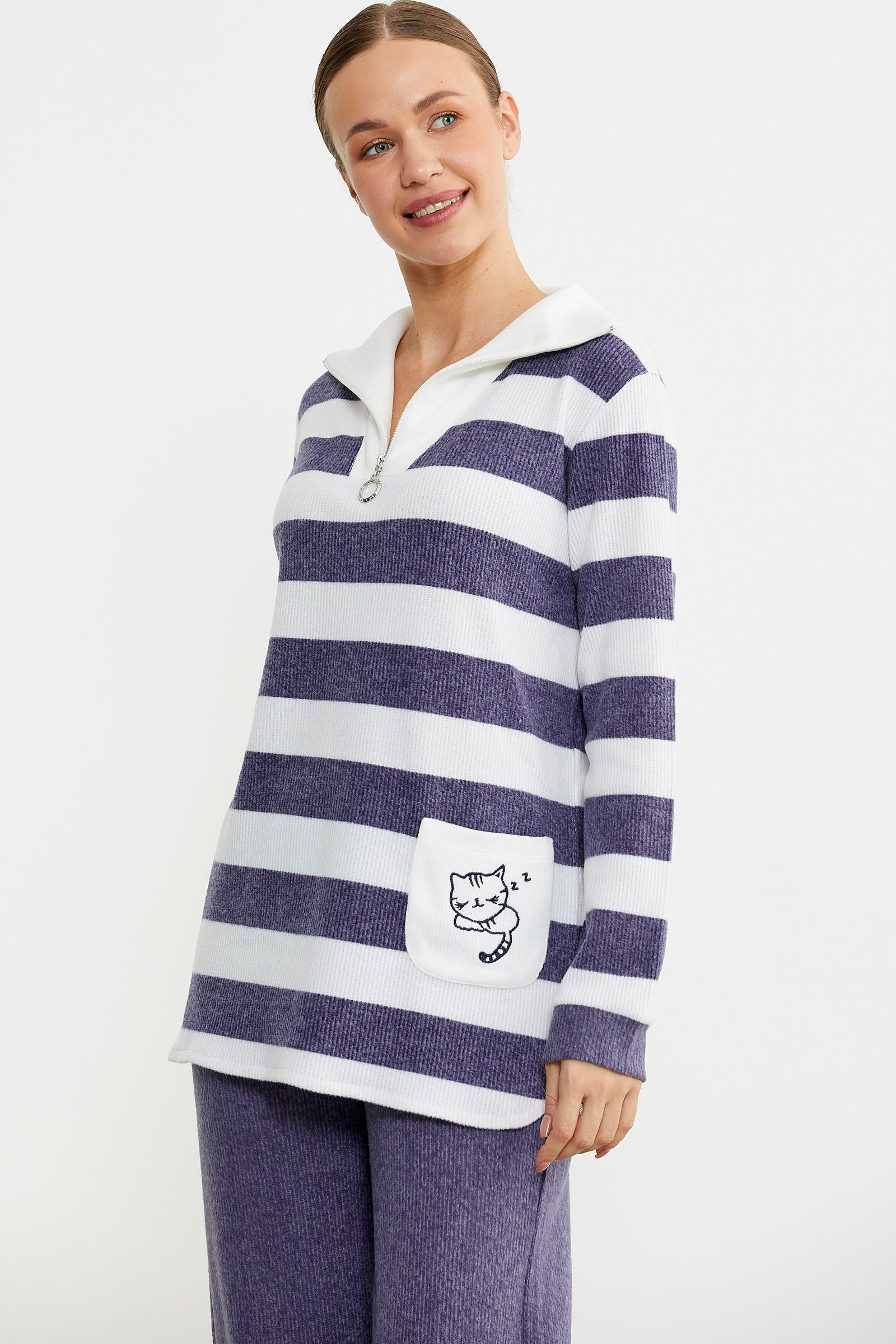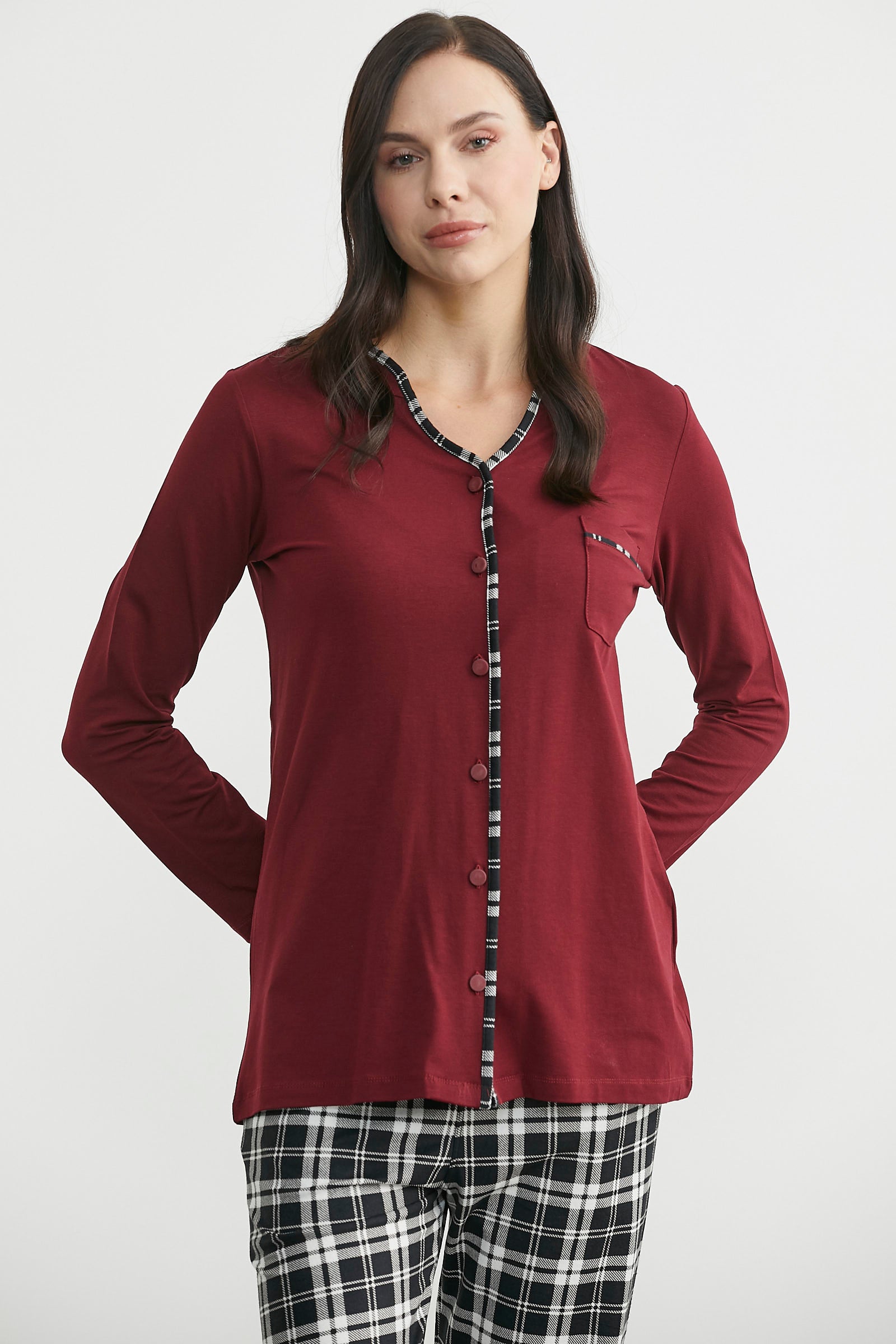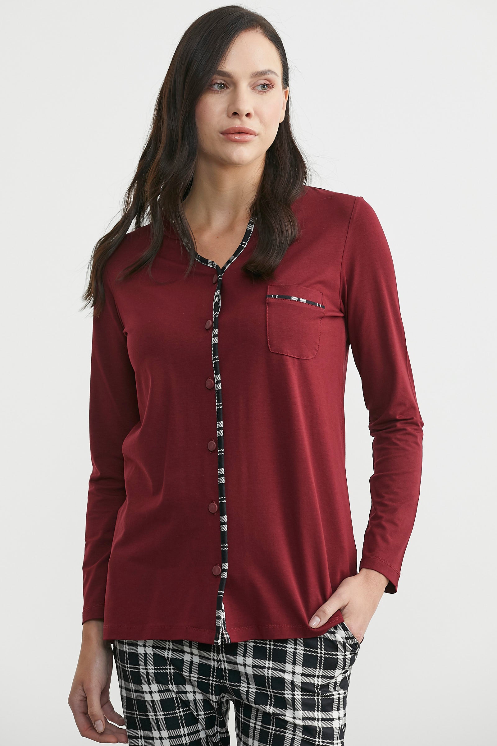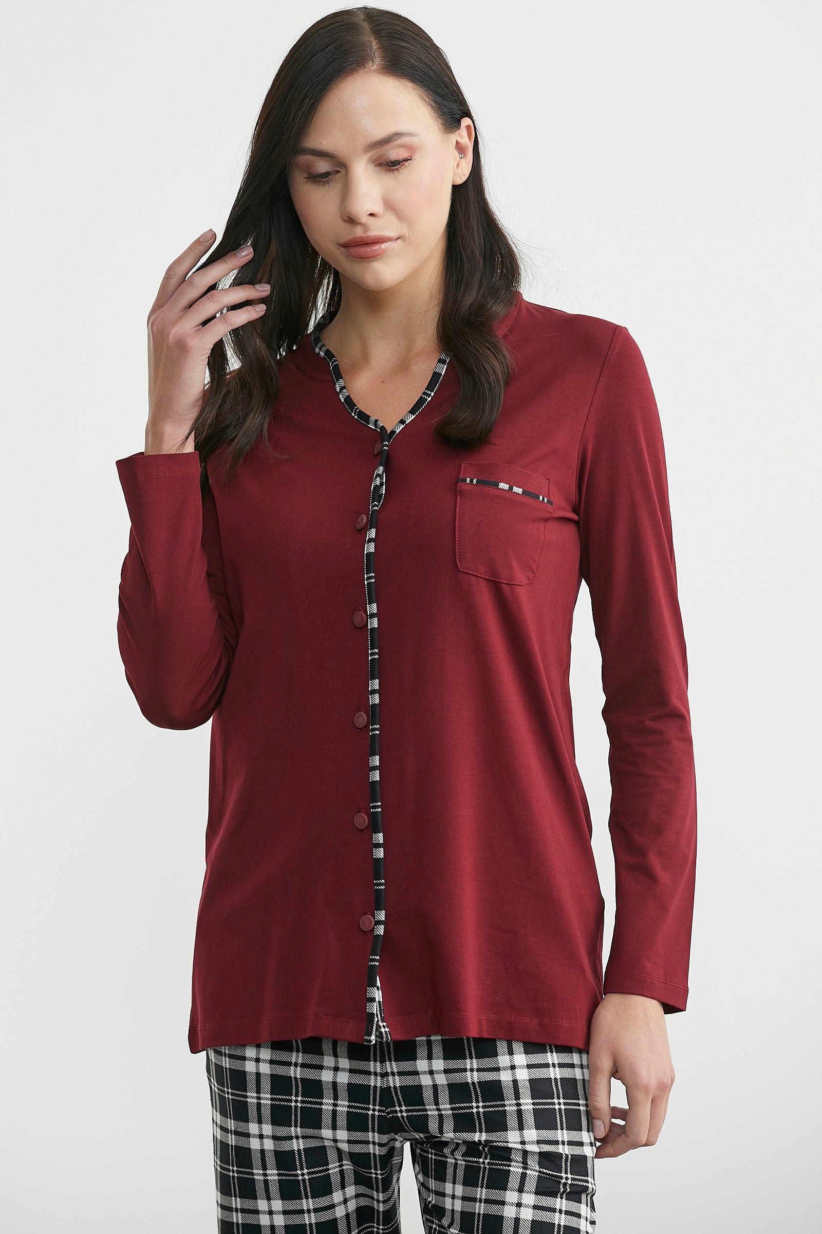 Pijamalarında çizgili desenlerin eğlenceli görüntüsüne yer vermek isteyen kadınlar için de, kareli yahut düz çizgili tasarımlarımız sizlere kavuşacağı günü bekliyor. Birçok modelde çizgilerin ya da karelerin yoğunluğu, pijama altında toplanmış durumda. Üst kısımlar daha sade olup, yaka ve düğme detaylarıyla hareketlendiriliyor. Böyle yine şıklık namına bir denge oluşturulurken, takımın hareketli havası size de yansıyor. Bunun yanında alt kısımda düz rengin kullanıldığı, üst kısımda desenlere yer verilen tasarımlarımızda yok değil. Örneğin mavi ve lila renk alternatifleriyle sunulan, ceket yaka düğmeli pijama modelimiz, böyle bir arayışı olan kadınlar tarafından tercih ediliyor.