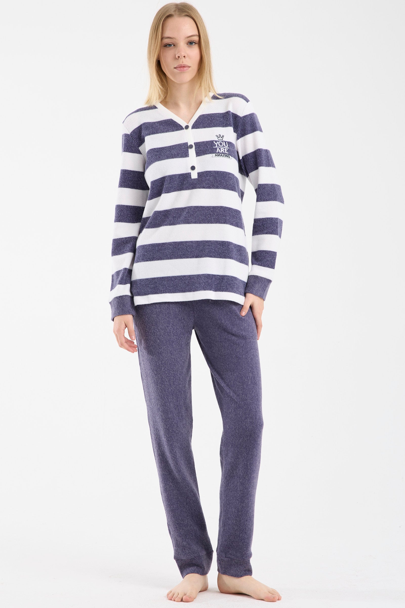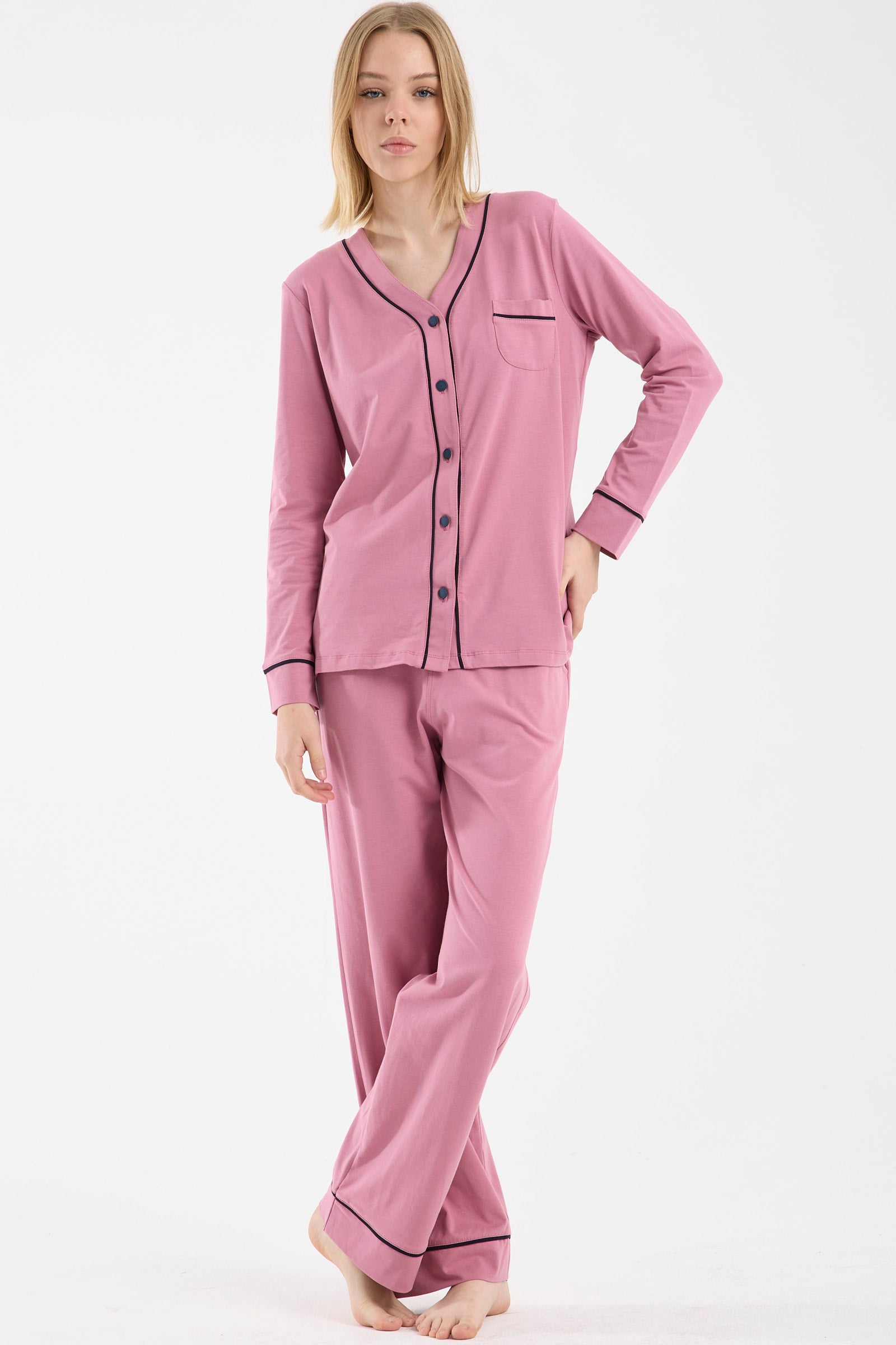 Pijamalarında çizgili desenlerin eğlenceli görüntüsüne yer vermek isteyen kadınlar için de, kareli yahut düz çizgili tasarımlarımız sizlere kavuşacağı günü bekliyor. Birçok modelde çizgilerin ya da karelerin yoğunluğu, pijama altında toplanmış durumda. Üst kısımlar daha sade olup, yaka ve düğme detaylarıyla hareketlendiriliyor. Böyle yine şıklık namına bir denge oluşturulurken, takımın hareketli havası size de yansıyor. Bunun yanında alt kısımda düz rengin kullanıldığı, üst kısımda desenlere yer verilen tasarımlarımızda yok değil. Örneğin mavi ve lila renk alternatifleriyle sunulan, ceket yaka düğmeli pijama modelimiz, böyle bir arayışı olan kadınlar tarafından tercih ediliyor.