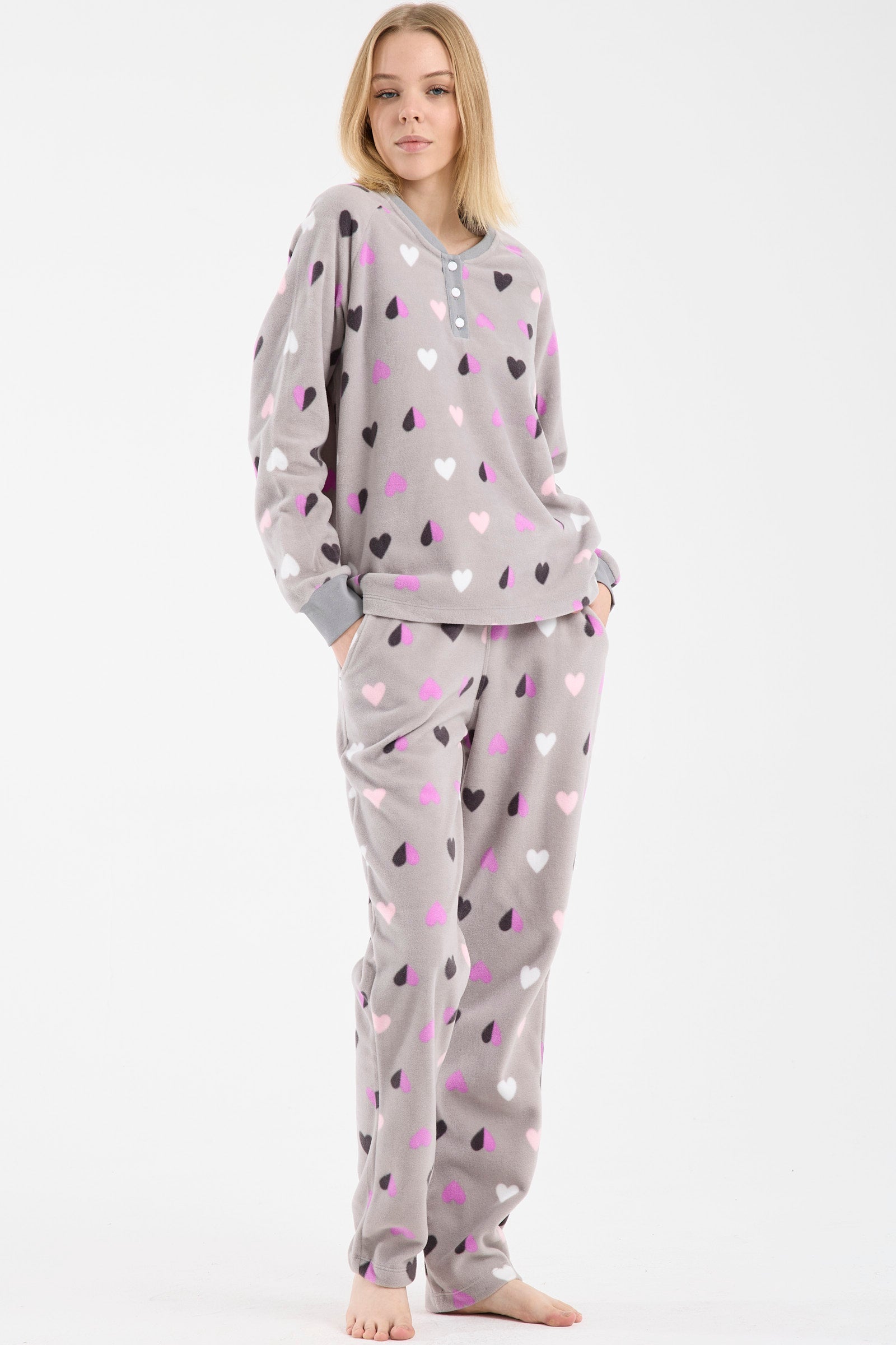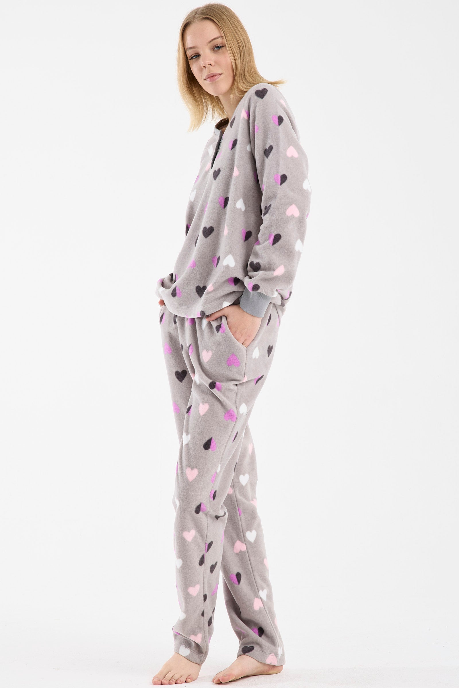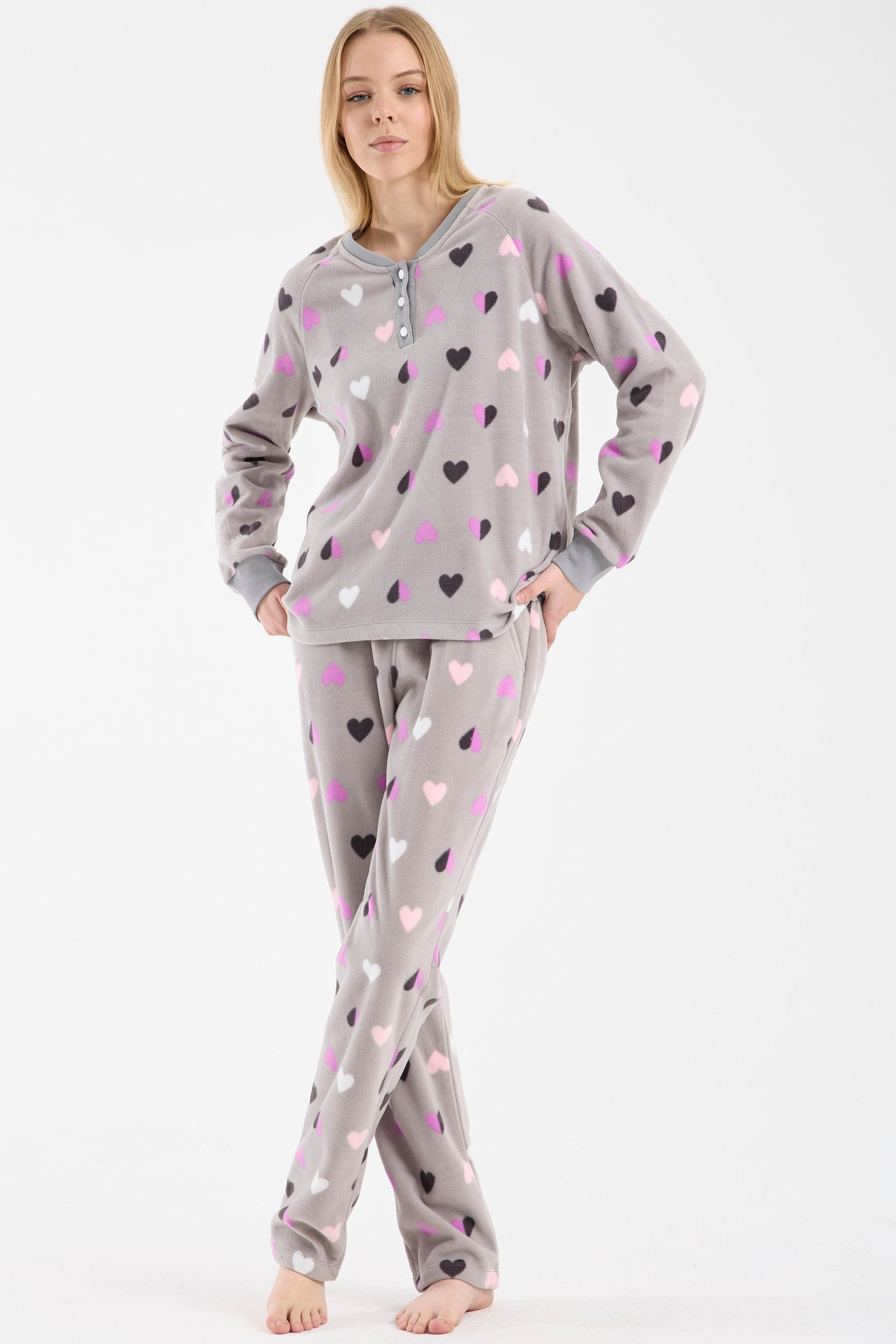 Kadın pijama modelleri söz konusu olduğunda olmazsa olmaz olan, polar pijama takımlarını da koleksiyonumuzda görüp, değerlendirebilirsiniz. Örneğin yelekli üçlü polar pijama takımı, soğuk kış gecelerinde sizi sıcak tutarken, şıklığınıza şıklık katmak üzere özel olarak tasarlandı. Bu ürünümüz, lacivert, antrasit, gri ve saks gibi renk seçenekleri ile satışa sunulmuş durumda. Oldukça da beğeniliyor!