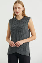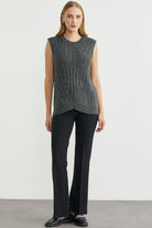Sıfır yaka, tunik boy triko süveter. Omuzları açık, ön bedeni verev kesim. Yumuşak dokulu.