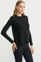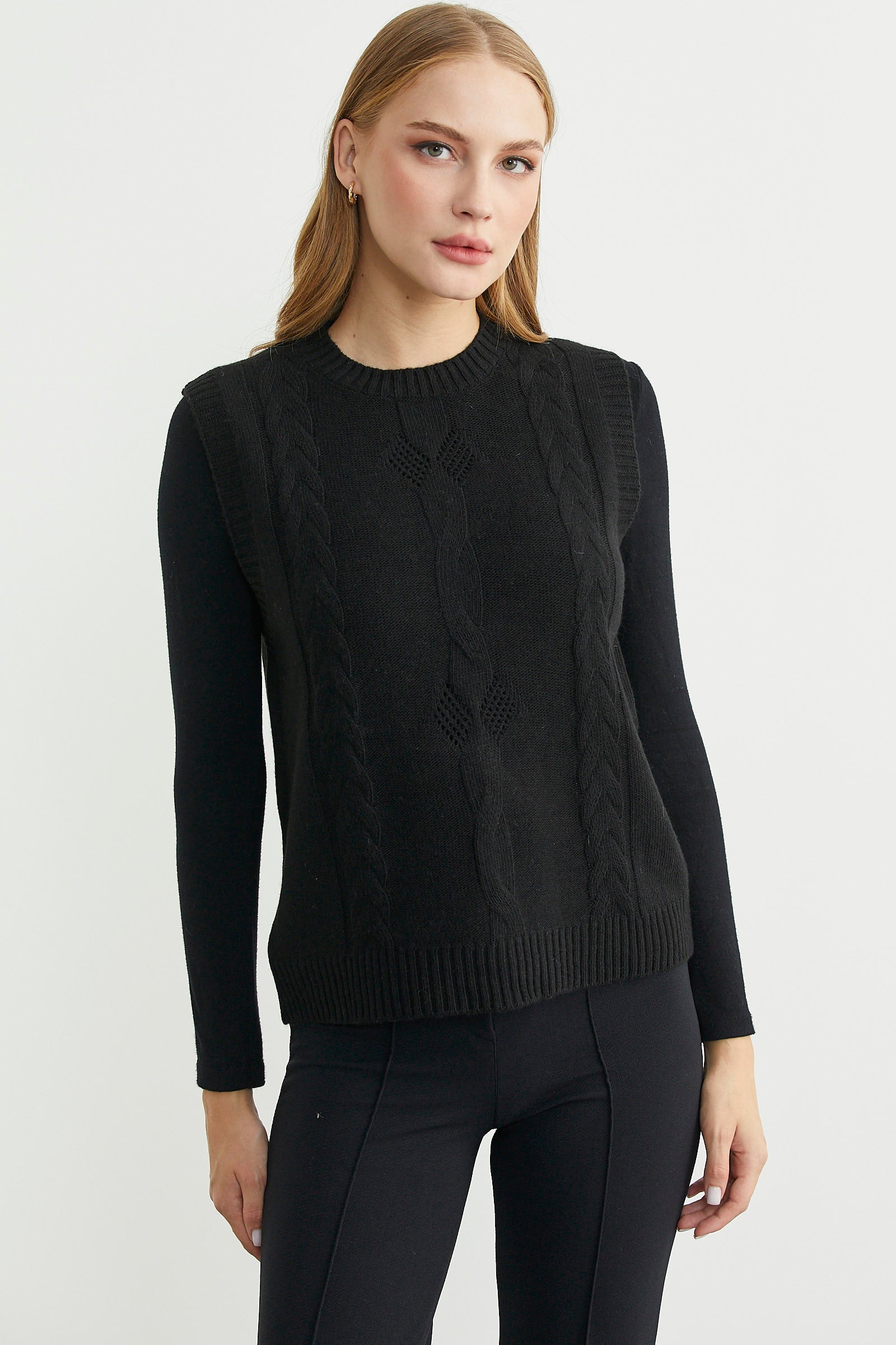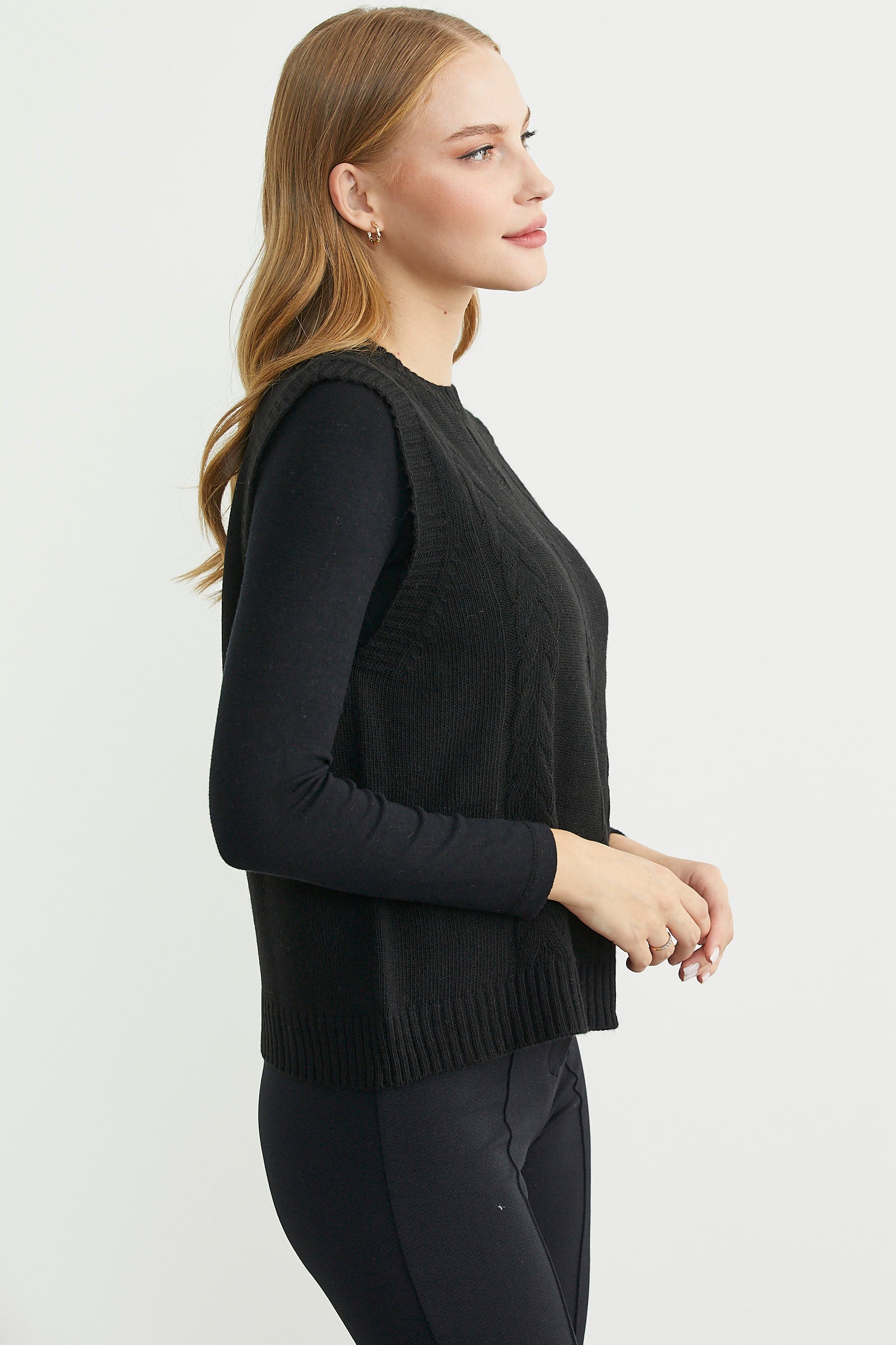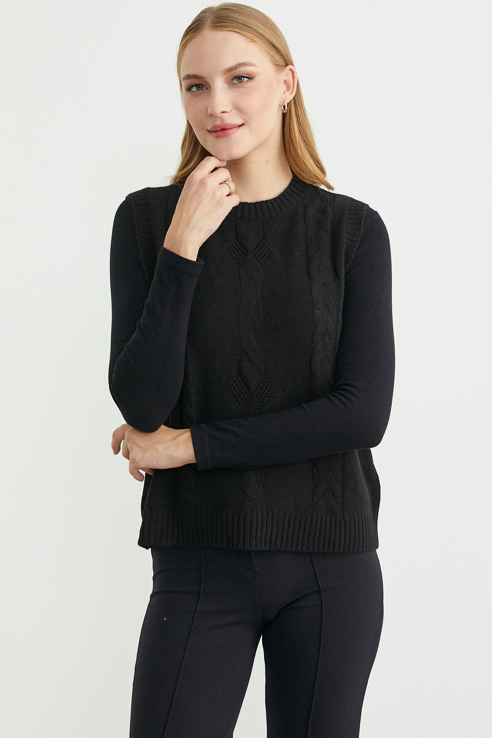 Bisiklet yaka, kolsuz triko süveter. Fitilli bitişlere sahip. Standart fit.
