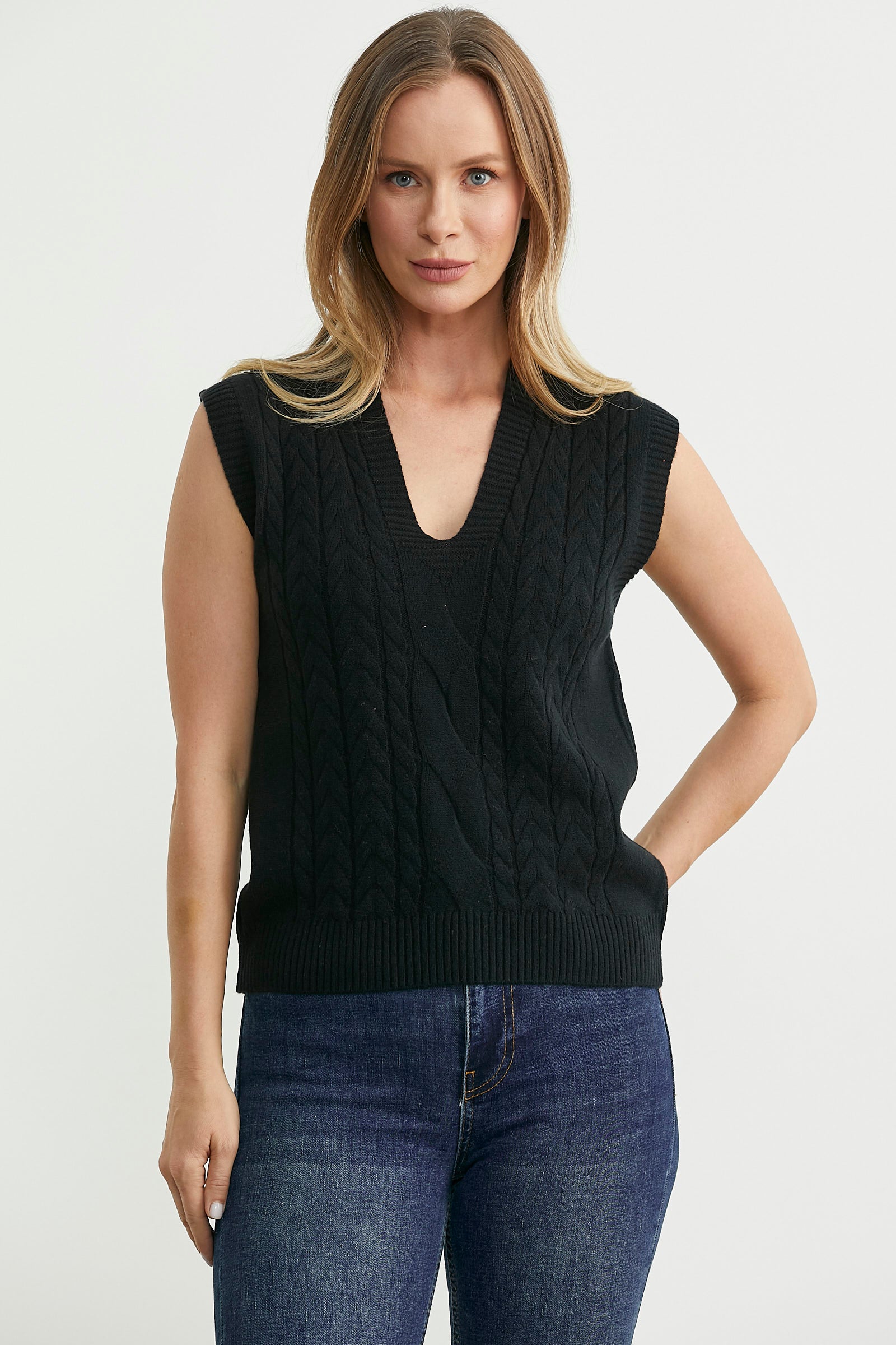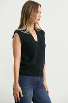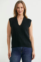 V Yaka Saç Örgü Triko Süveter - Siyah