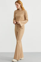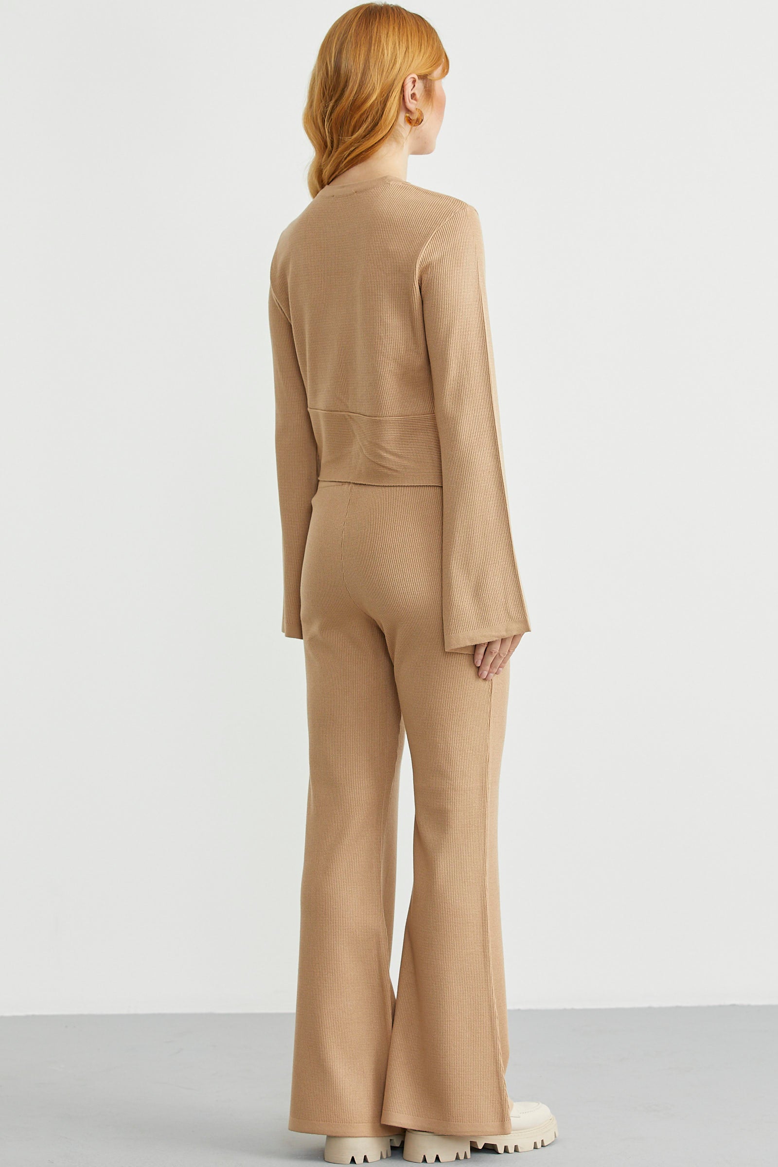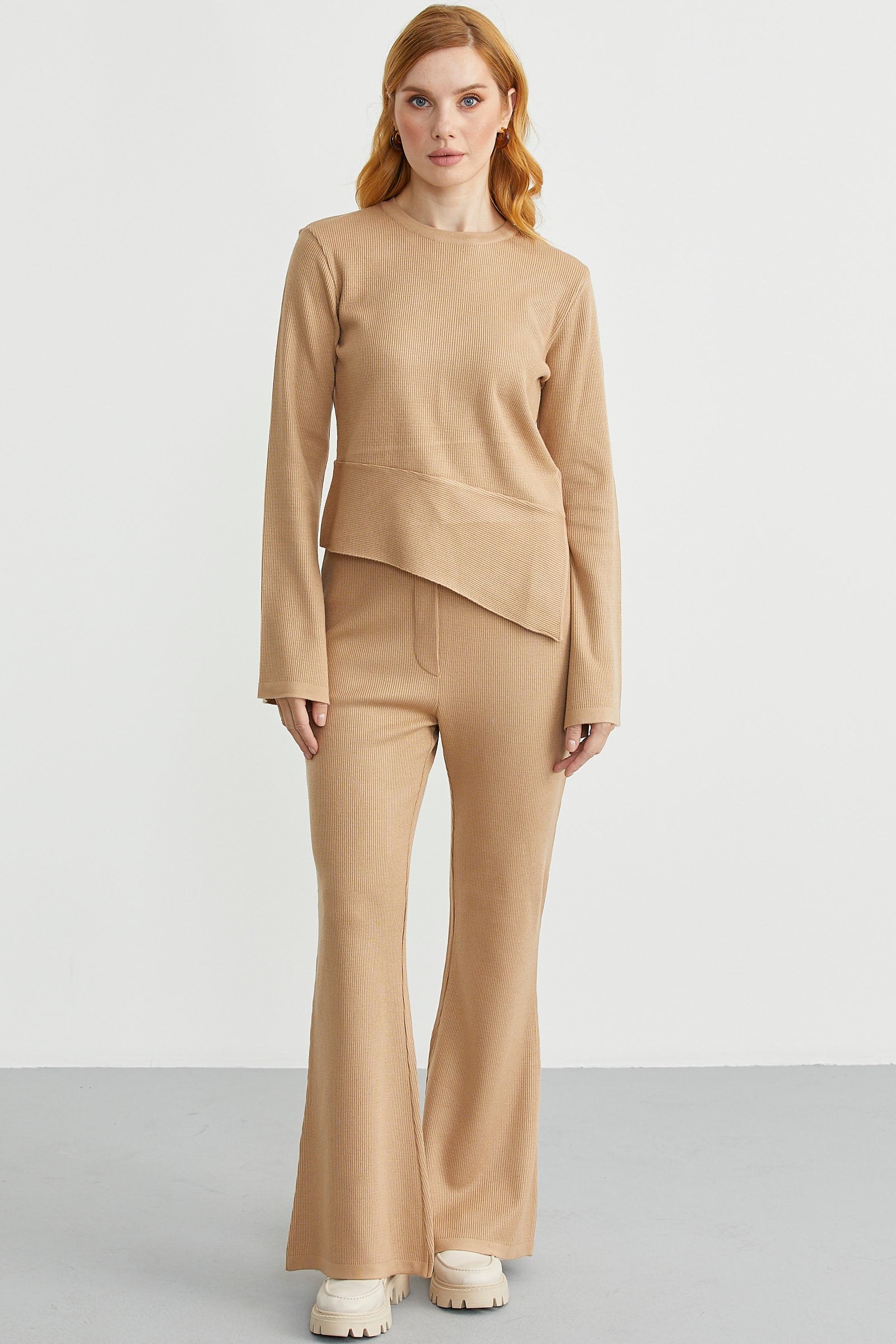 İkili triko set. Verev üst, triko pantolondan oluşmaktadır. Mevsimlik, fitilli modeldir.