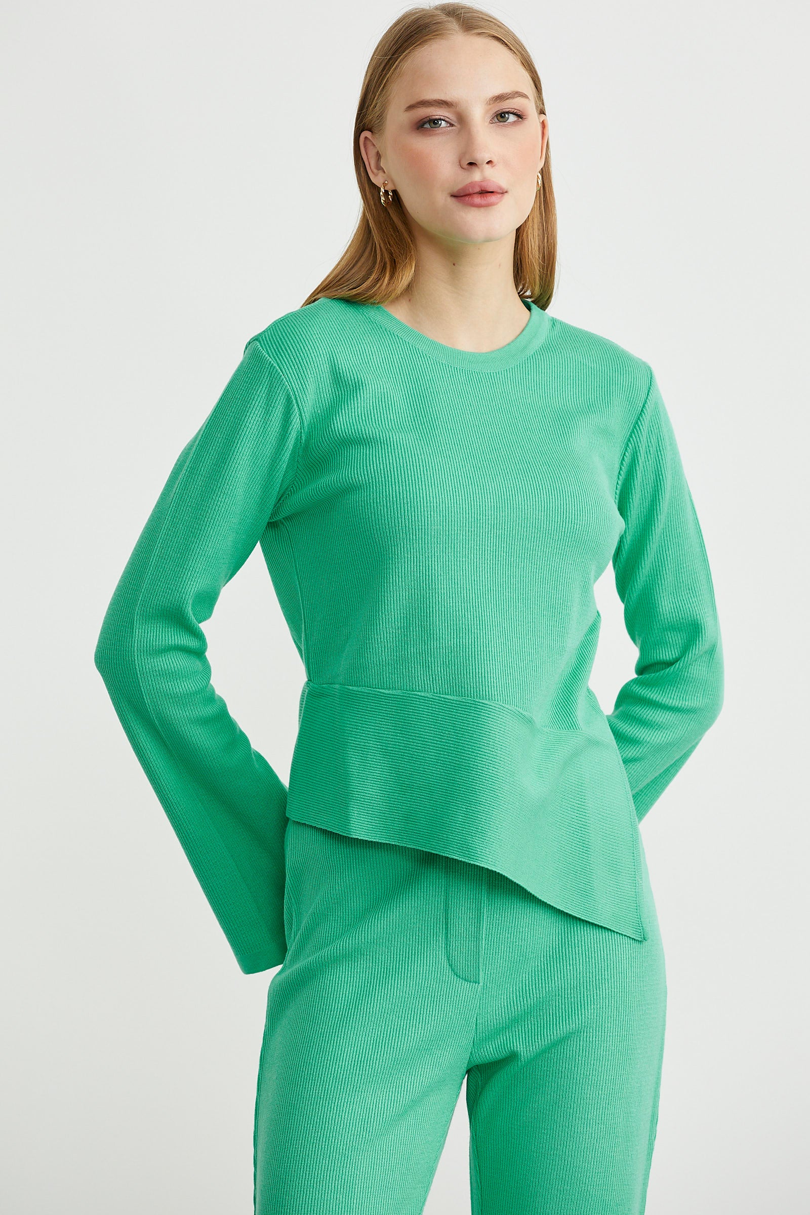 İkili triko set. Verev üst, triko pantolondan oluşmaktadır. Mevsimlik, fitilli modeldir.