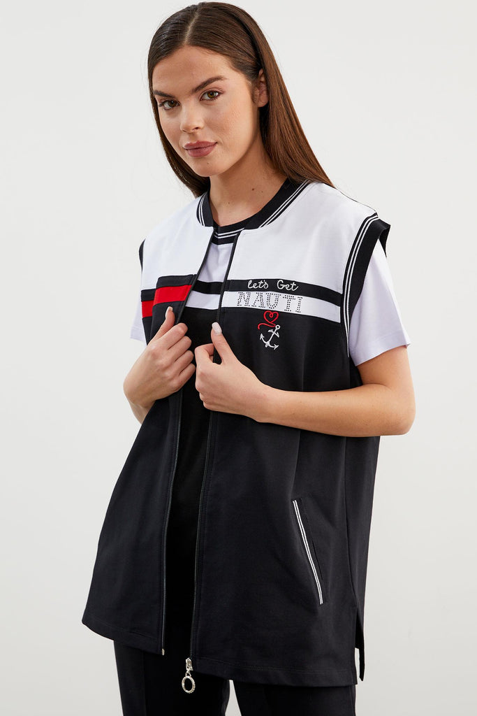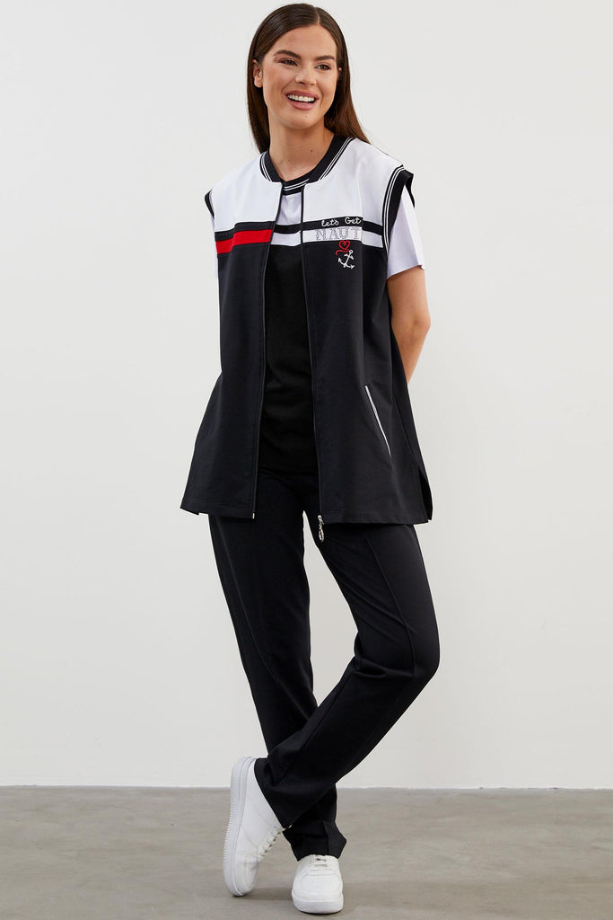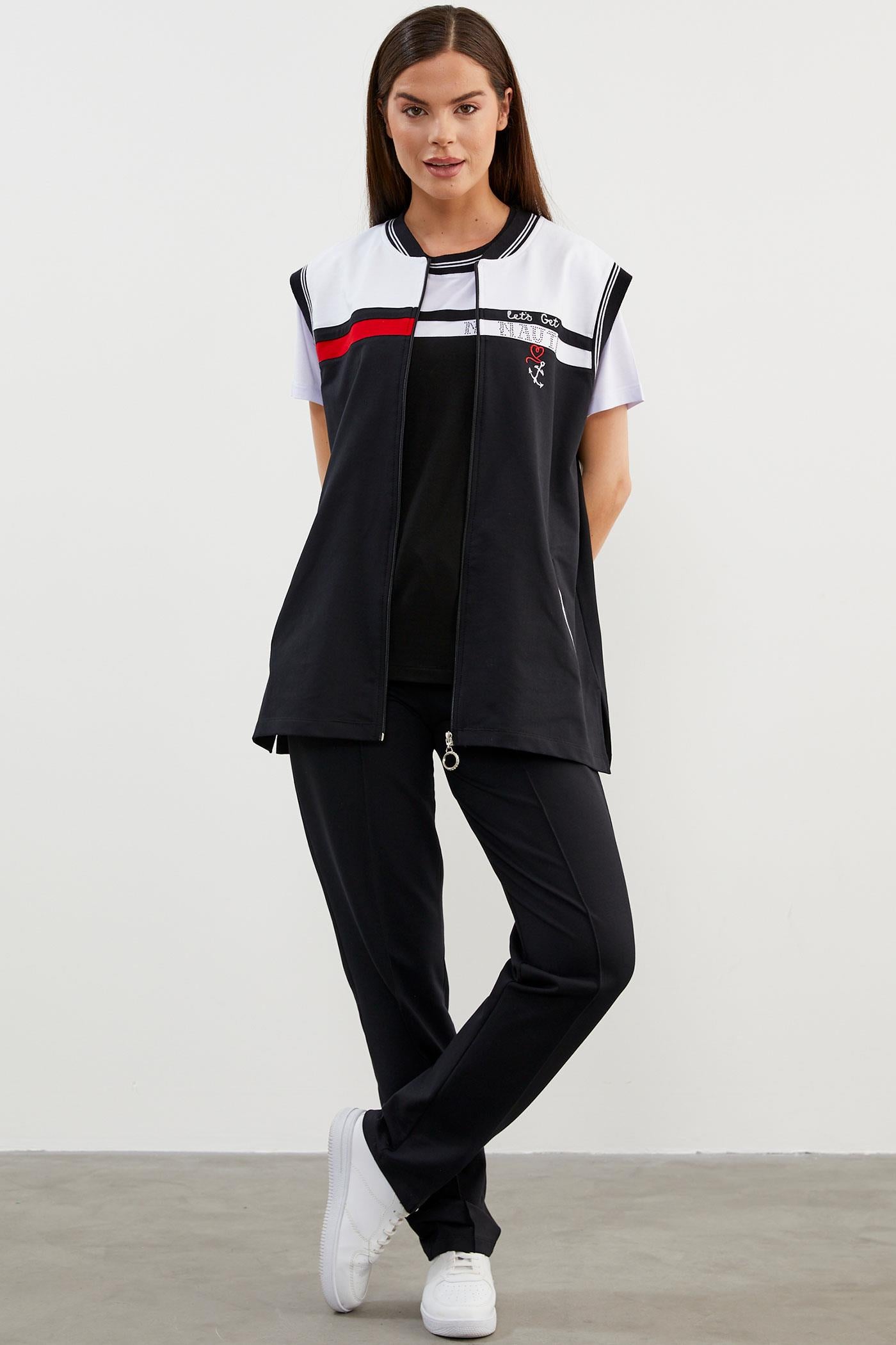 Yakası ve kol ağızı ribanalı, önü fermuar kapamalı yelek. Sıfır yaka, kısa kollu, taş detaylı tshirt ve beli lastikli, iki adet cebiyle konforlu kullanım sunan eşofman altından oluşan takım.