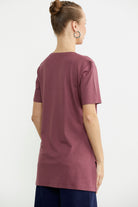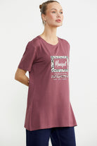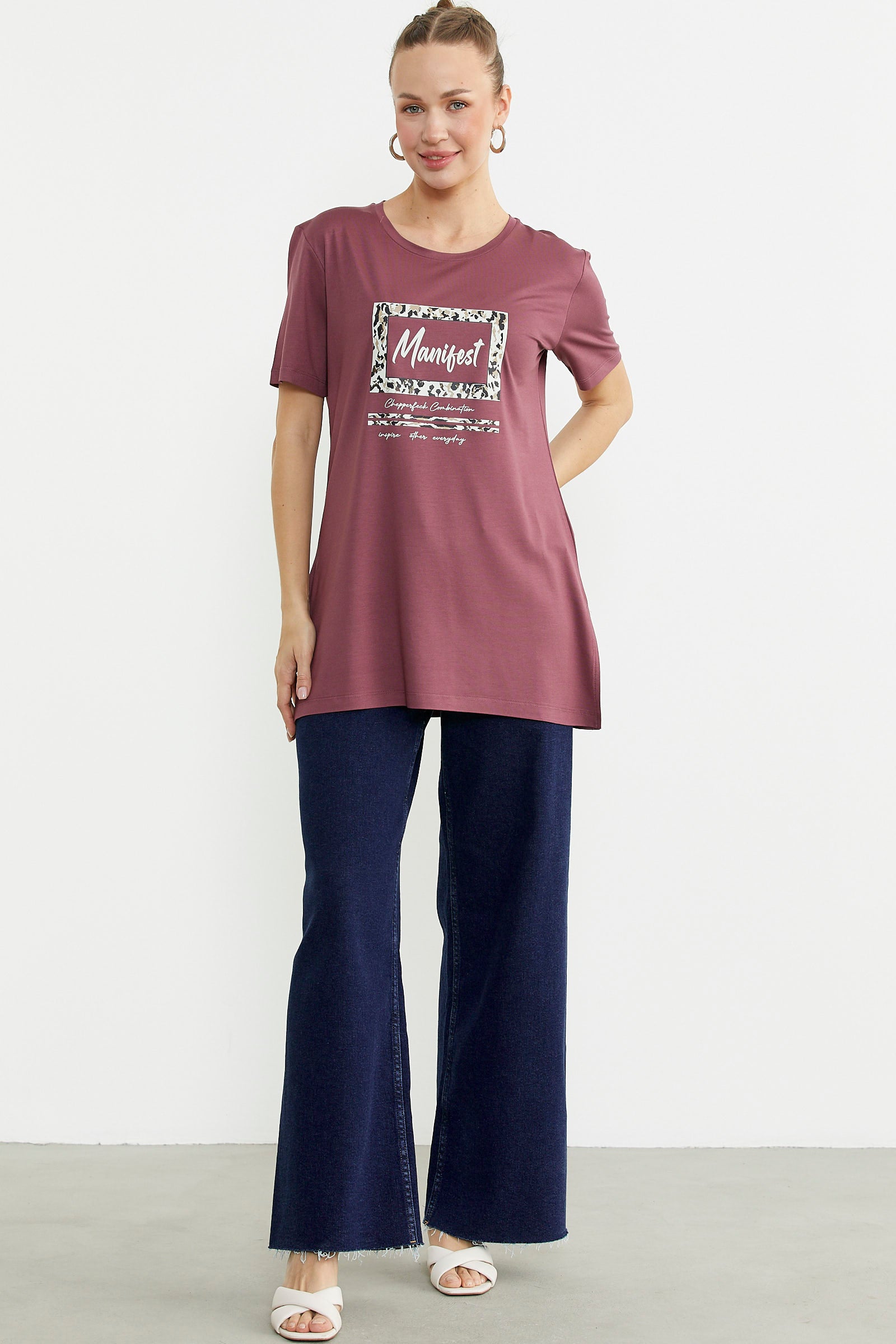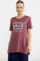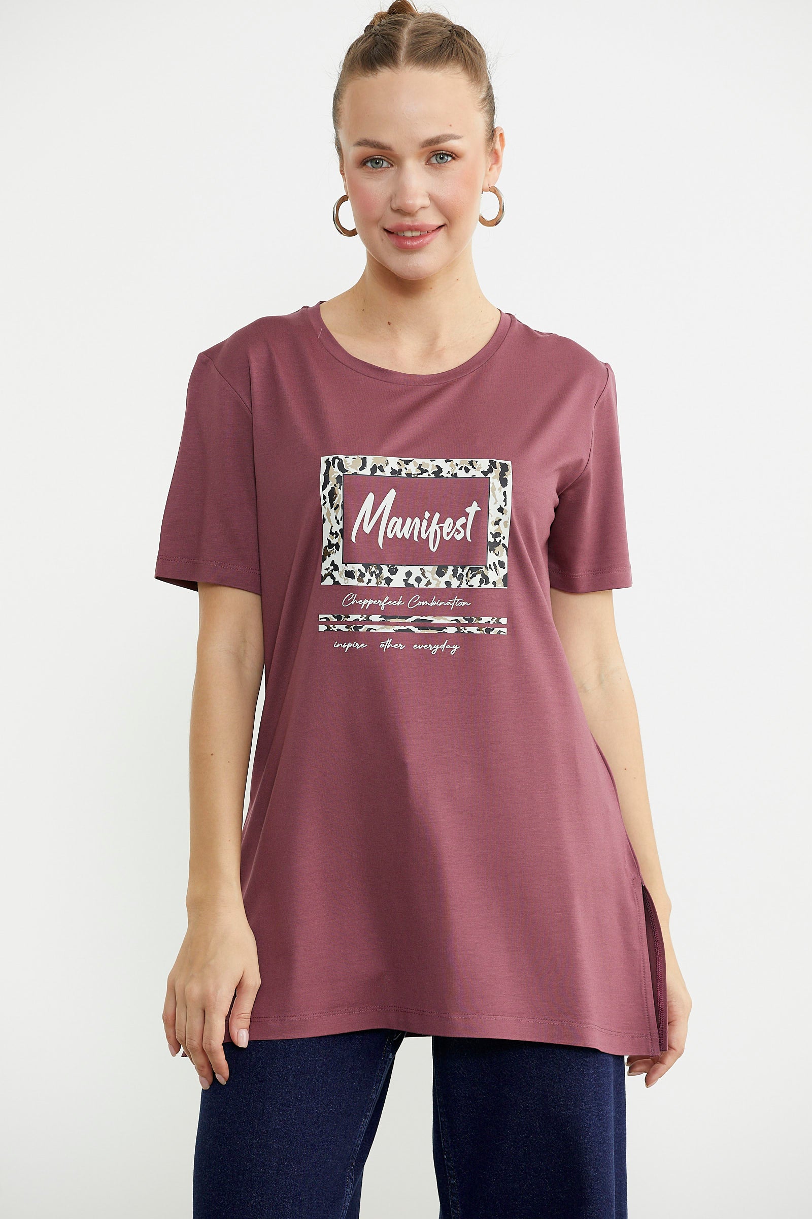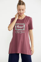 Göğüs hizasında konumlanan baskı detaylı tişört, tunik boydur. Etek ucundaki yırtmacıyla rahat bir kullanım sunar.