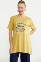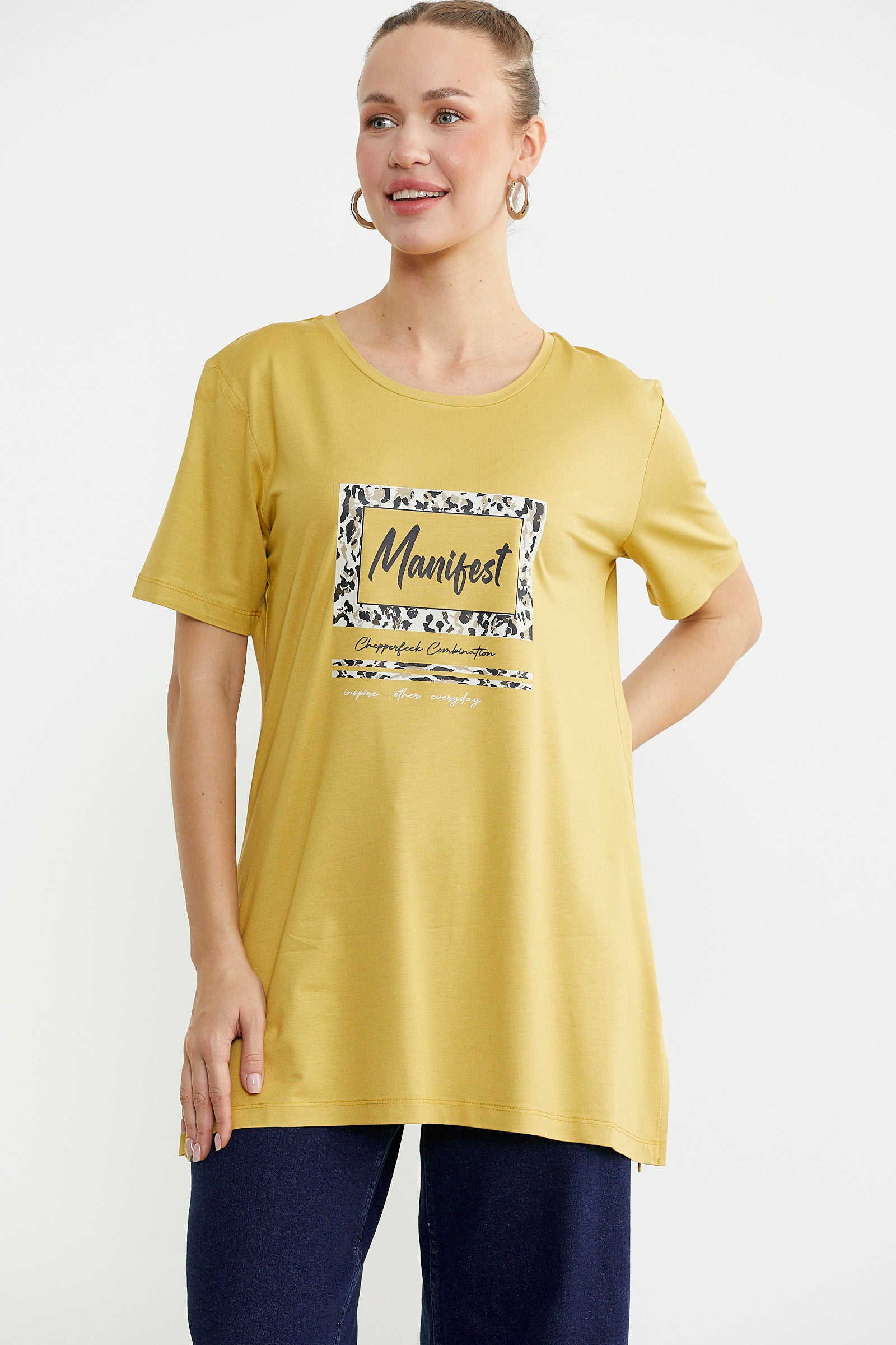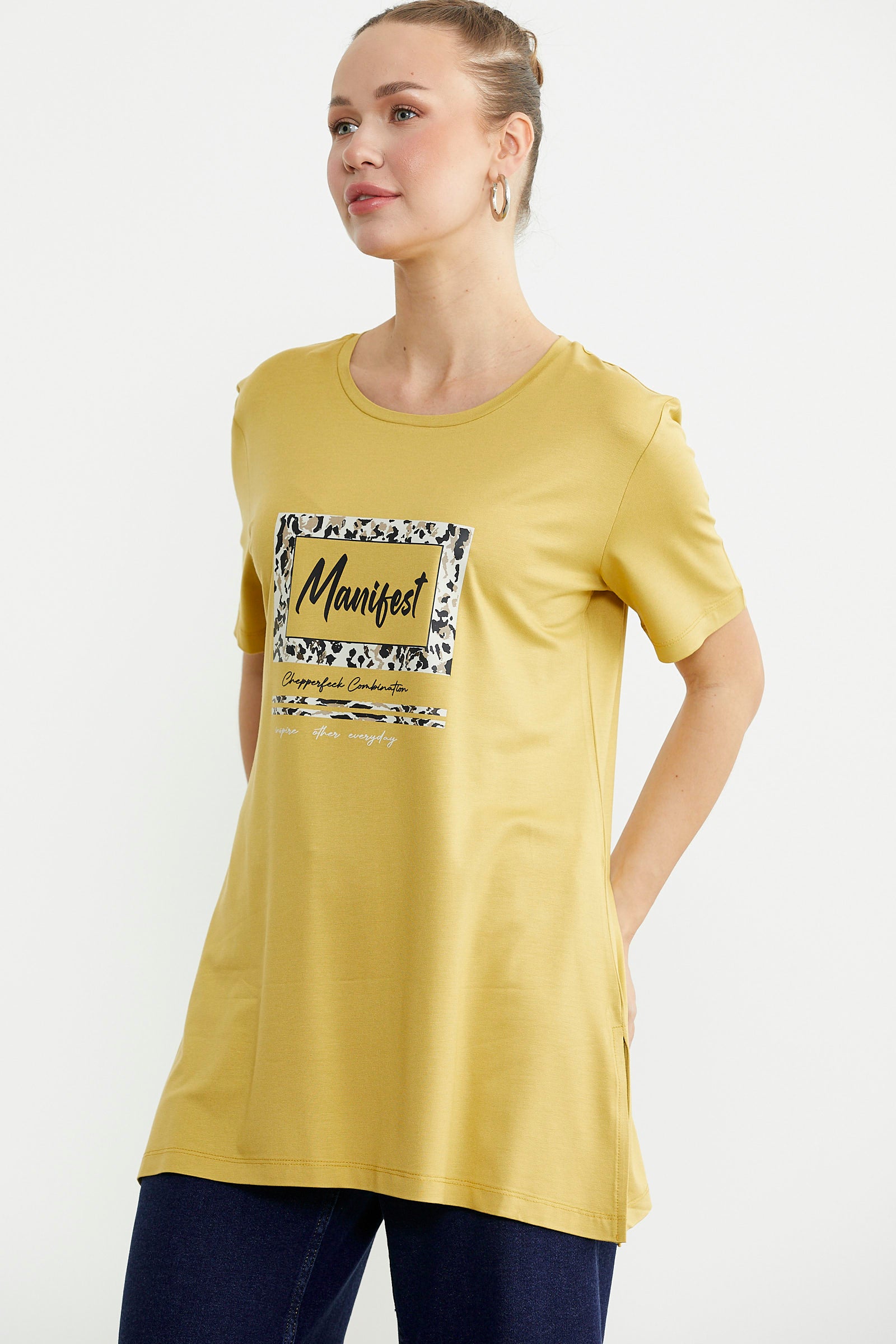 Baskılı Bisiklet Yaka Tunik Tişört - Hardal