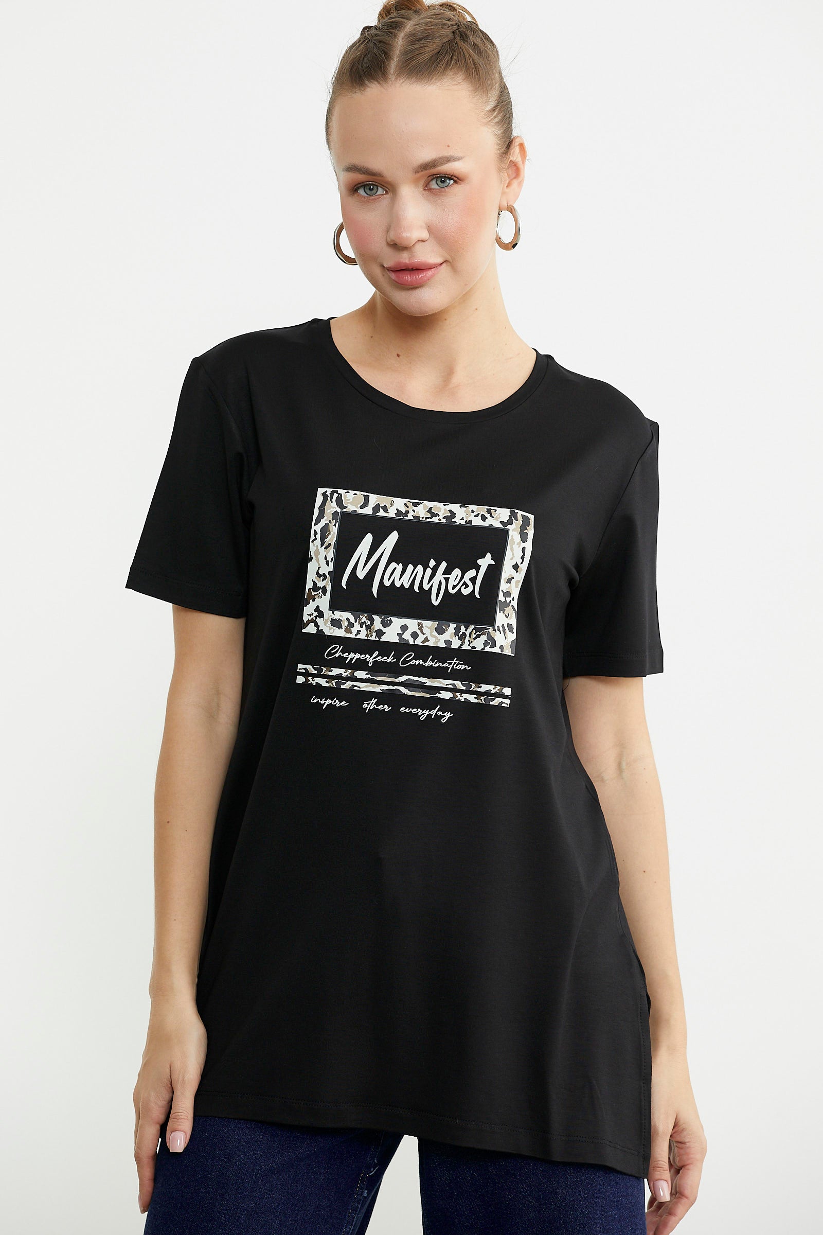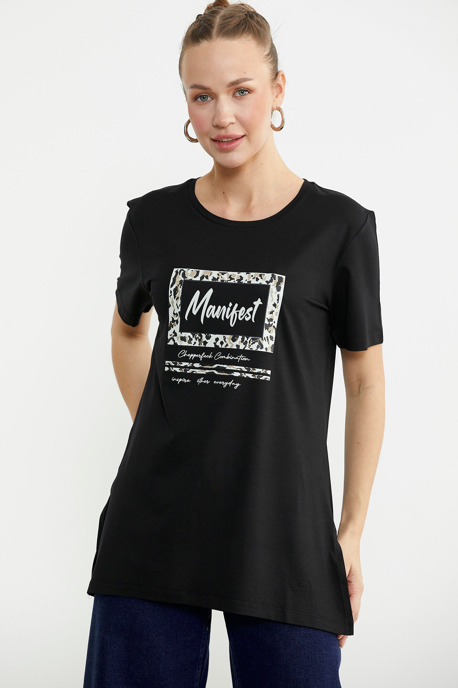 Göğüs hizasında konumlanan baskı detaylı tişört, tunik boydur. Etek ucundaki yırtmacıyla rahat bir kullanım sunar.