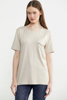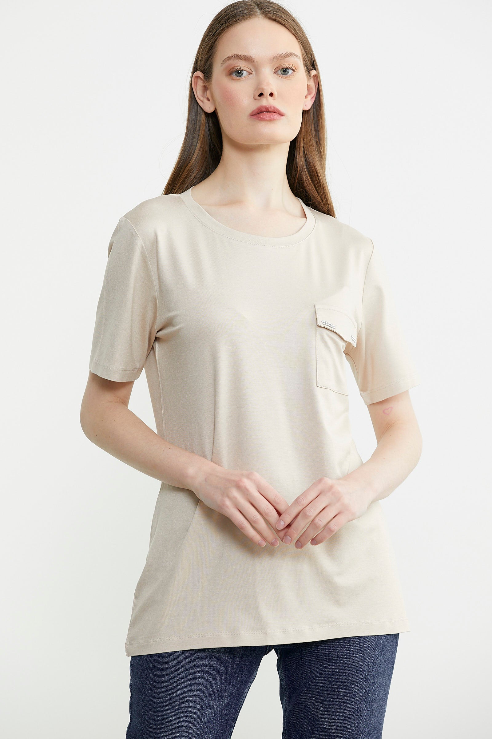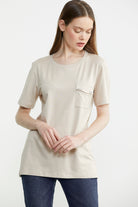 Cep Detaylı Sıfır Yaka Penye Tişört - Bej