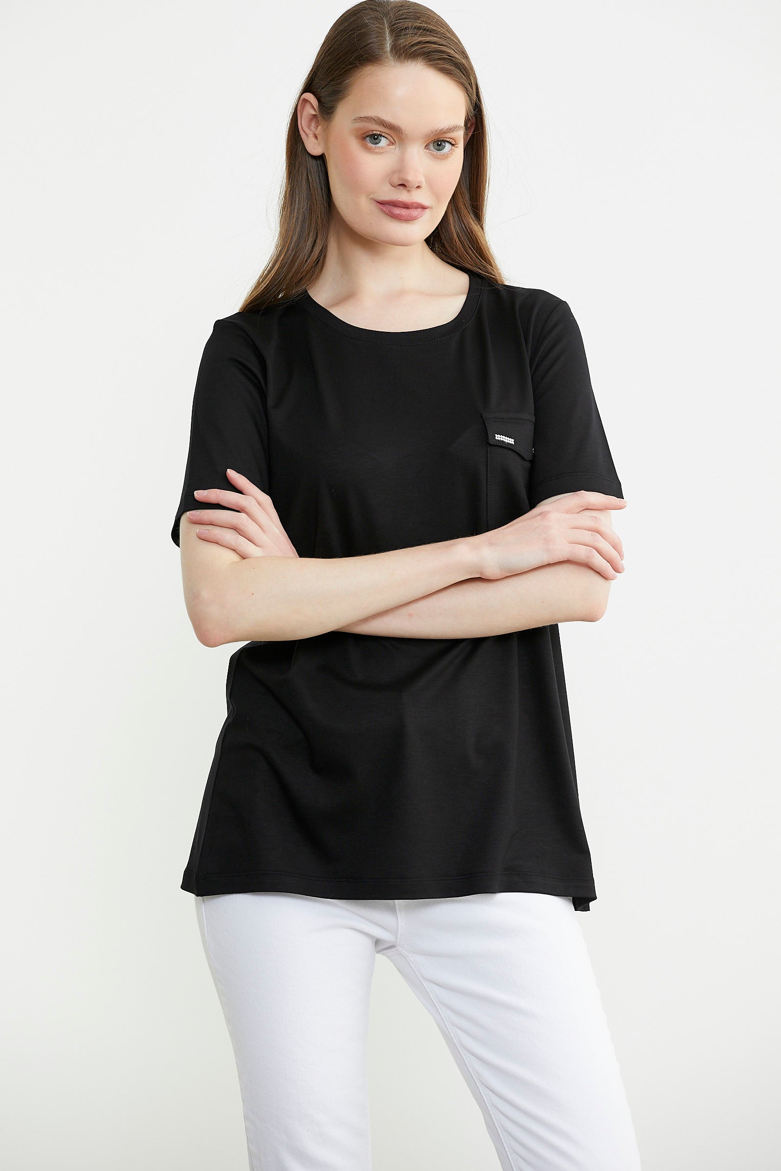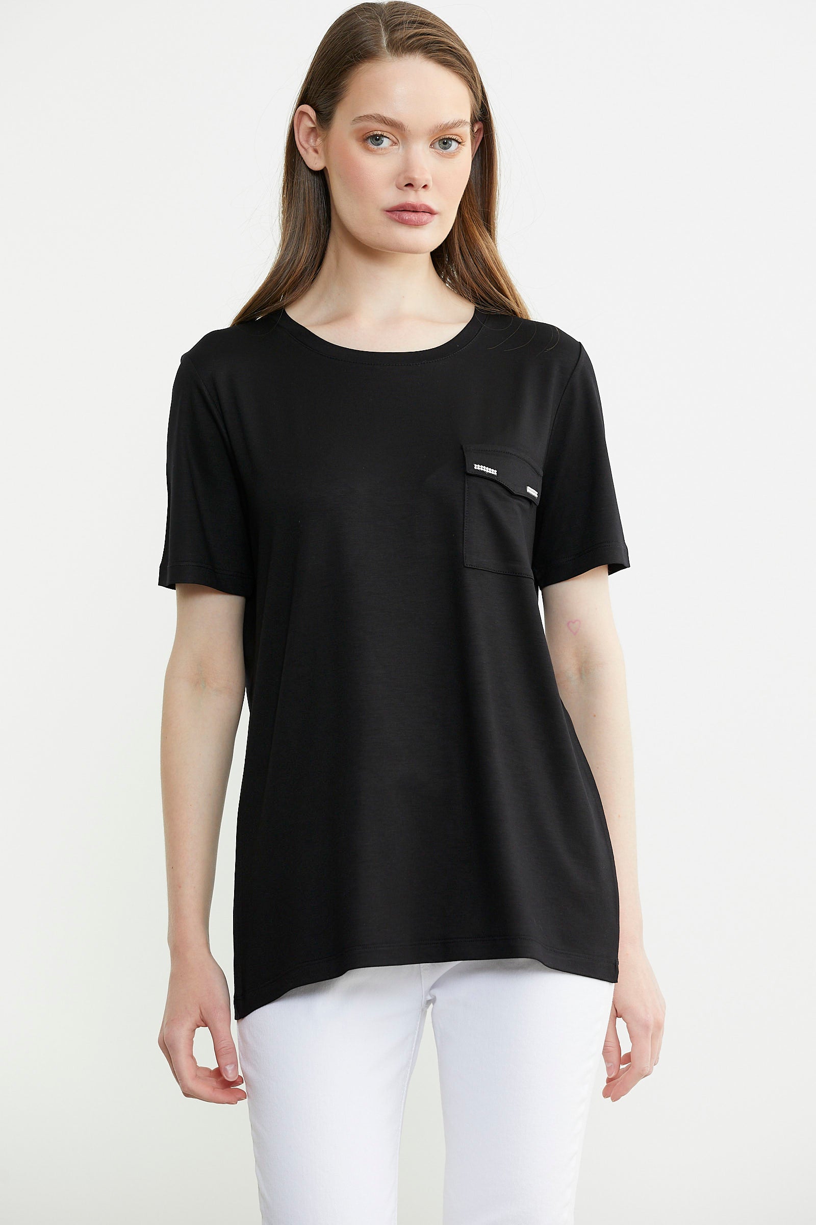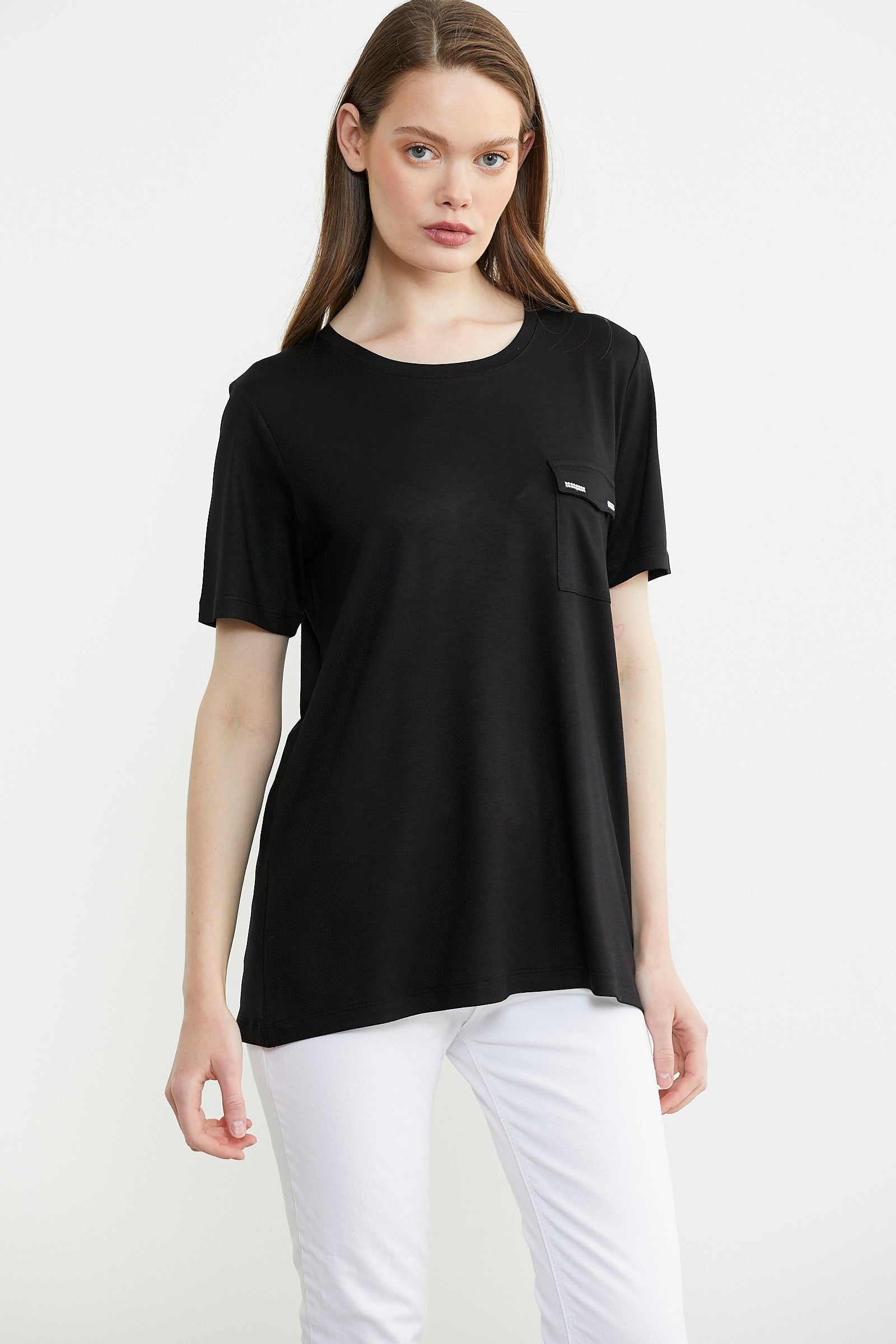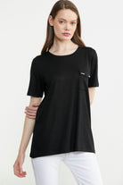 Cep Detaylı Sıfır Yaka Penye Tişört - Siyah