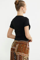 Kısa kollu, yuvarlak yaka tişört ayarlanabilir çıt çıt detaya sahiptir. Fitilli kaşkorse kumaşı ile tarzınızı tamamlayacak kurtarıcı basic bir parça.