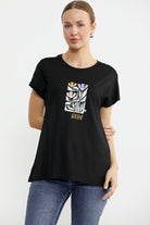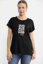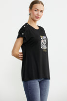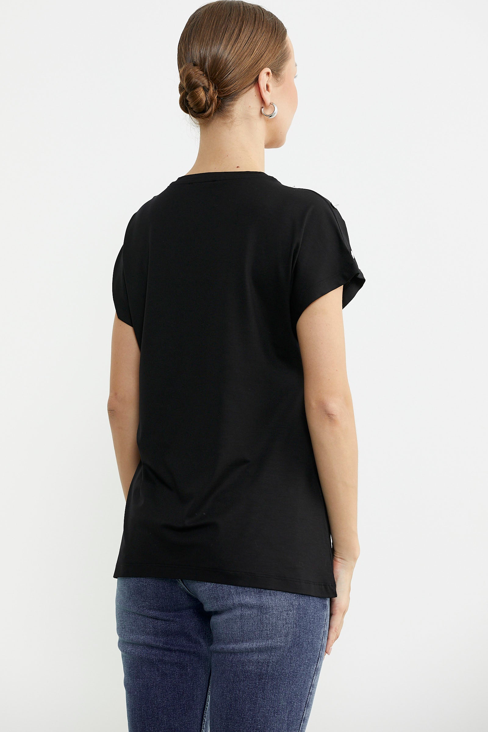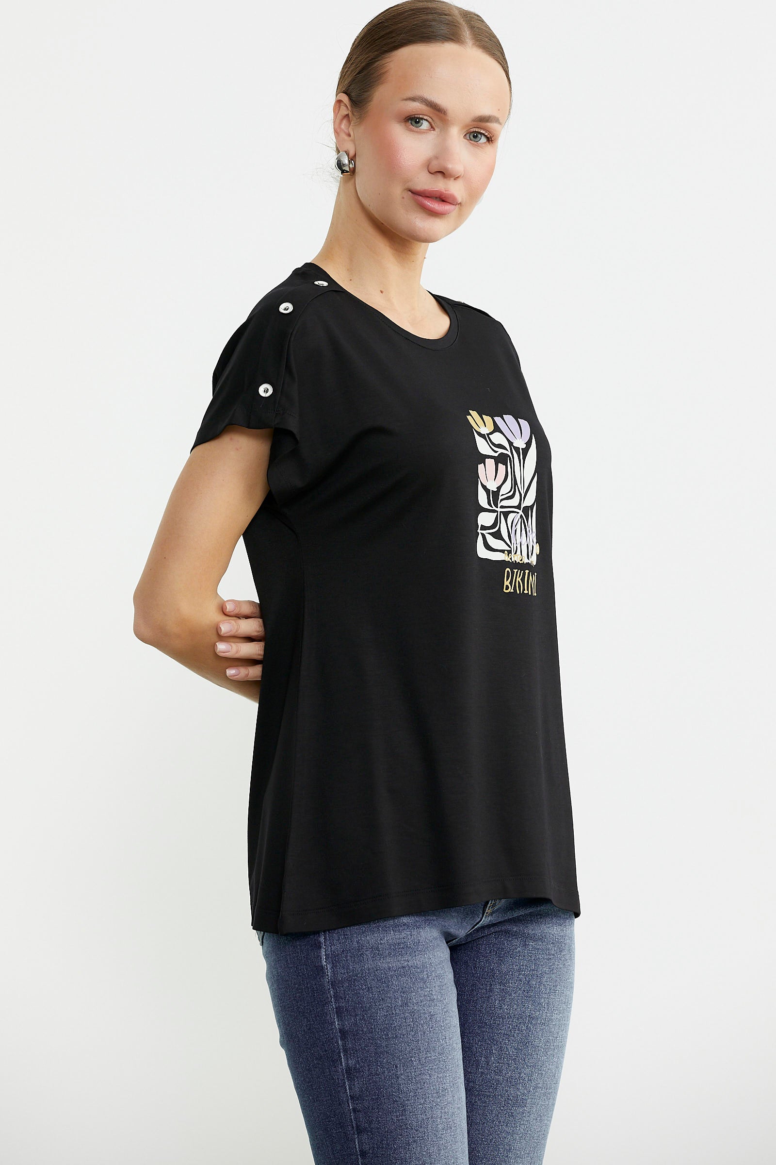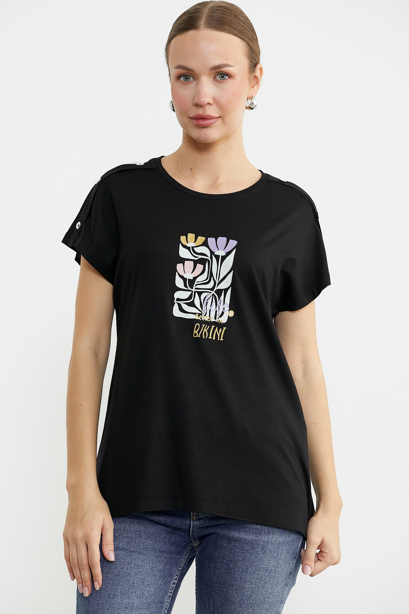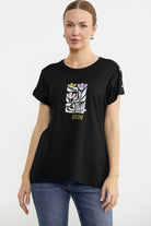 Omuz Detaylı Baskılı Penye Tişört - Siyah