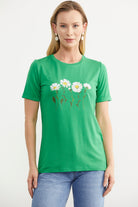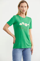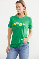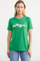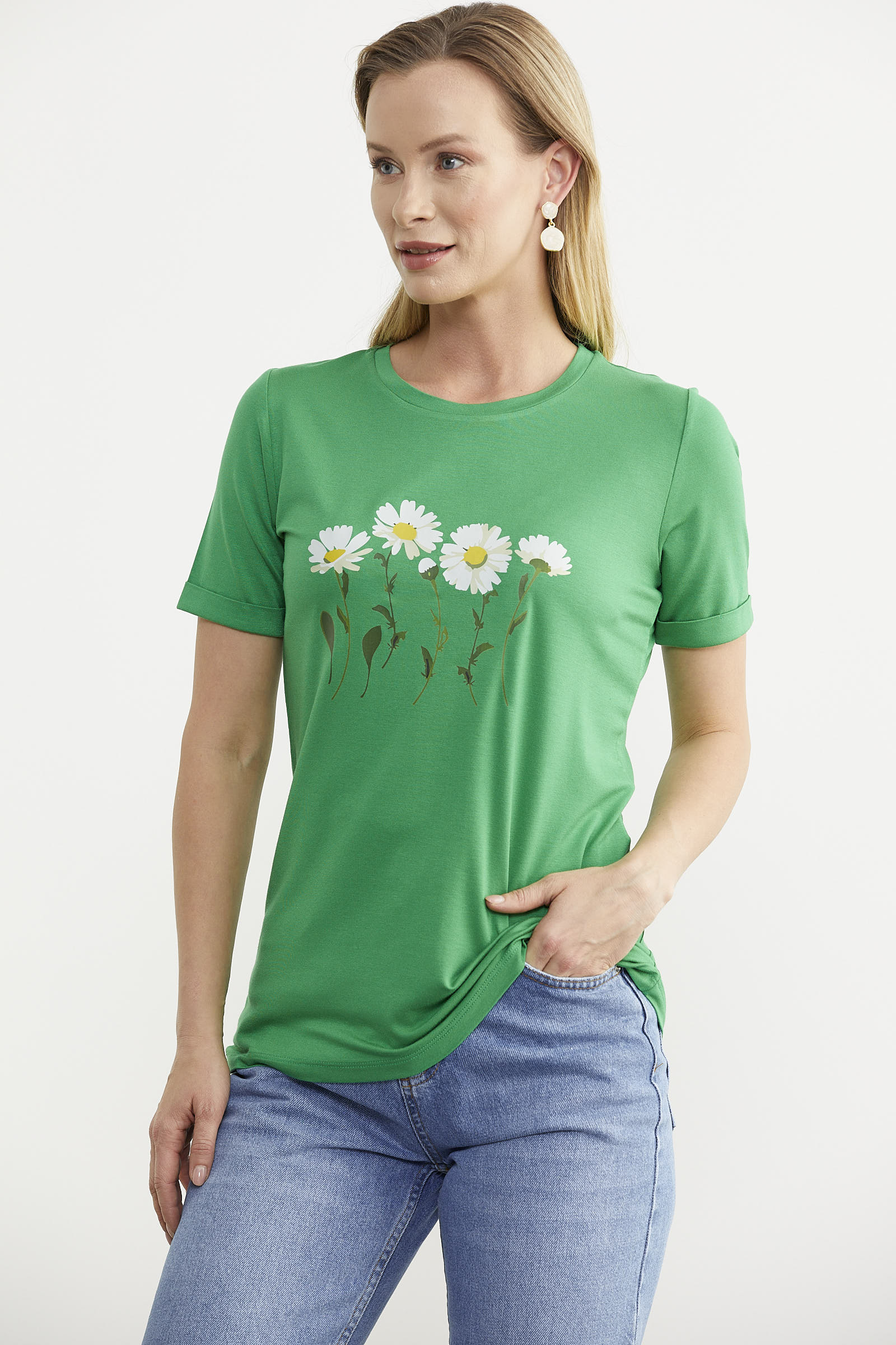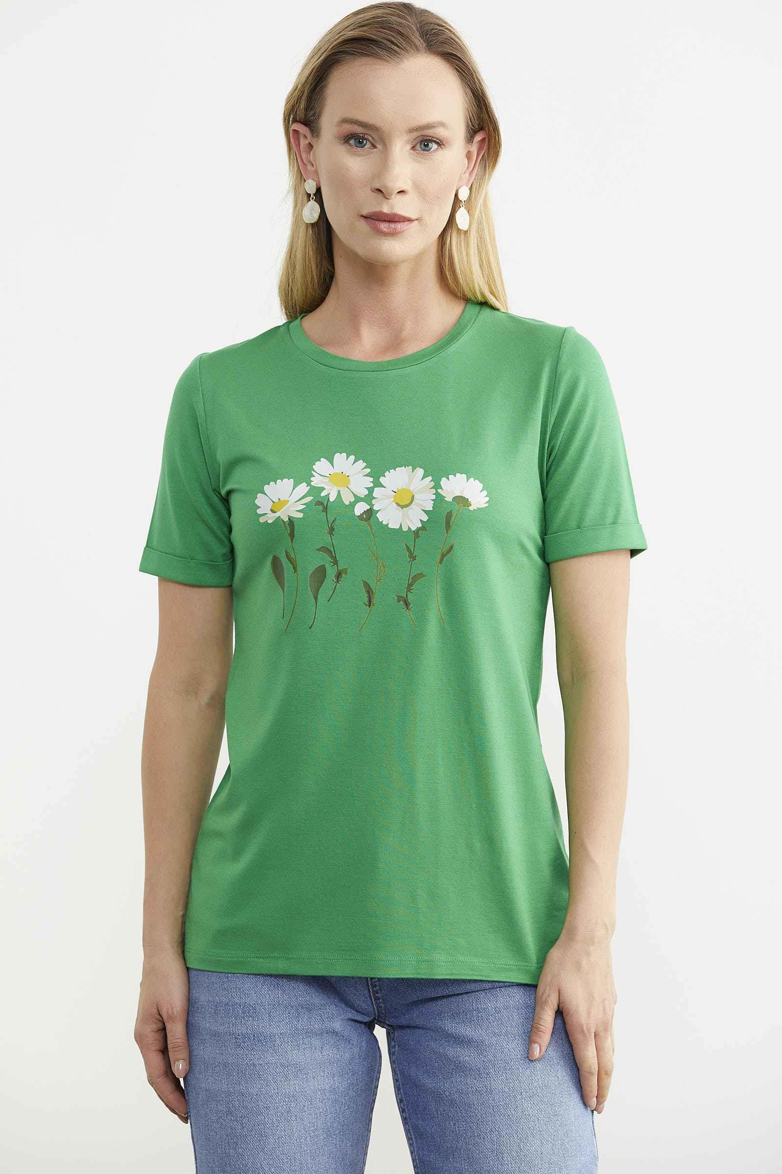 Yaz mevsiminin doğasıyla uyumlu papatya baskılı basic tişört, gardıroplarınızın kurtarıcı parçası olacaktır.