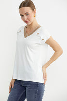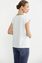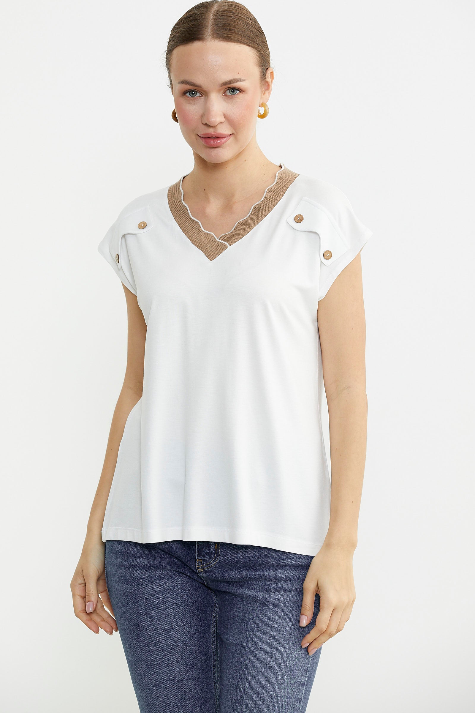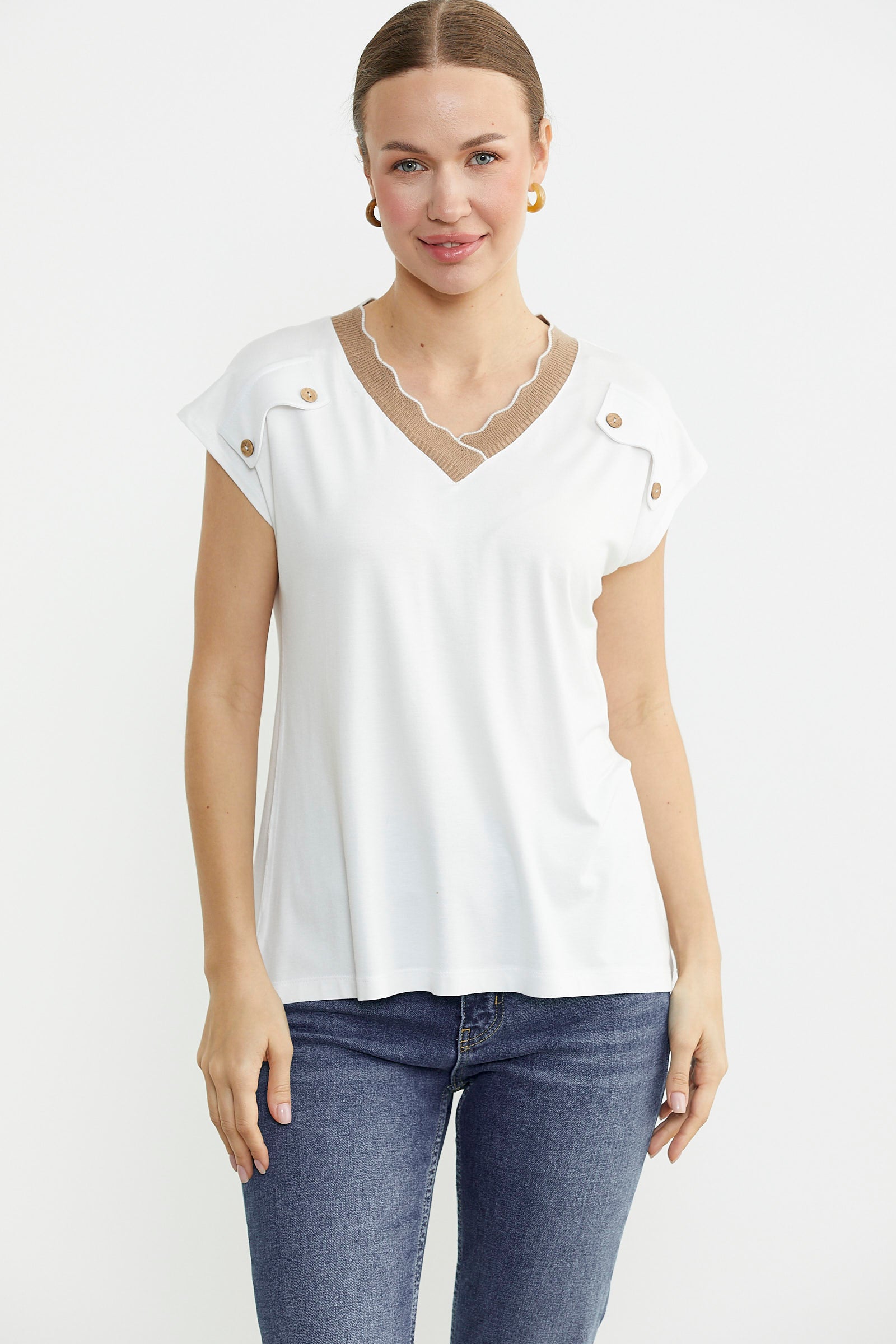 Triko Yaka Kombinli Penye Tişört - Ekru