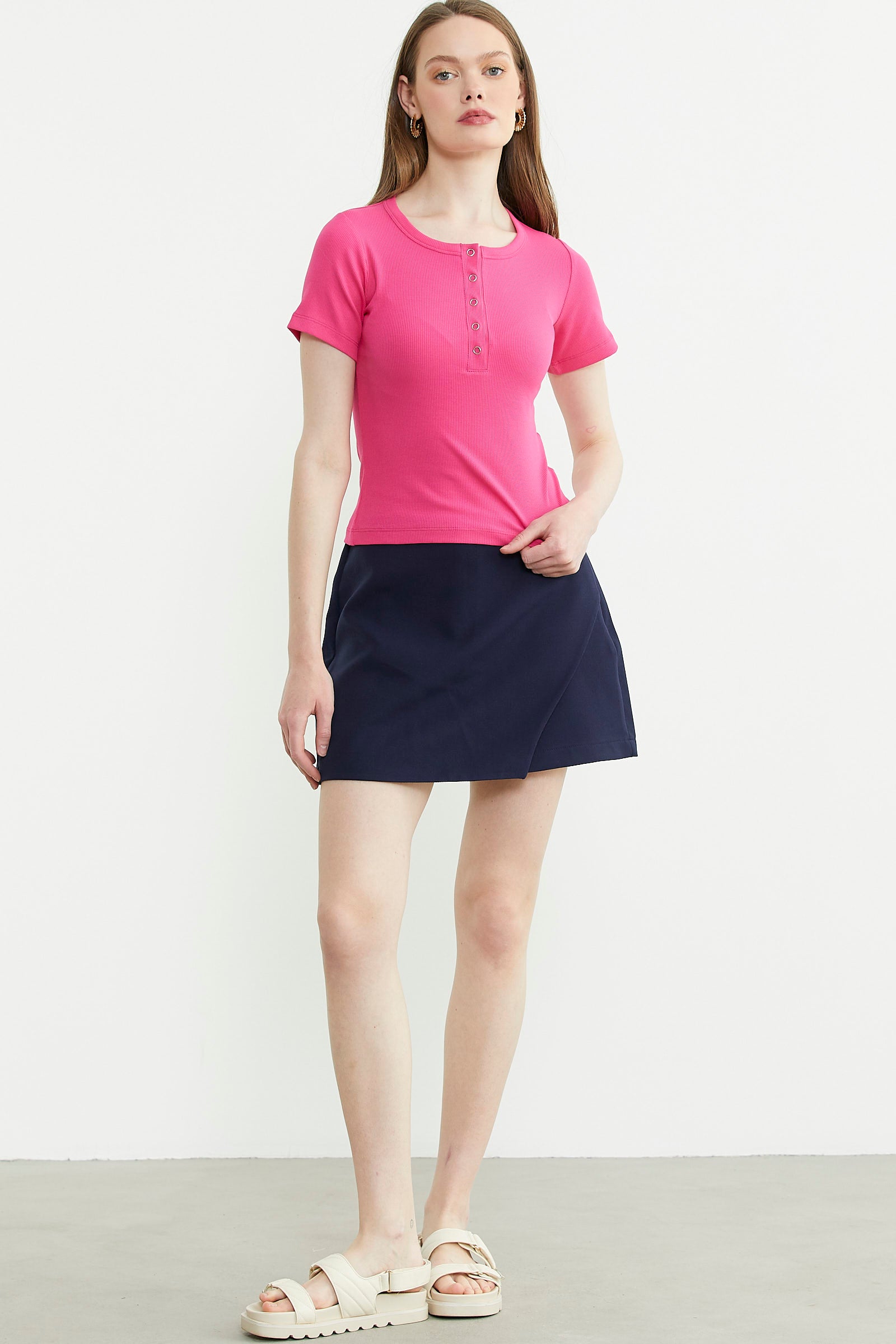 Sementa olarak sizler için hazırladığımız kategoride beğenilerek giyilen kadın tişört modelleri mevcuttur. Düğmeli ve askılı tişörtler, bu modeller arasında ilk sıralarda yer alır. Son birkaç sezondur yükselişe geçmiş olan bu tasarım basit ve sportif bir havaya sahiptir. Gündelik kullanım için ideal olan askılı düğmeli tişörtler, birçok farklı kıyafetle kombinlenebilir. Kombin kolaylığı sağlayan özelliklerden birisi, uyumlu renklere sahip seçeneklerinin bulunmasıdır. Kategorimizden siyah, gri ve beyaz renk alternatiflerine ulaşmanız mümkündür. Üç tonun da geniş bir renk skalasıyla uyum içerisinde kullanılması, yazın her kombinde bu parçalara yer vermeyi mümkün kılar. Farklı üst giyim parçalarında alt katman olarak kullanabileceğiniz askılı tişörtler, bahar aylarında bile giyilebilir.
