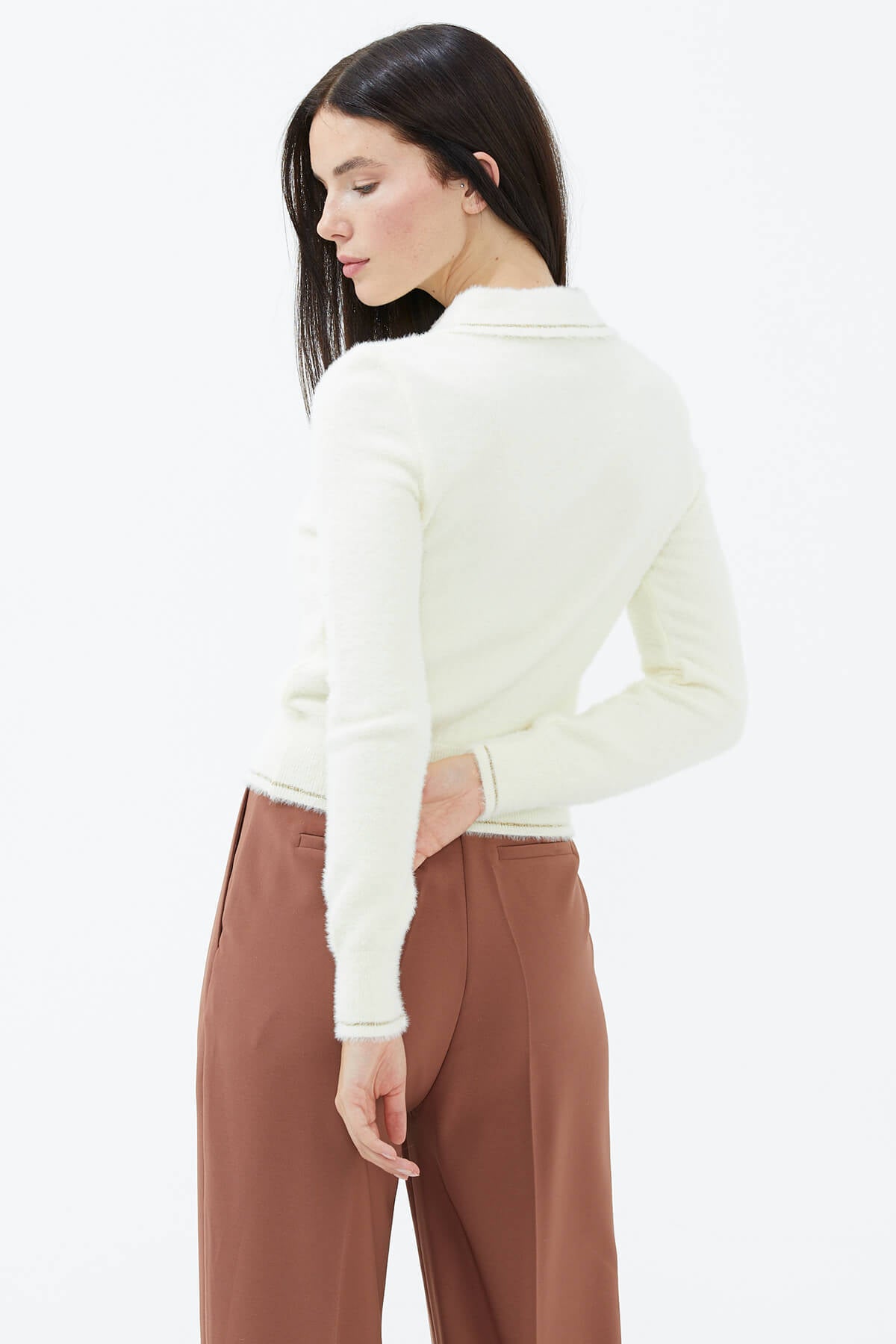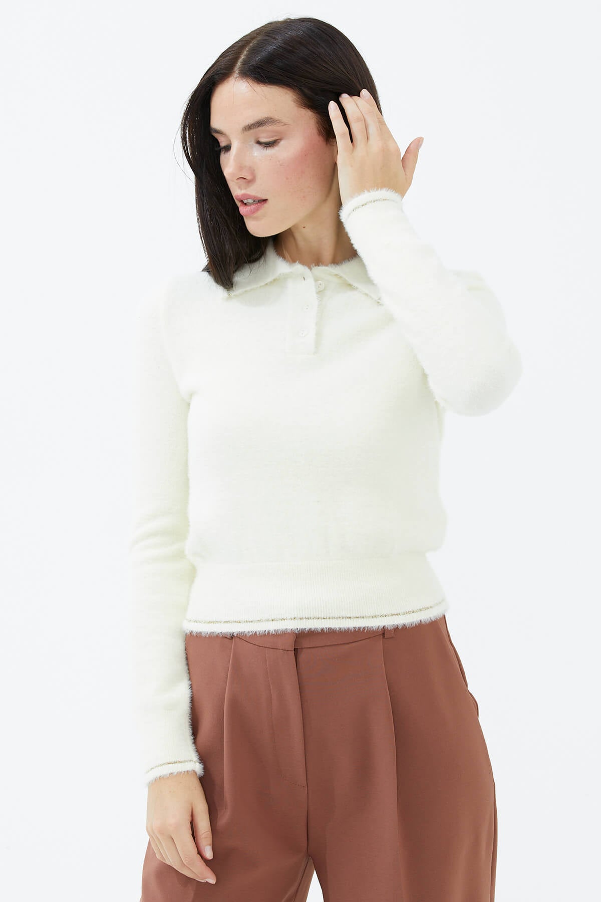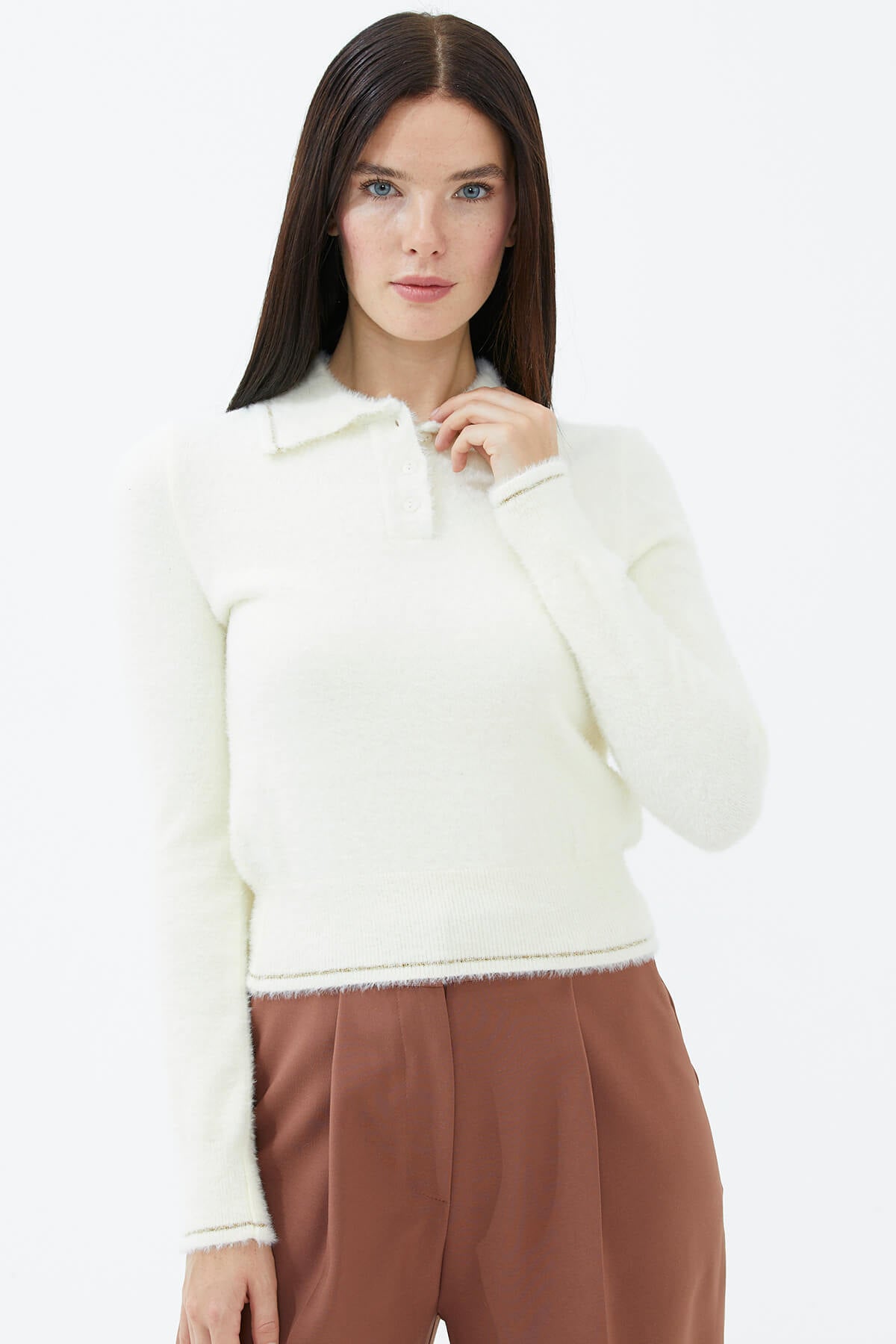 Yün karışımlı iplikten üretilen, uzun kollu, polo yaka, düğme kapamalı triko kazak. Etek ucu, manşetleri ve yakası sim iplik detaylı, yumuşak kazak.