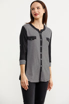 Apolet kol detaylı düğmeli tişört çizgili ve düz kumaş kombinlenerek kullanılmıştır.