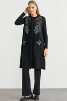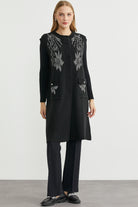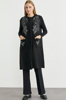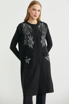 Yüksek oranda yün içeren şal yaka triko yelek. Klasik kazayağı desenli. Cepli geniş kalıp.