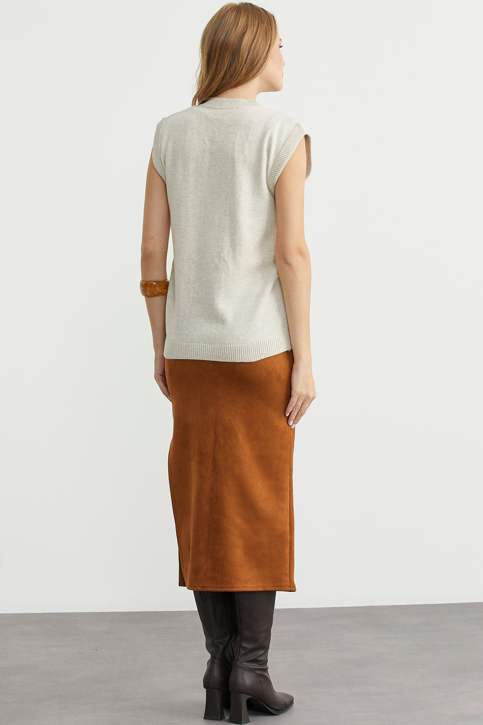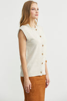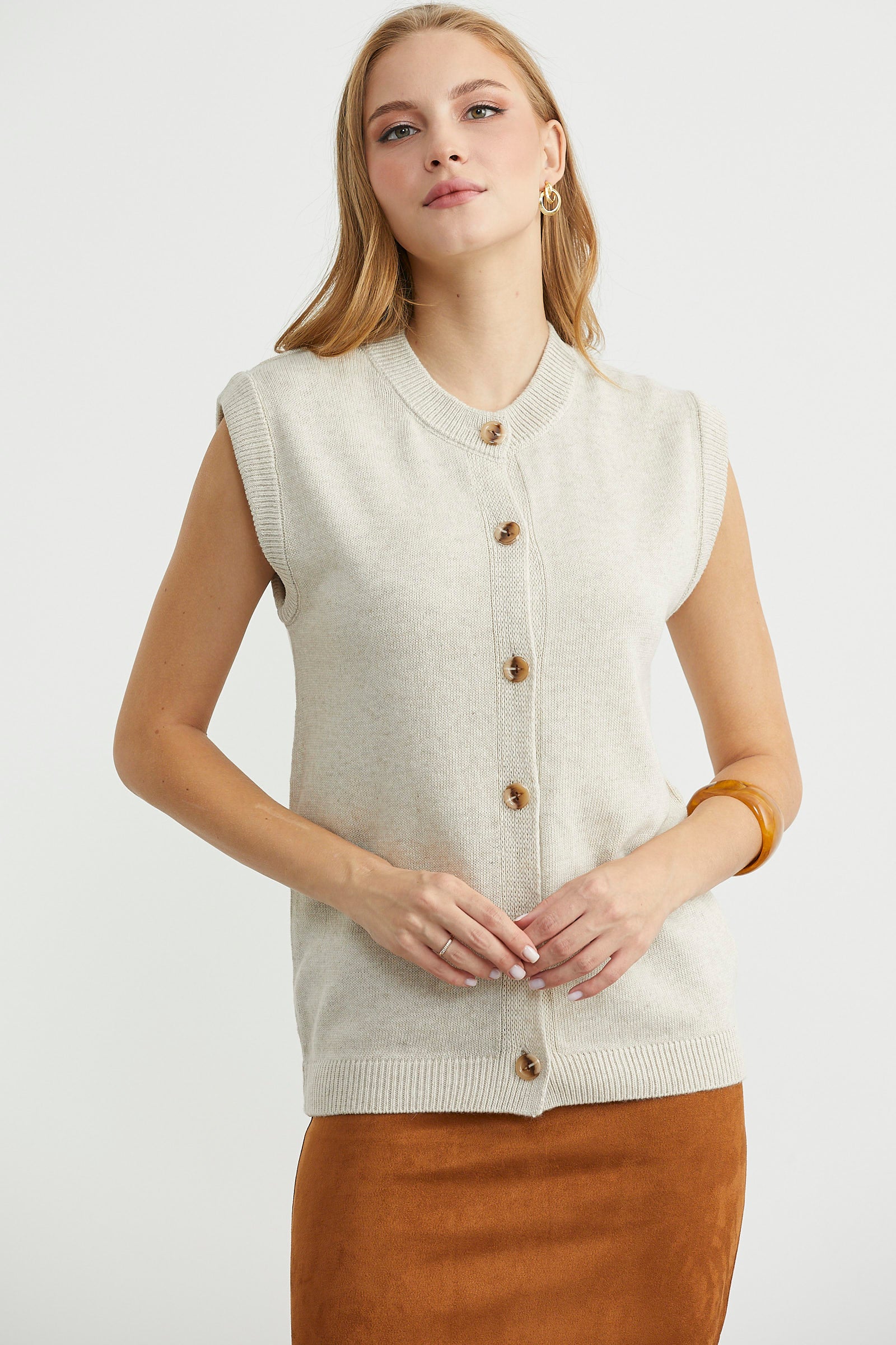 Düğme Kapamalı Yünlü Triko Yelek - Taş