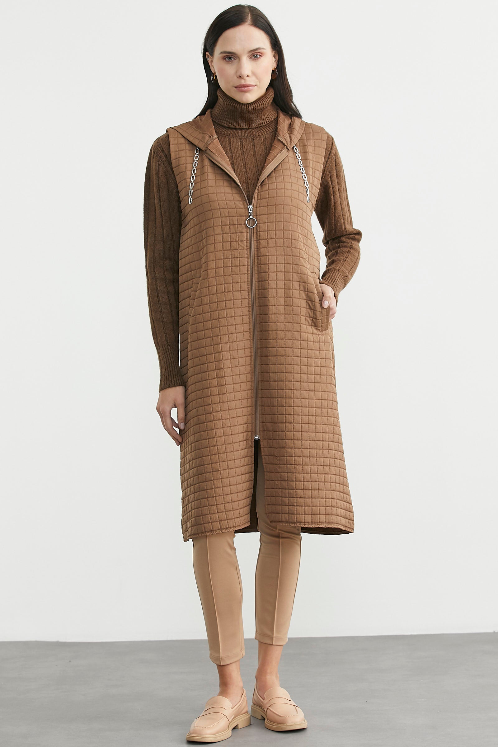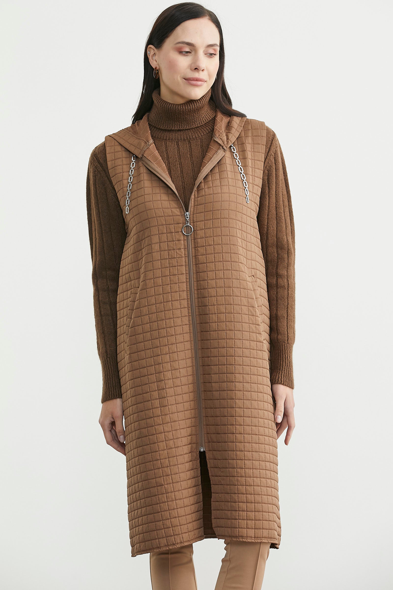 Kapitone, kapüşonlu, yakada zincir detaylı, astarsız, fermuar kapamalı yelek.