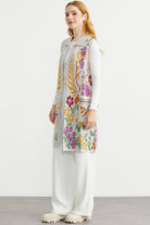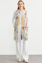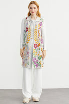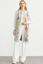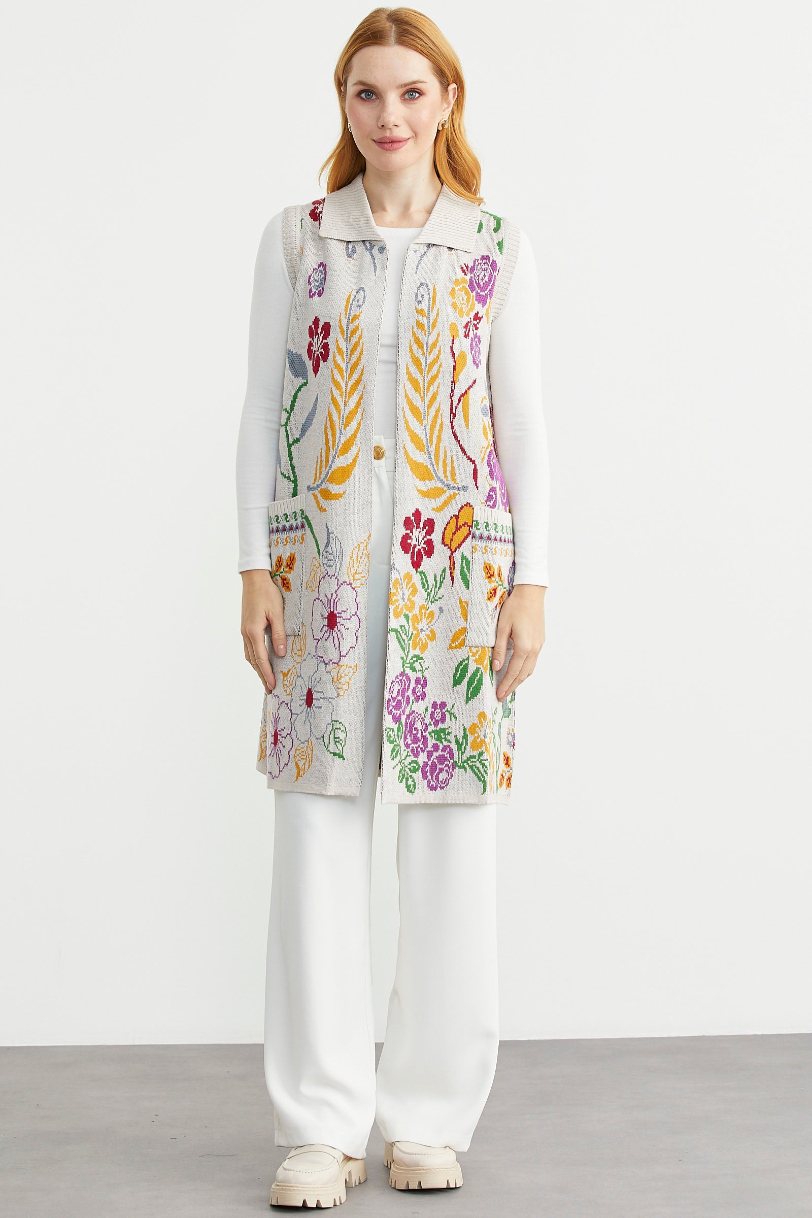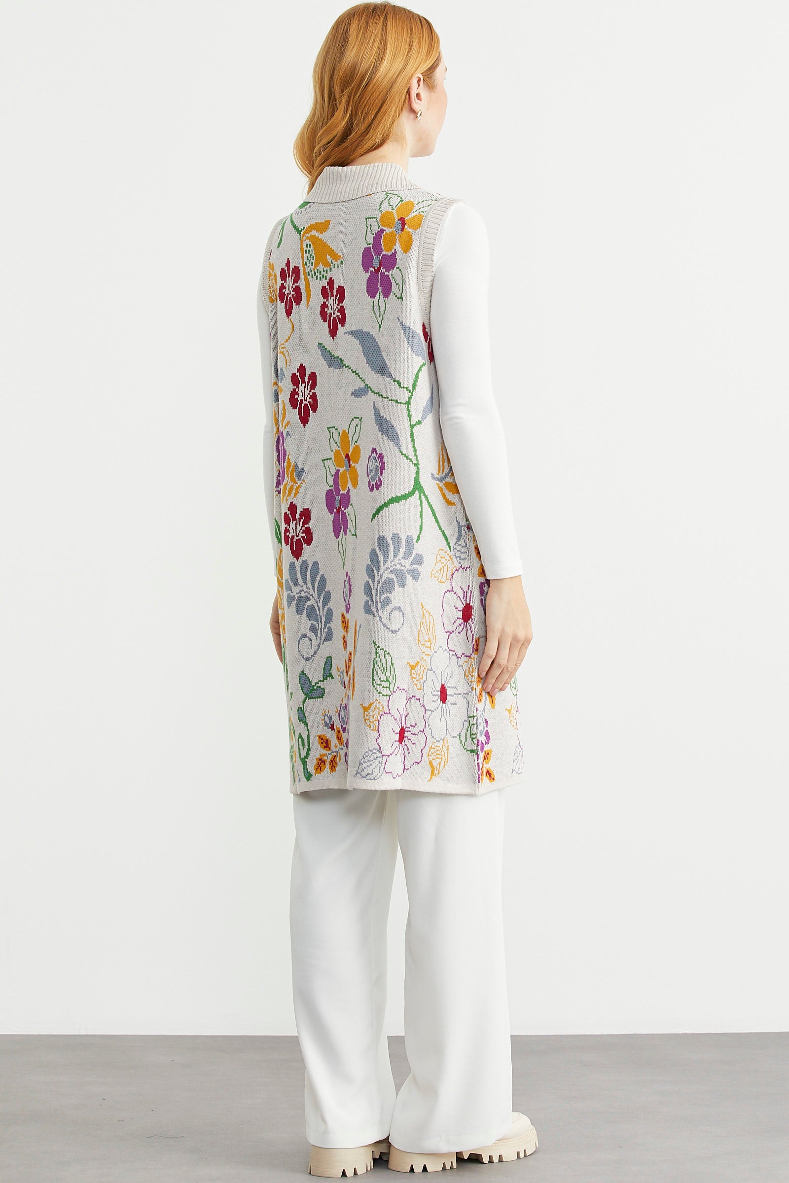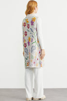 Renkli Çiçek Motifli Yünlü Uzun Triko Yelek - Bej