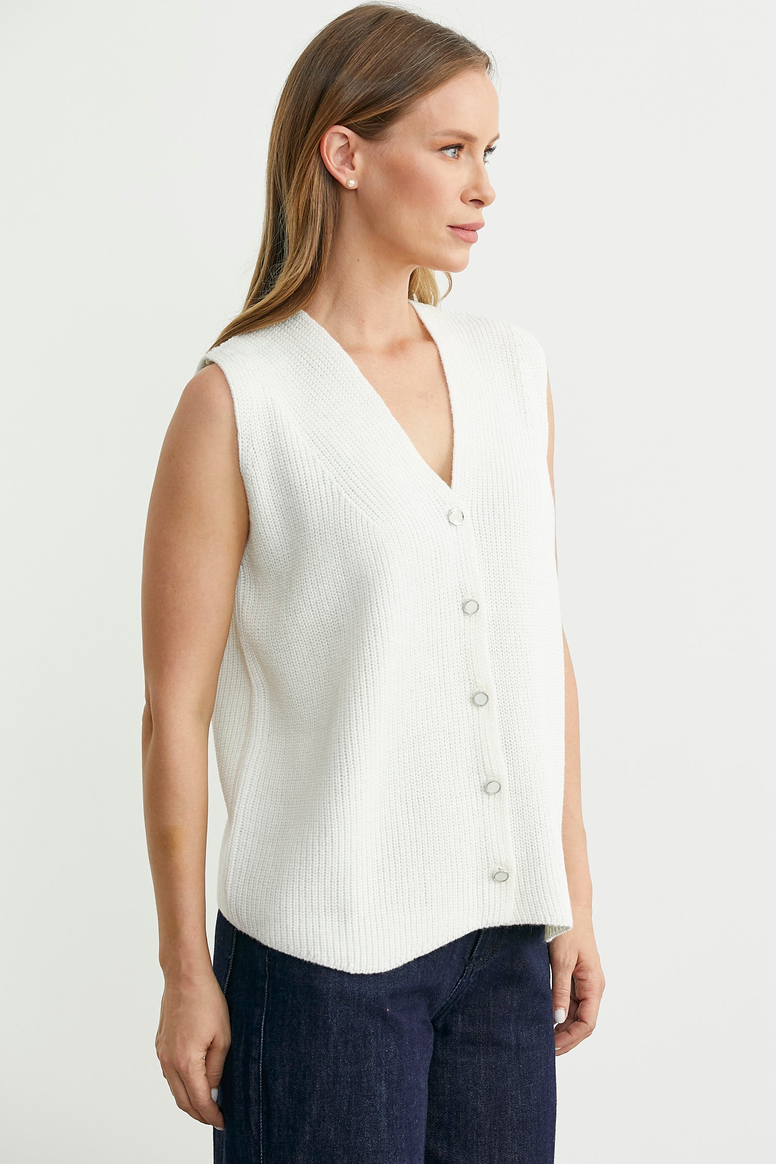 Yüksek oranda yün içeren, kolsuz triko yelek. Geniş kalıp, selanik örgü, düğme kapamalı.